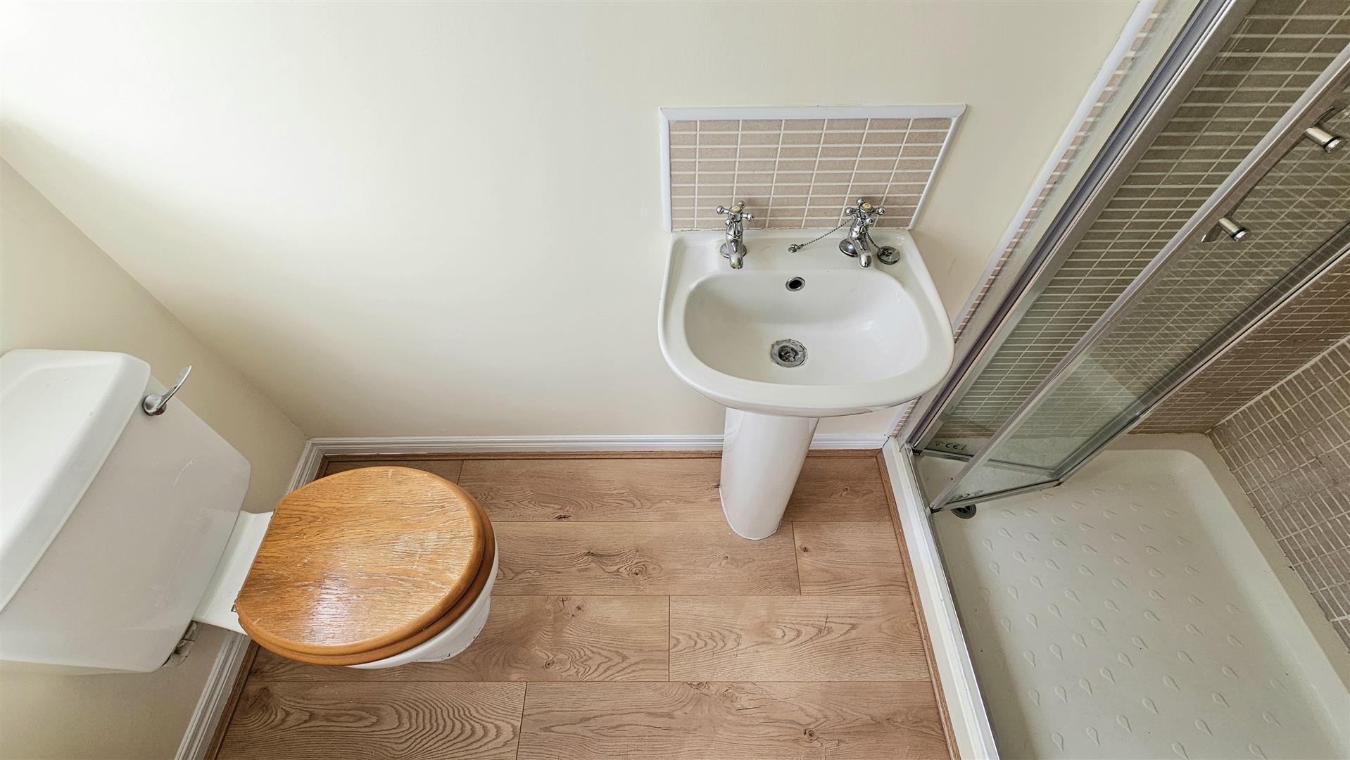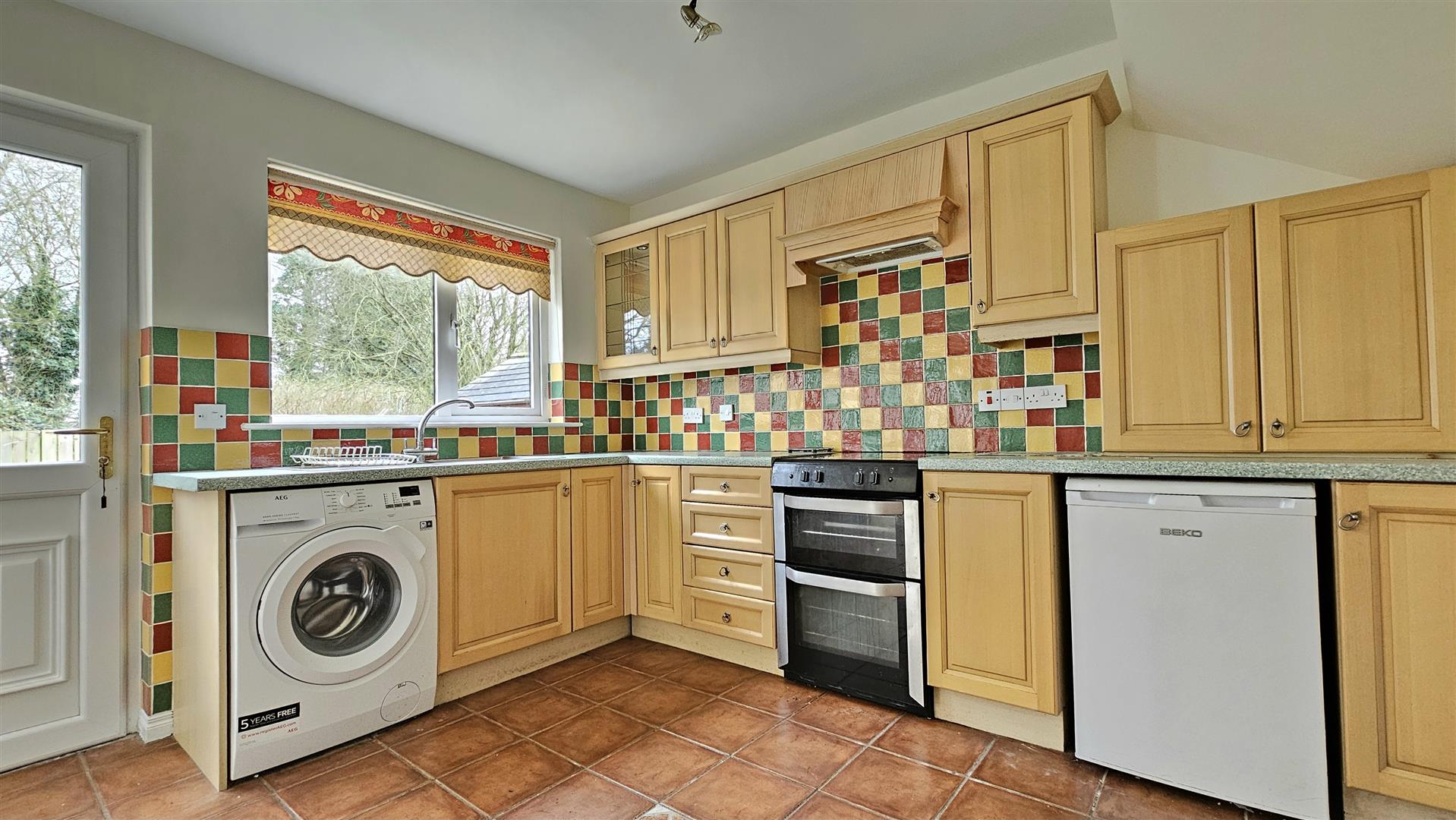 The accommodation comprises three bedrooms, with the master bedroom benefiting from an ensuite shower room, while the main bathroom is fitted with a white suite complemented by fully tiled walls and flooring. The lounge features a bay window and a fireplace and connects to a separate dining room which benefits from patio doors opening to the rear garden, creating a natural link between the interior living space and the outdoor area. The kitchen is fitted with an extensive range of Beech style units, while laminate wood flooring runs through the entrance hall, lounge and dining room, adding continuity to the main living areas.