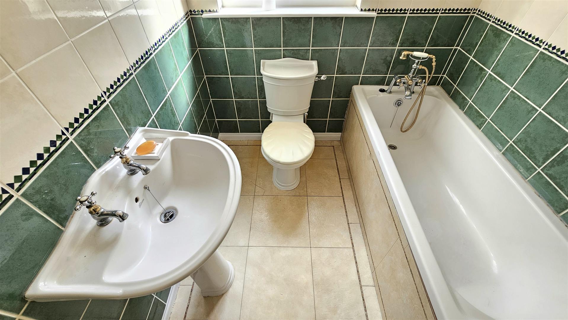 White bathroom suite with fully tiled walls and floor
