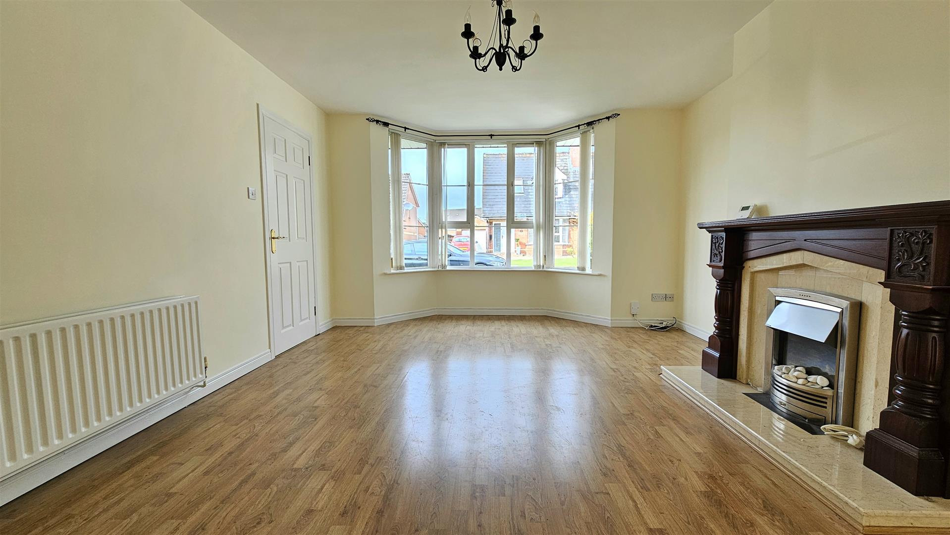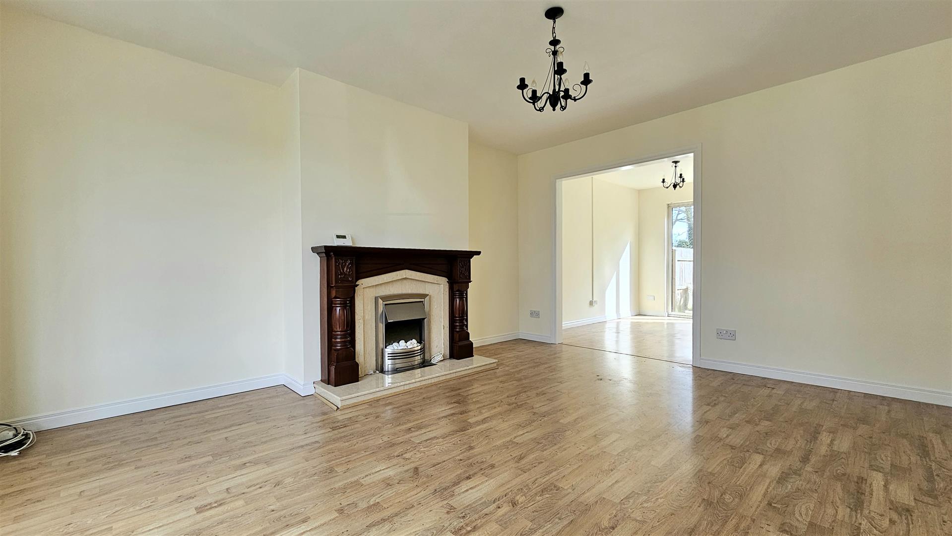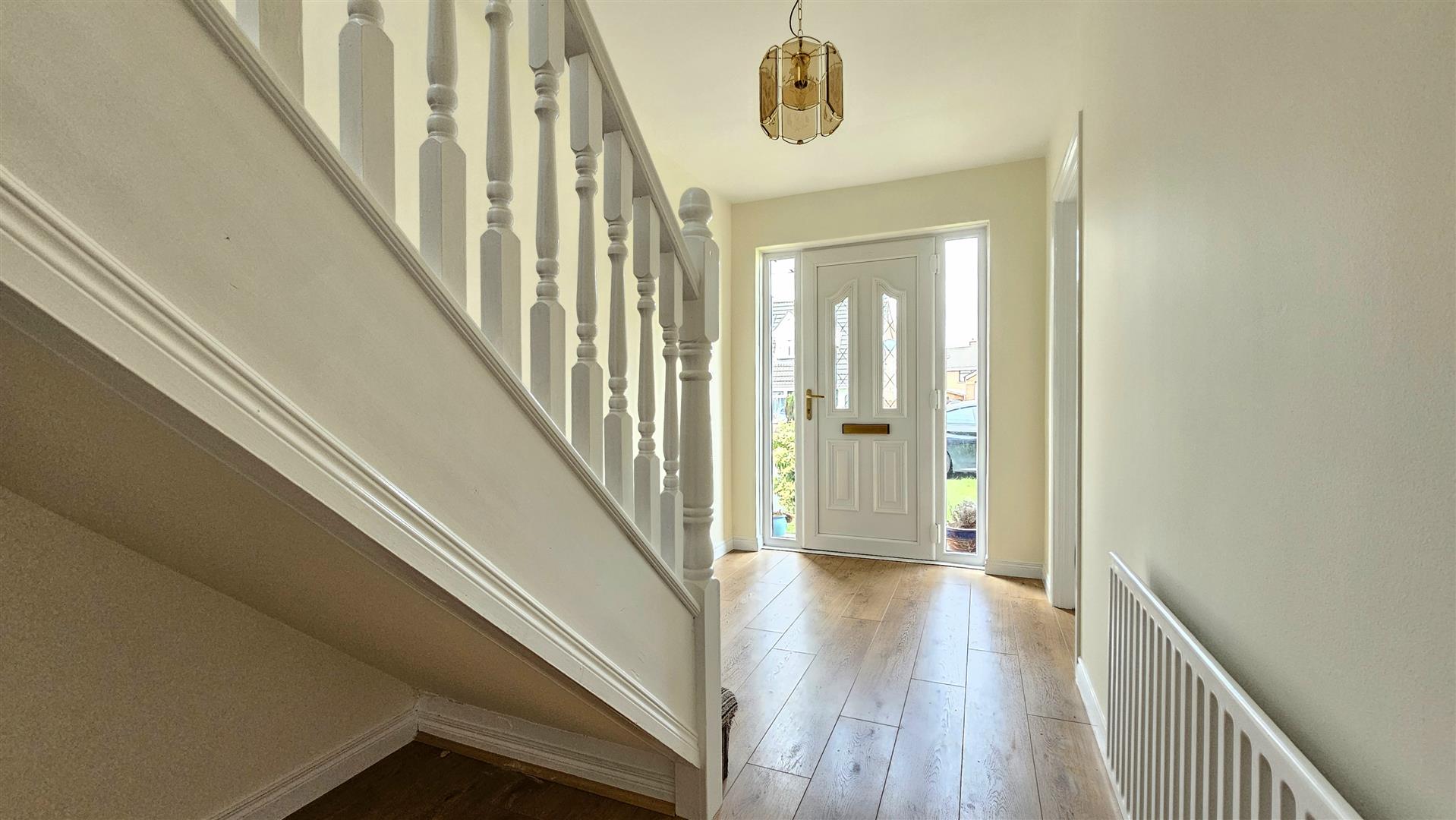 Laminate wood flooring through entrance hall, lounge and dining room