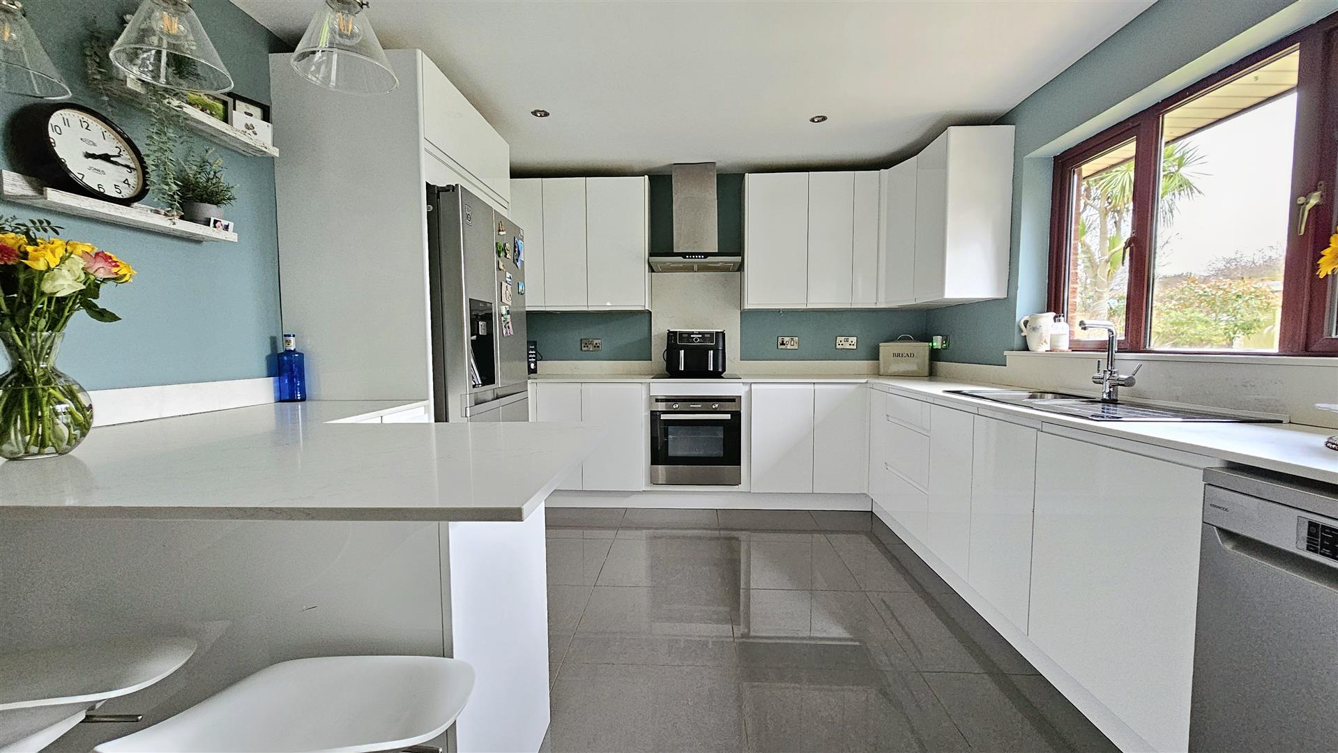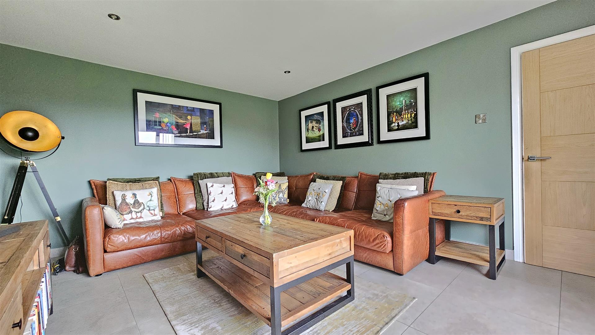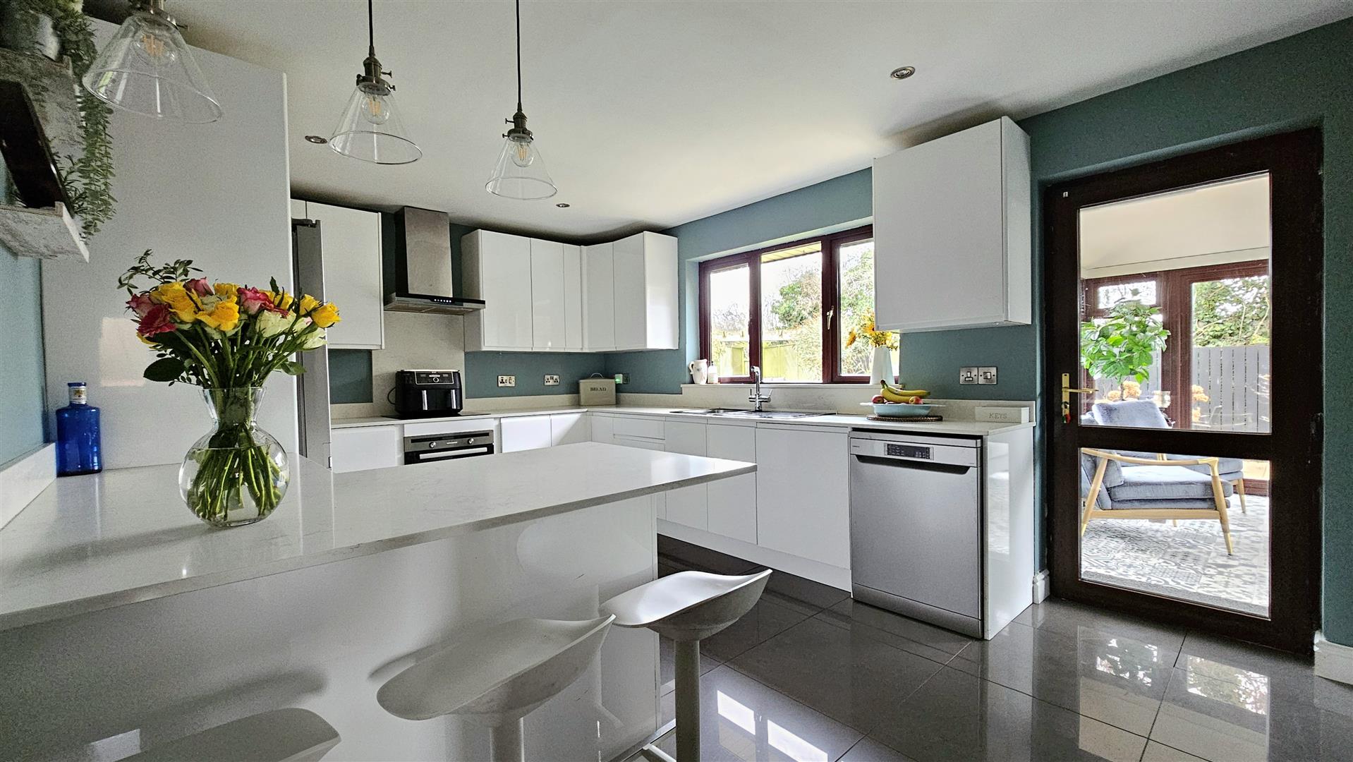 The 15'2 x 12'5 lounge is positioned to the front of the property, while the contemporary kitchen is located to the rear and fitted with white high gloss handleless units, quartz worktops and a breakfast bar, along with a built in oven, hob and extractor. The kitchen enjoys an outlook over the rear garden and opens into the adjoining sun room, where double doors provide direct access to the outside.
