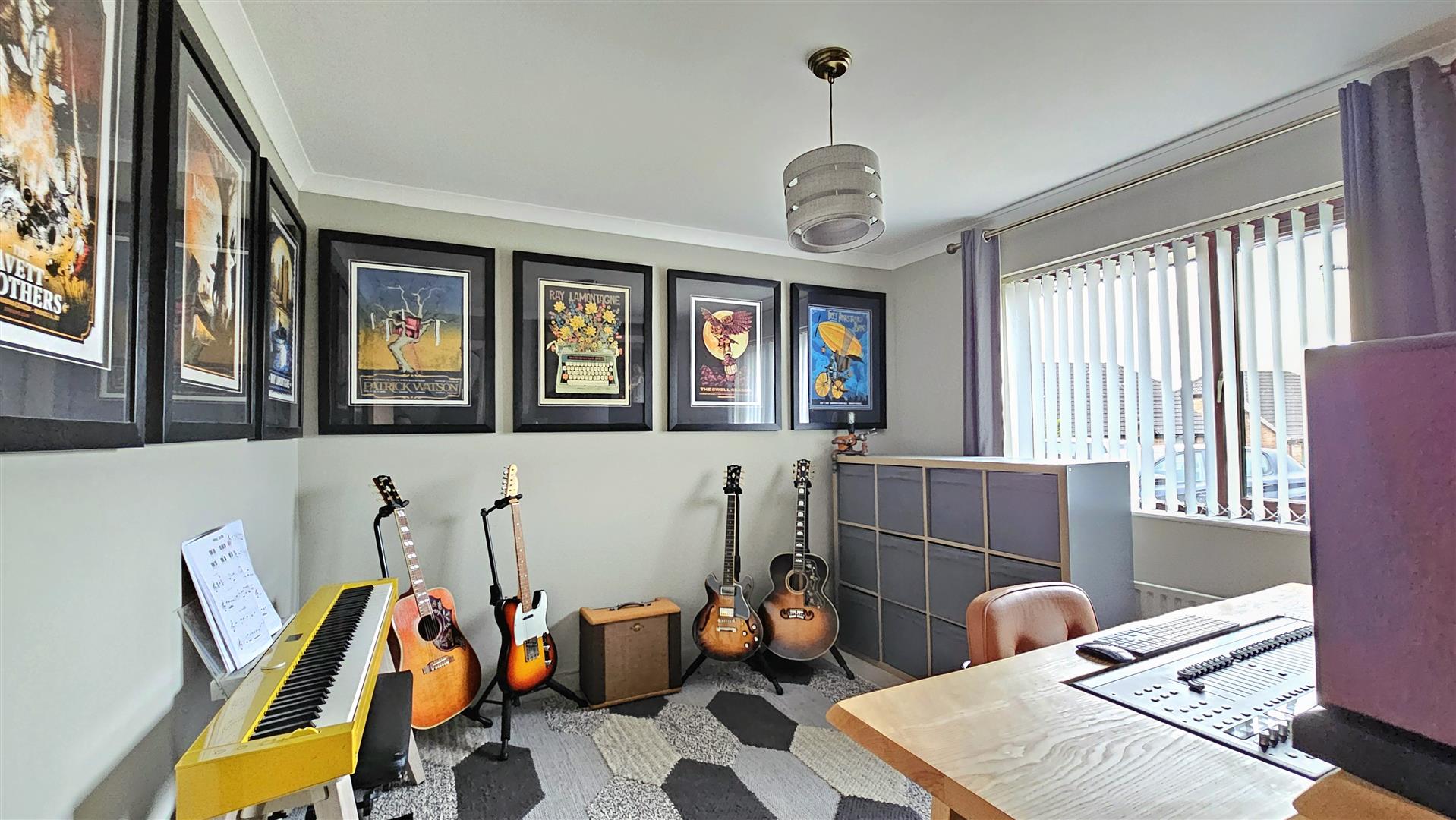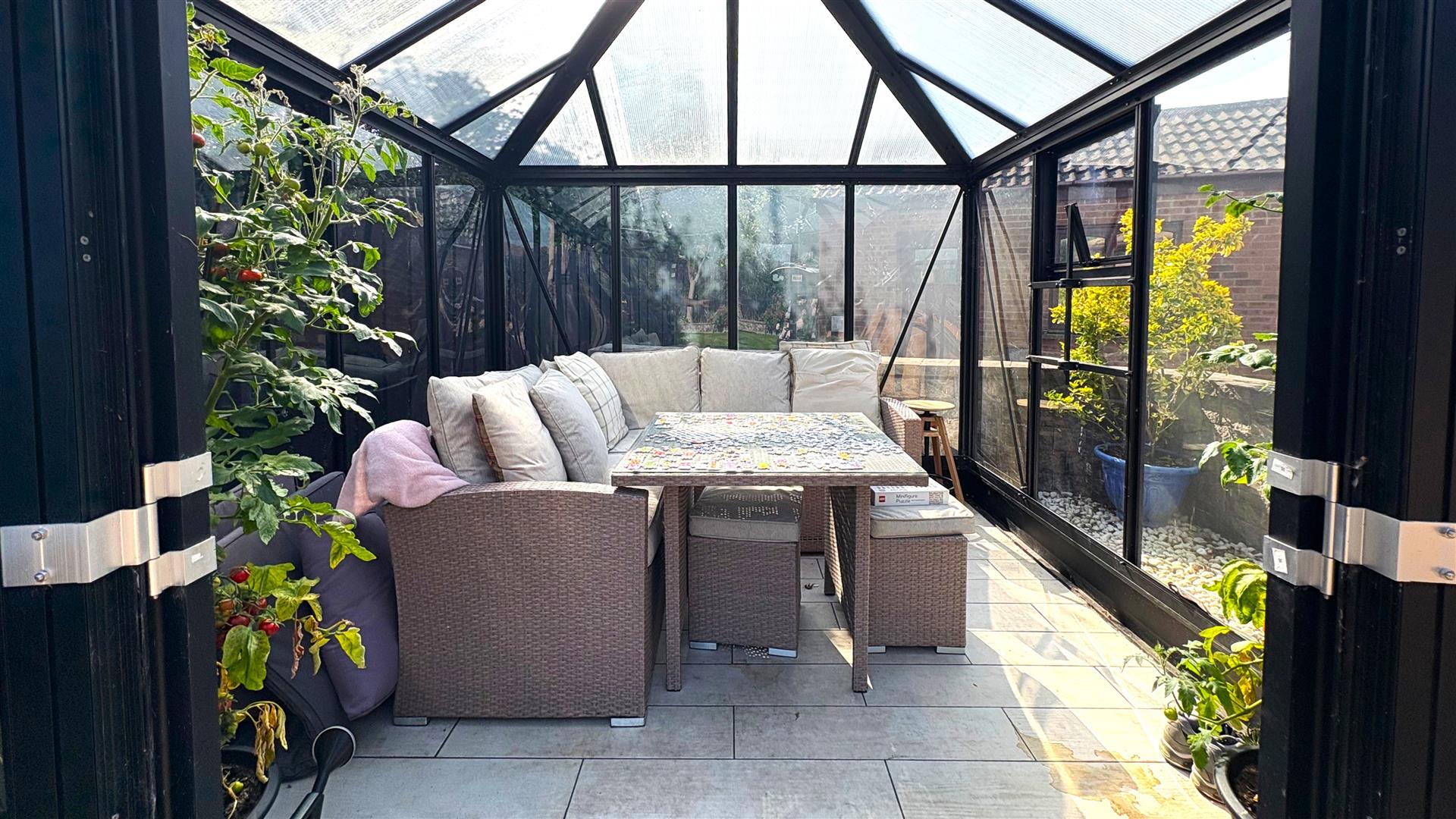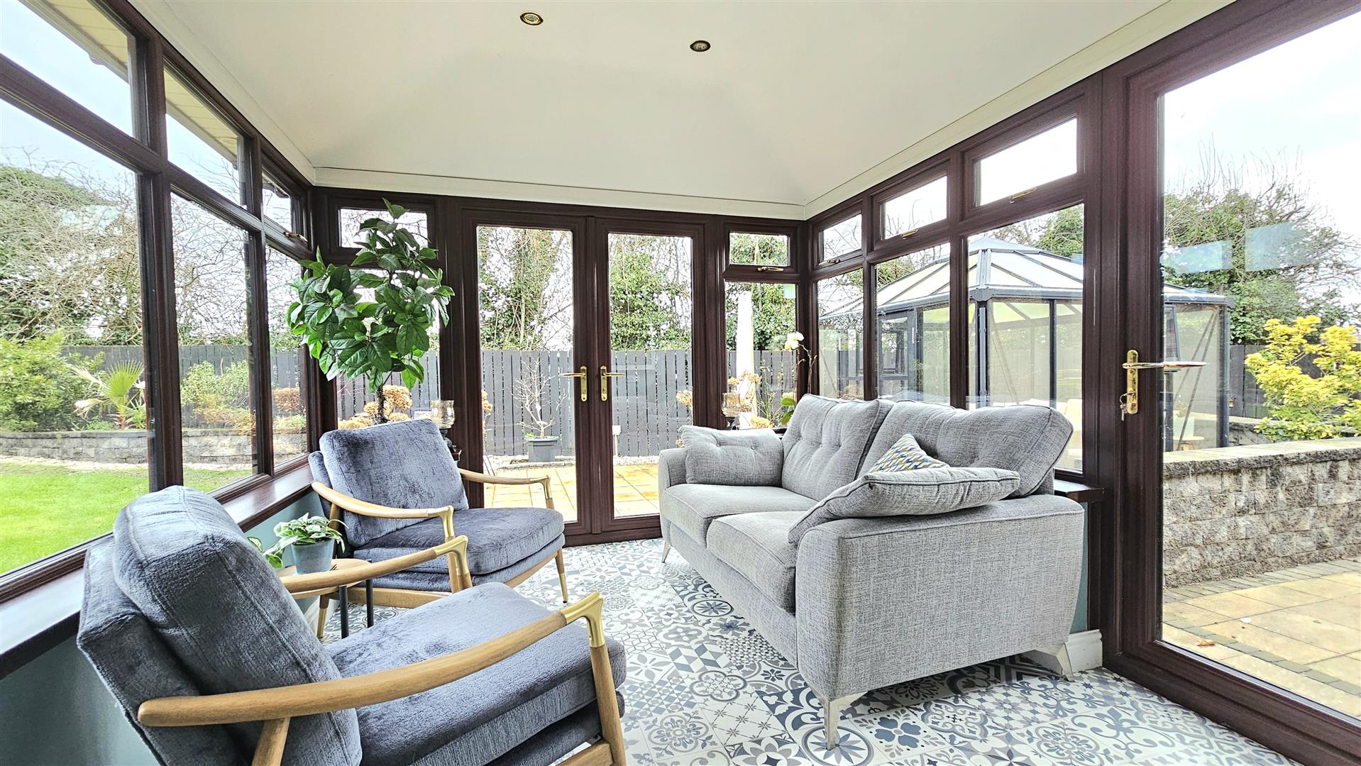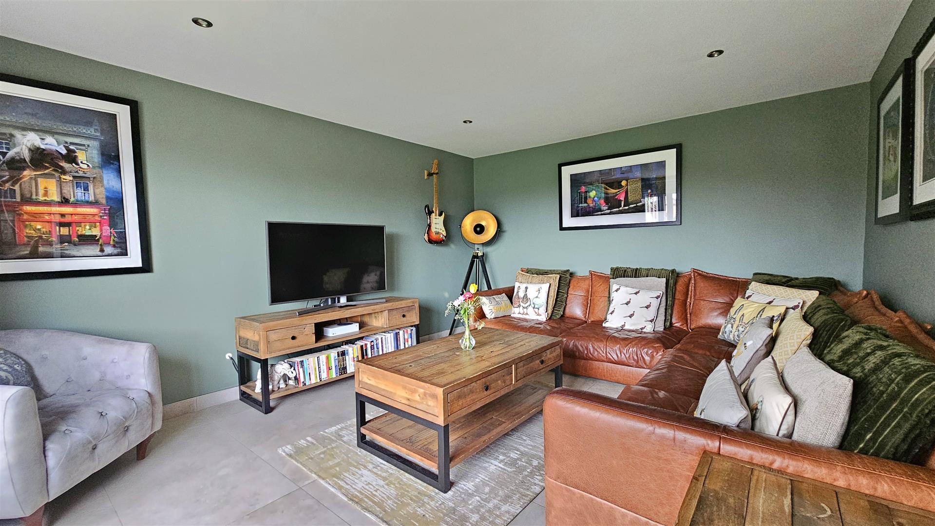 The 15'2 x 12'5 lounge is positioned to the front of the property, while the contemporary kitchen is located to the rear and fitted with white high gloss handleless units, quartz worktops and a breakfast bar, along with a built in oven, hob and extractor. The kitchen enjoys an outlook over the rear garden and opens into the adjoining sun room, where double doors provide direct access to the outside.