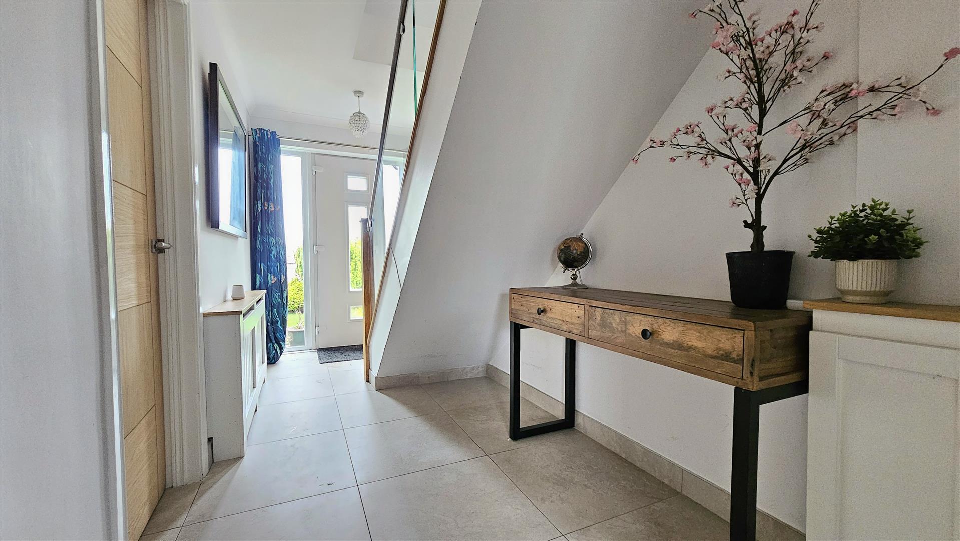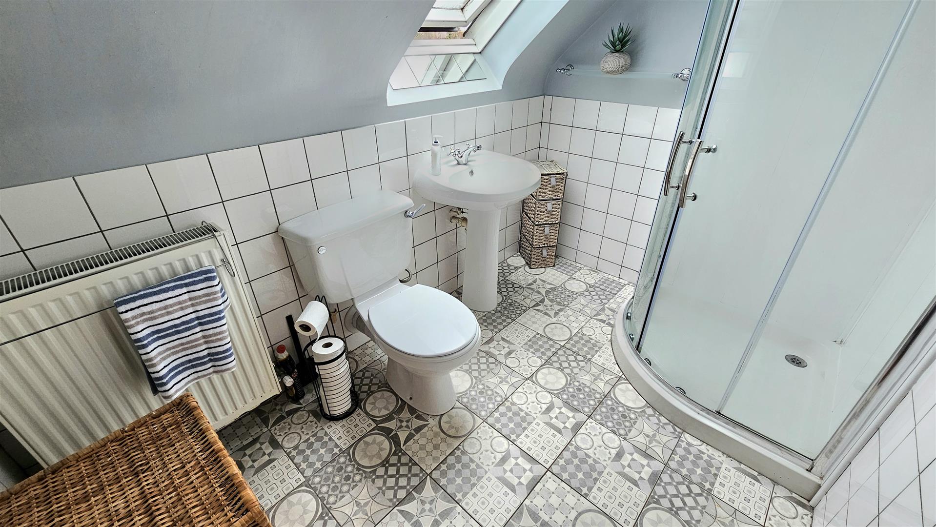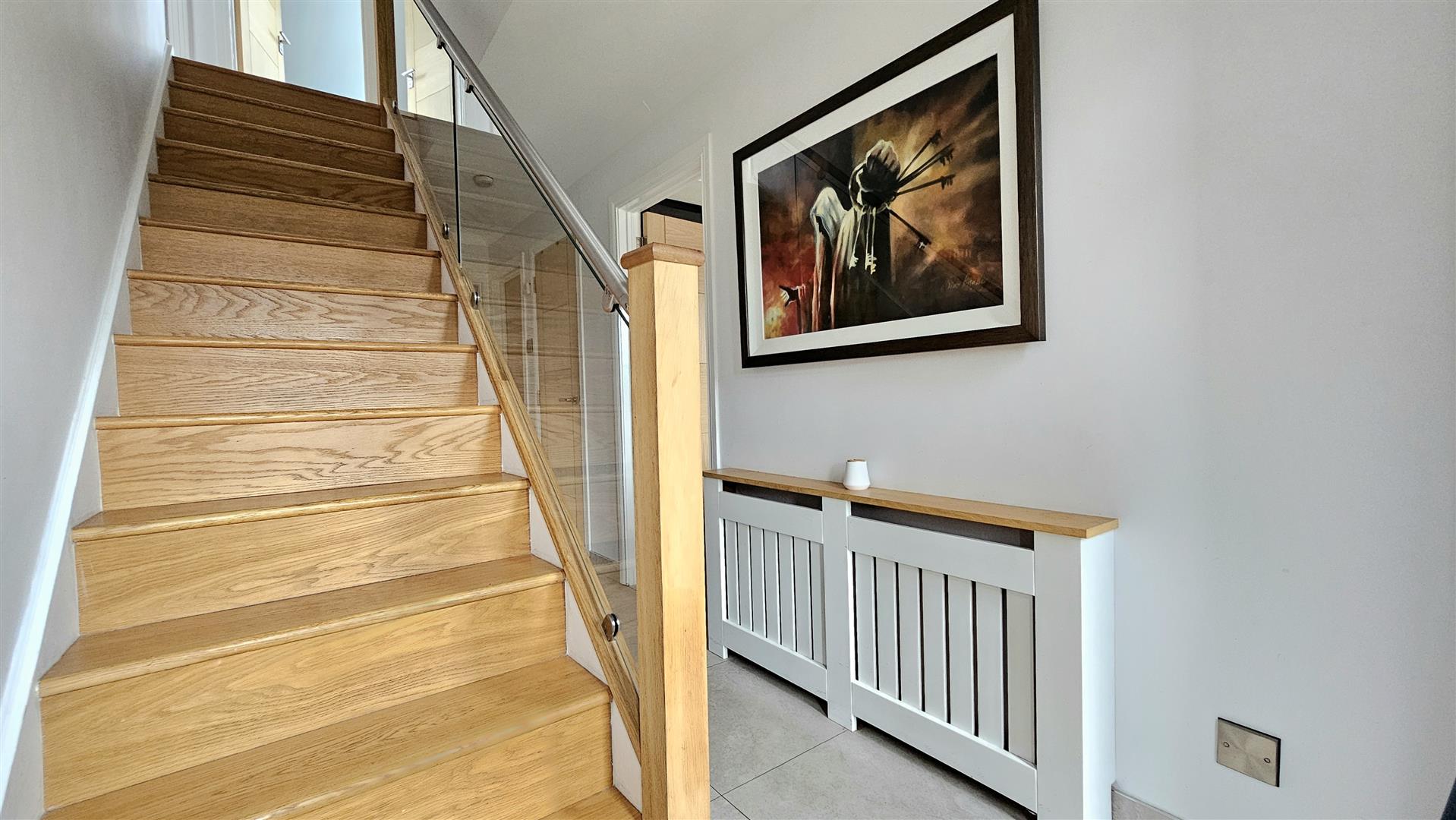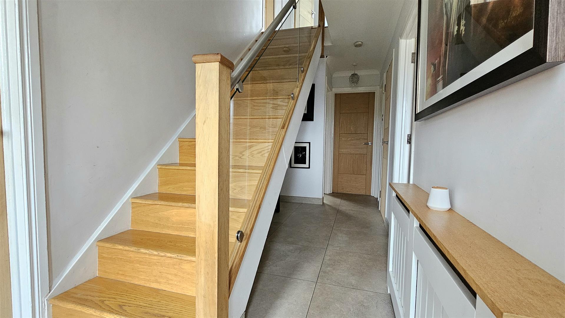 A ground floor bathroom incorporating a spa bath and full tiling is complemented by a separate first floor shower room with a white suite, and the overall presentation is further enhanced by matching floor tiling and a striking oak staircase with glass balustrade. The property also benefits from double glazing and an oil fired heating system.