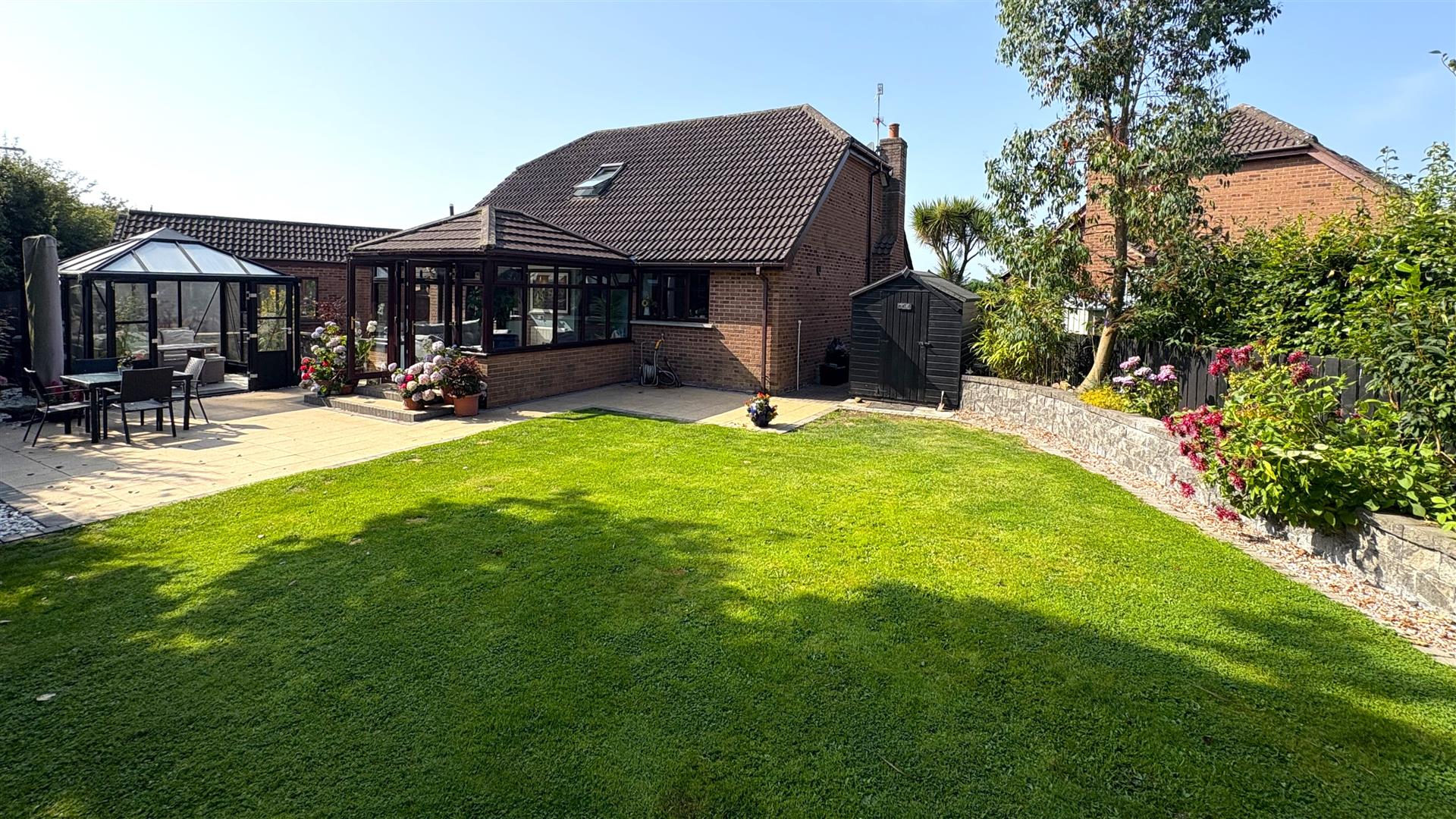 The landscaped rear garden offers a private mix of lawn and patio areas, while to the front there is generous parking on a block paved driveway with space for four cars and a matching detached garage.
