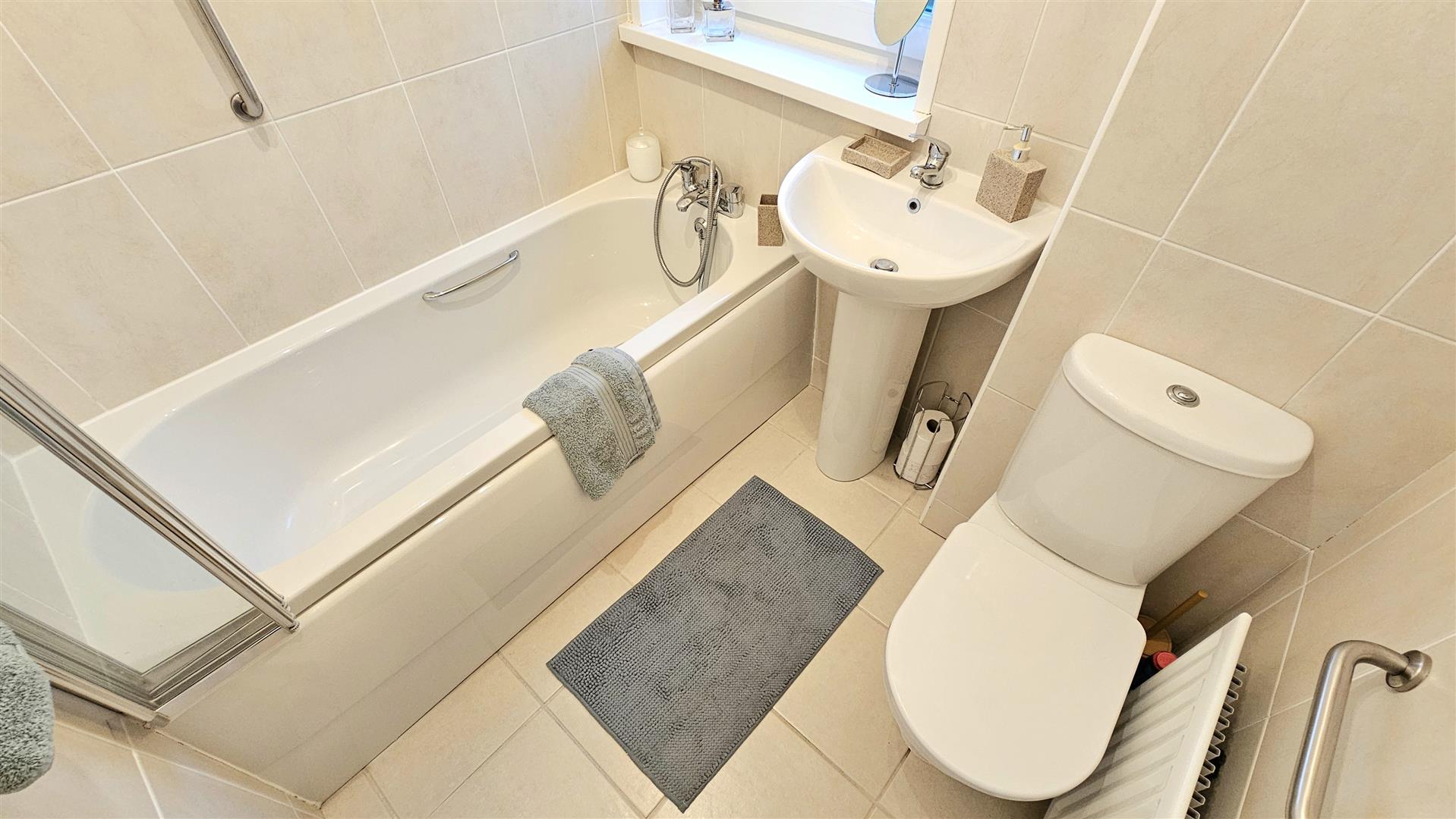 Double glazed window to rear aspect, white suite comprising low flush Wc, pedestal sink, enclosed bath with shower over, radiator, fully tiled walls & tiled floor