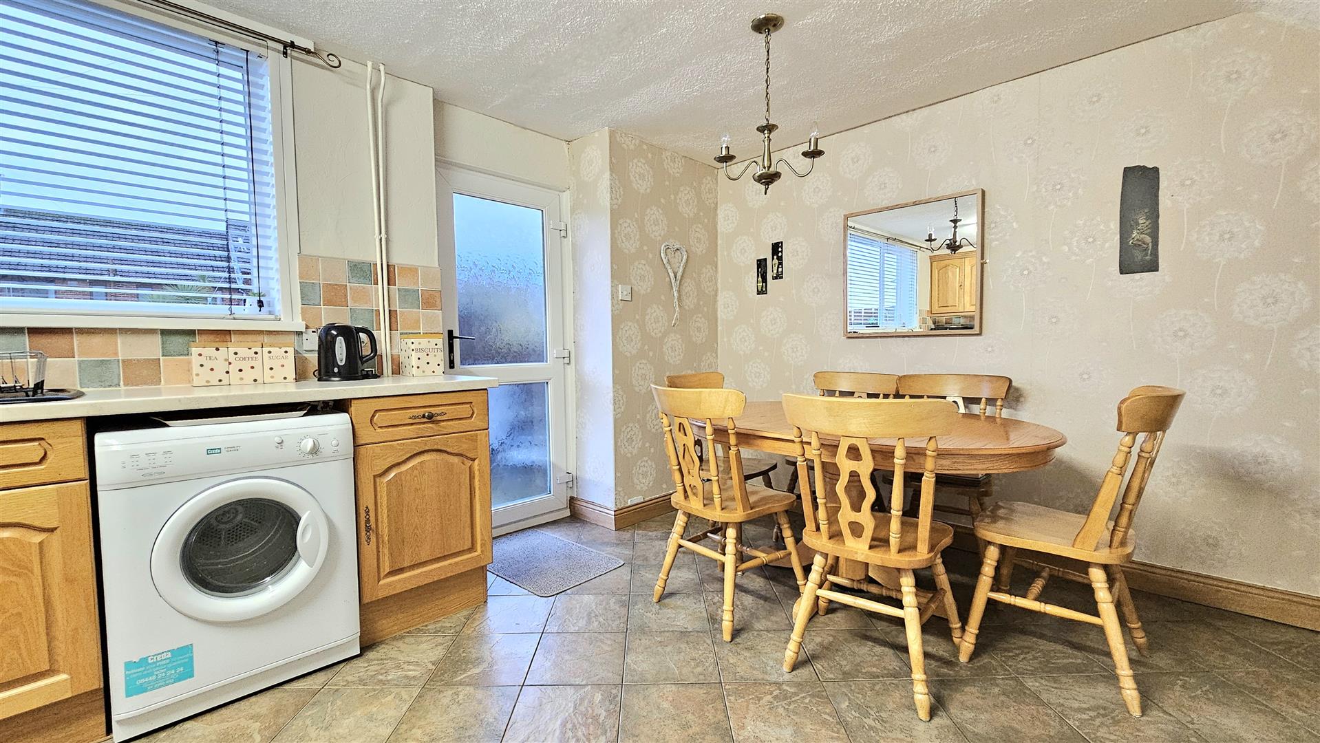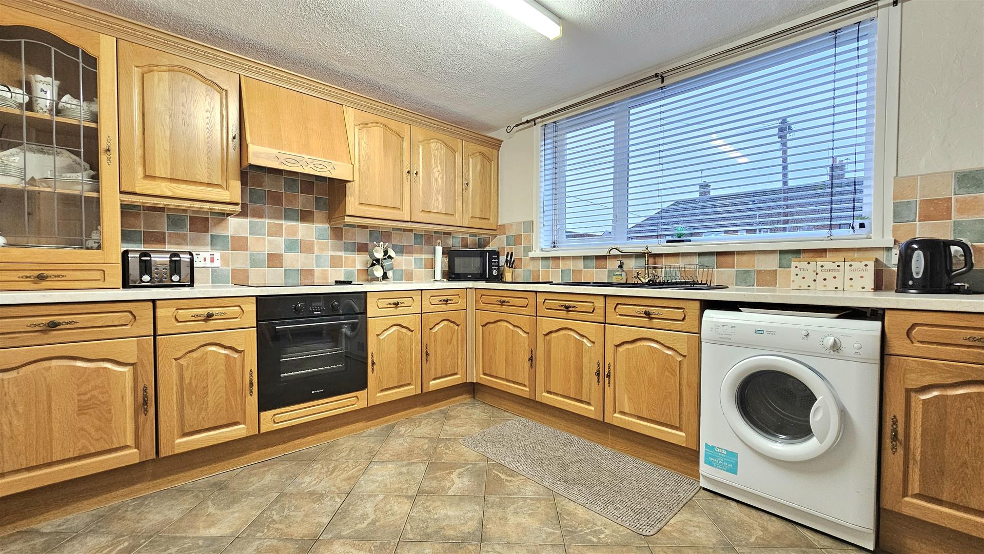 Double glazed window and door to rear aspect, range of oak style high & low level units with roll edge worktops, inset single sink & drainer with mixer tap over, built in over, 4 ring hob with concealed extractor fan over, integrated fridge & freezer, plumbed for washing machine, radiator, ceramic tied floor