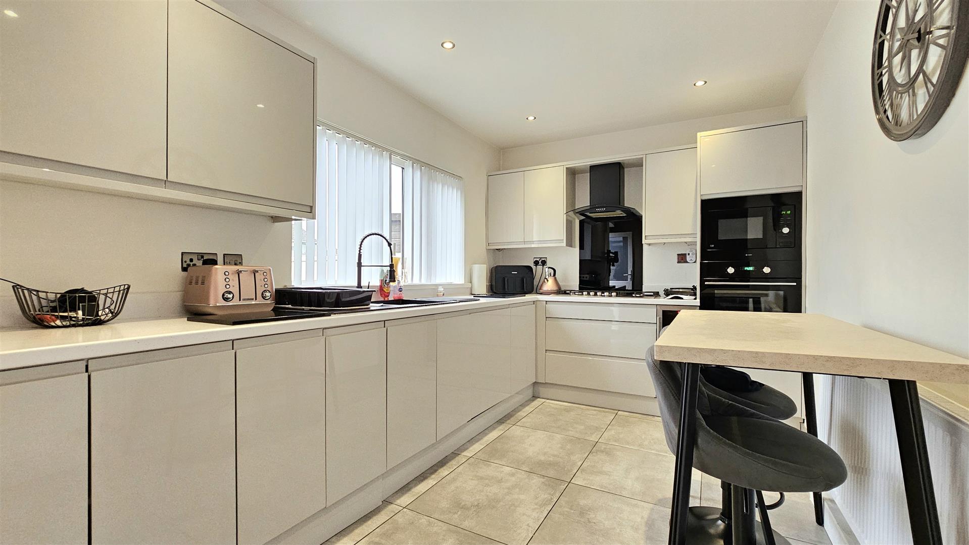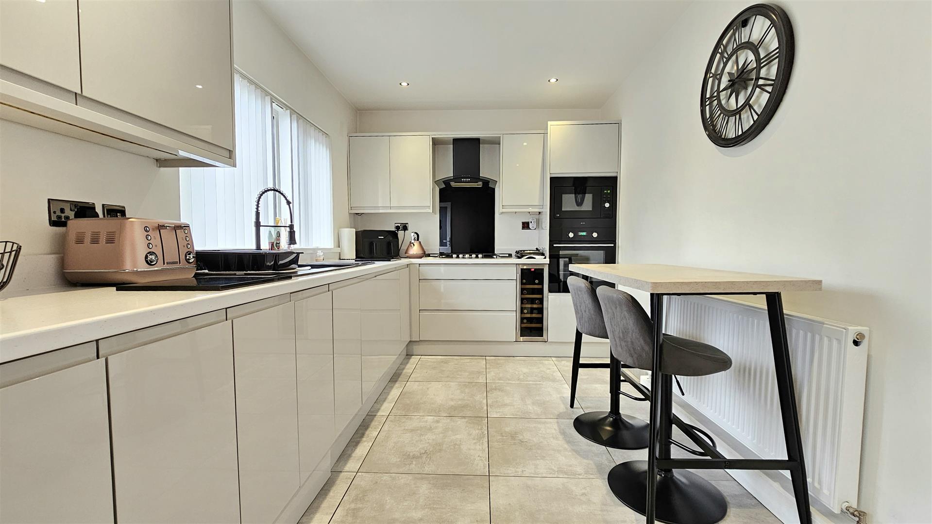 Double glazed window to rear aspect, double glazed door, extensive range of handleless high gloss, high and low level units incorporating 1.5 bowl sink and drainer with mixer tap over, built in oven, microwave, dishwasher and five ring gas hob with chimney style extractor over, integrated wine cooler, plumbed for washing machine, radiator, ceramic tiled floor