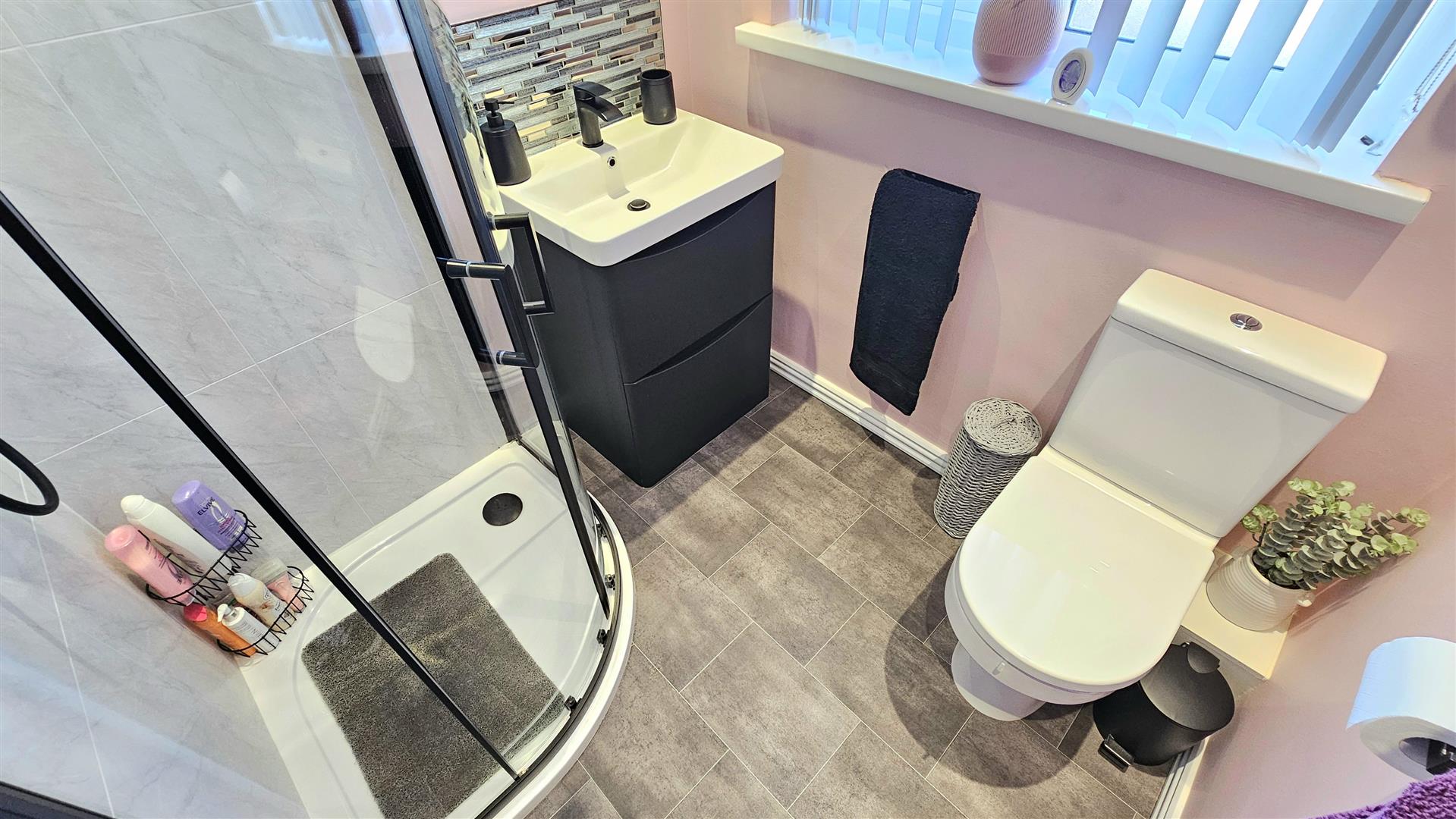 Double glazed window to rear aspect, white suite comprising low flush Wc, wash hand basin set on vanity unit, shower cubicle, radiator, fully tiled walls and floor