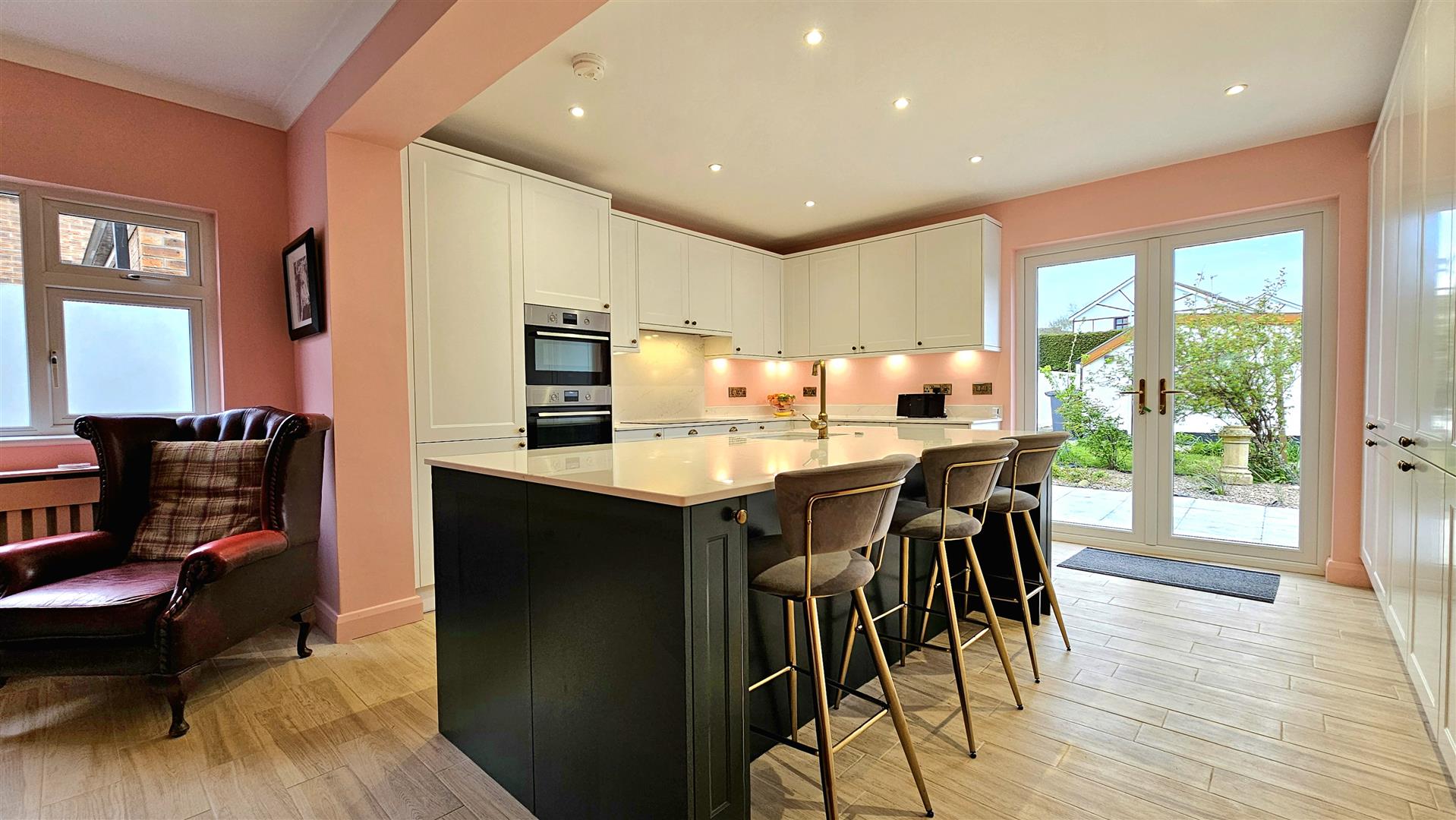 Kitchen boasts an extensive range of units with a breakfast bar and Silestone worktops & double doors to garden