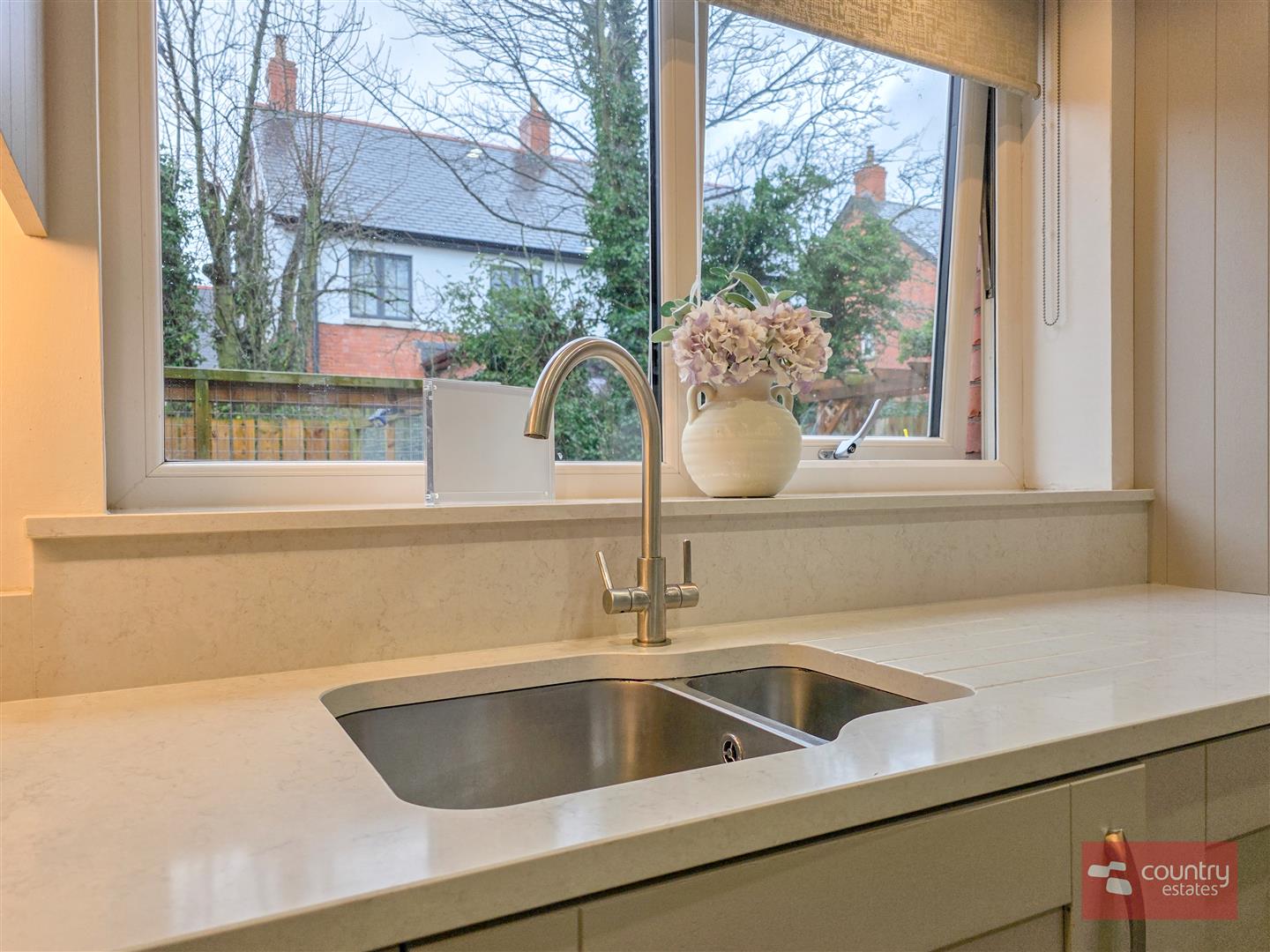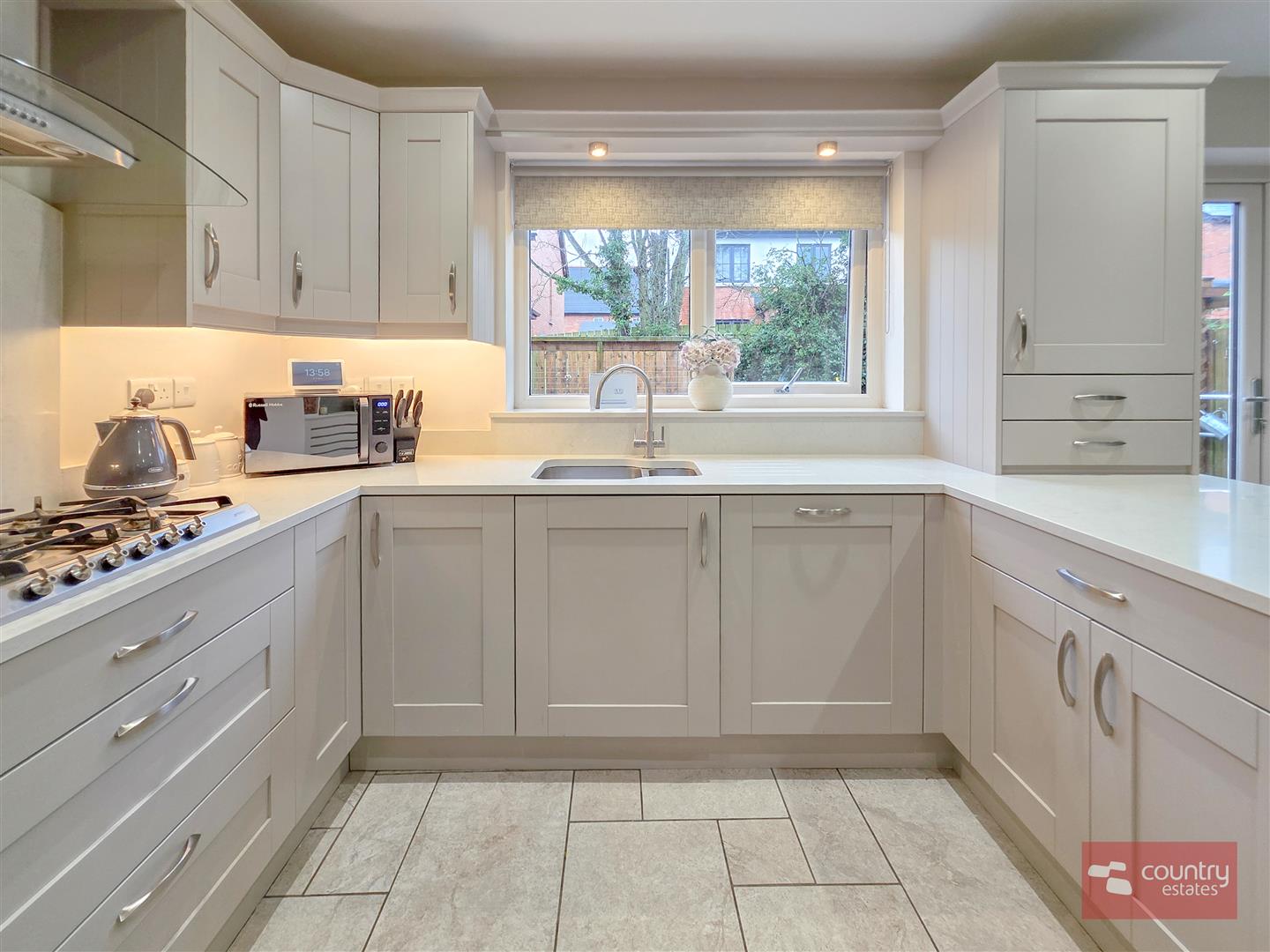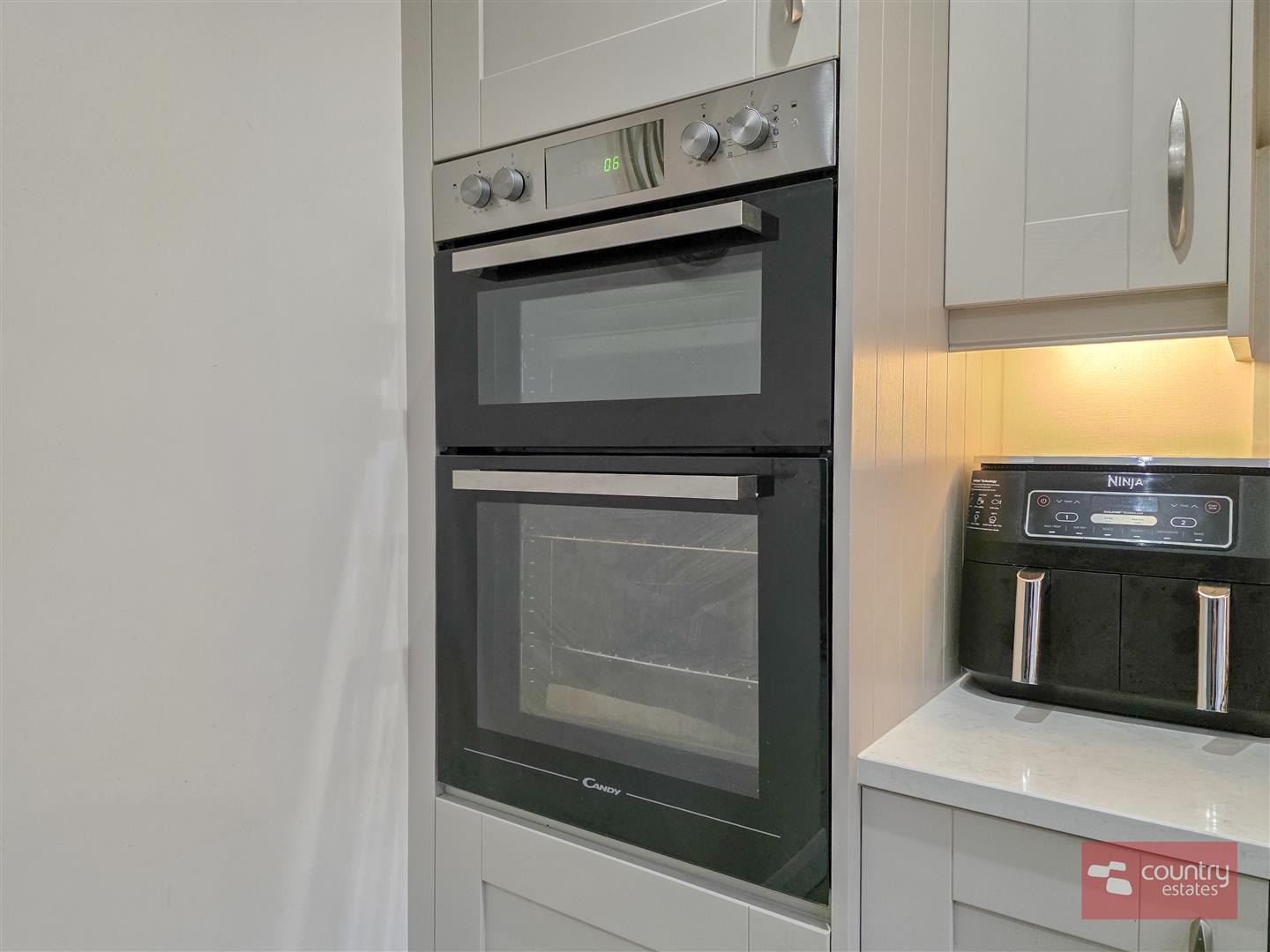 Equipped with a comprehensive range of high and low level shaker style fitted units and contrasting granite work surfaces and upstands. One and a half bowl stainless steel undermount sink unit with swan neck mixer tap. Integrated eye level ovens, separate five ring gas hob with overhead extractor housed in stainless steel chimney with glass hood, and a dishwasher. Breakfast bar style return. Recessed downlighting. Ample space for dining. PVC double glazed French doors to rear garden. Tiled floor.