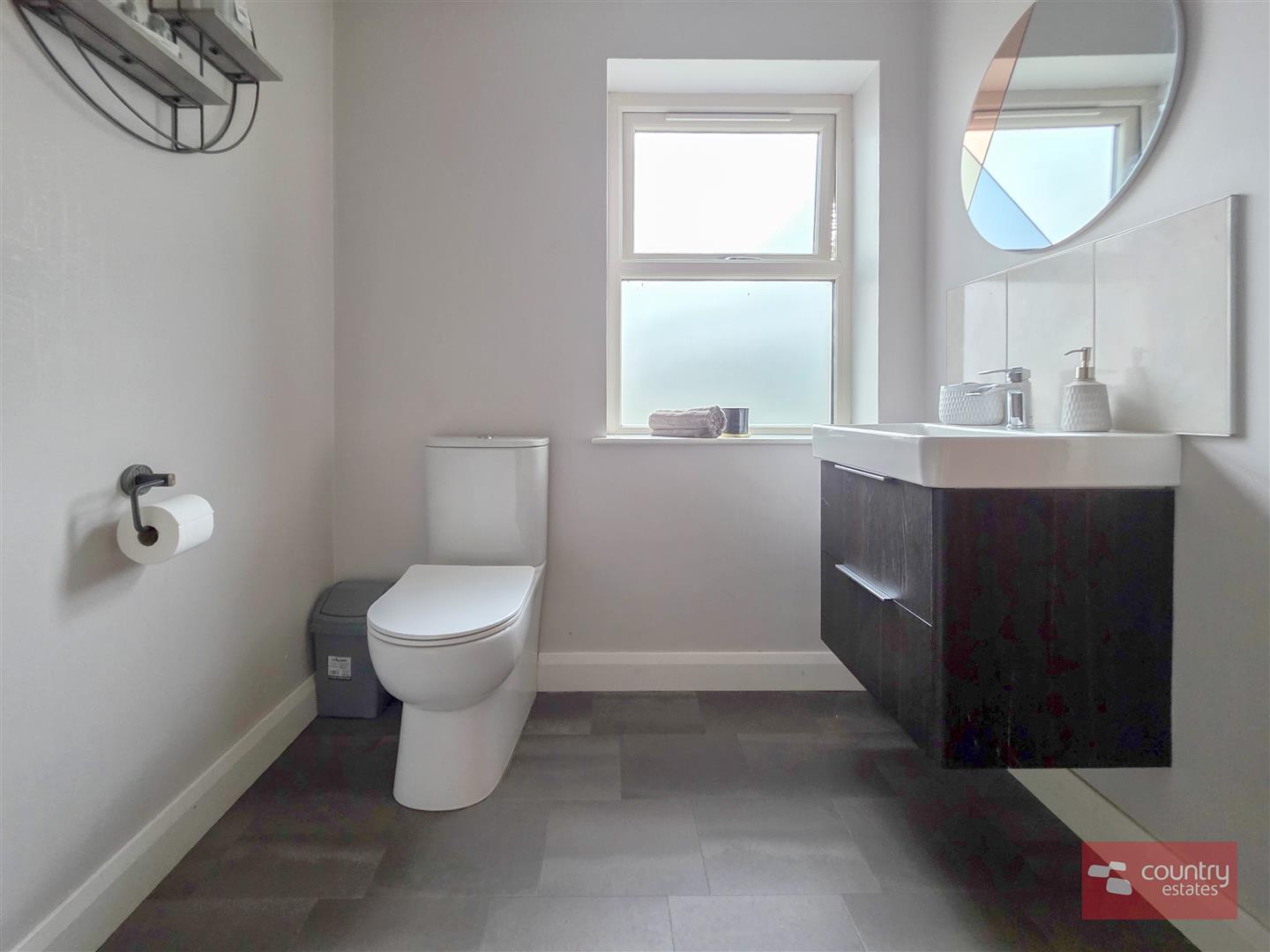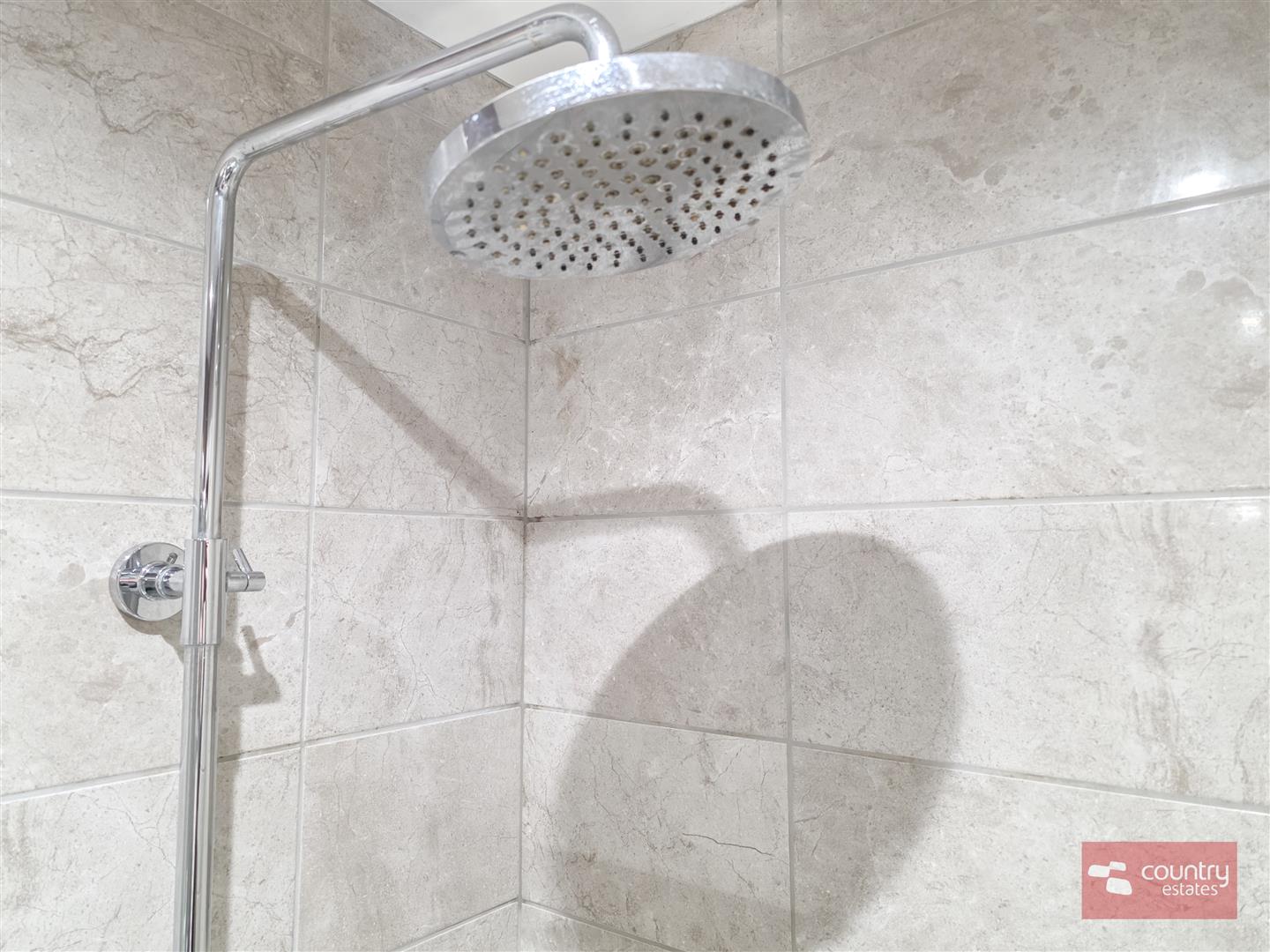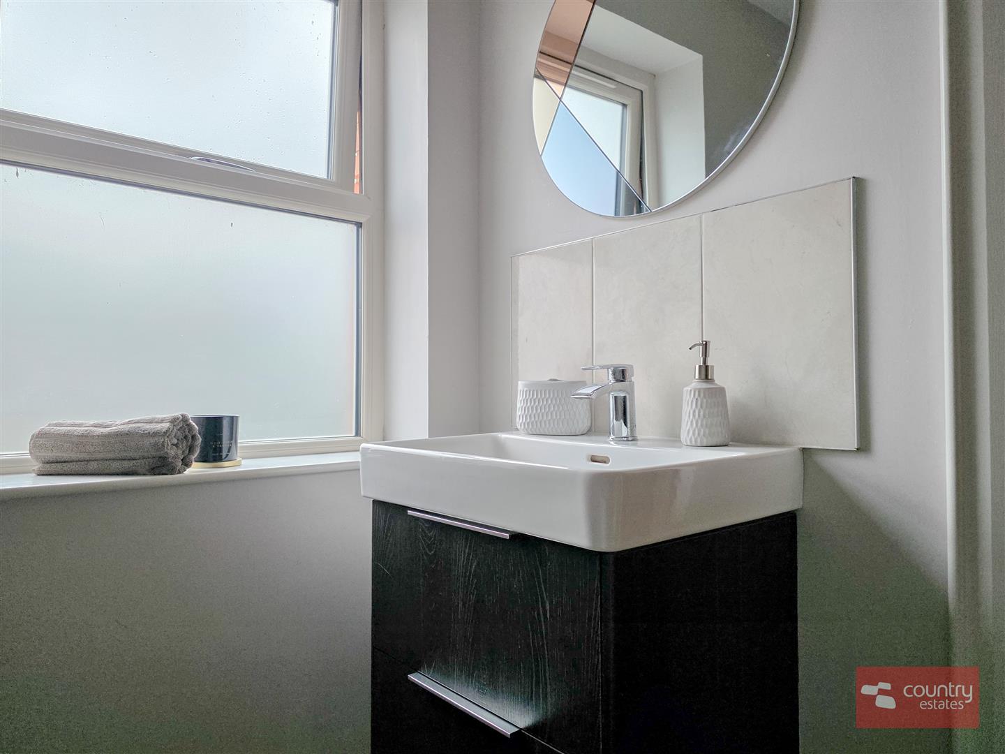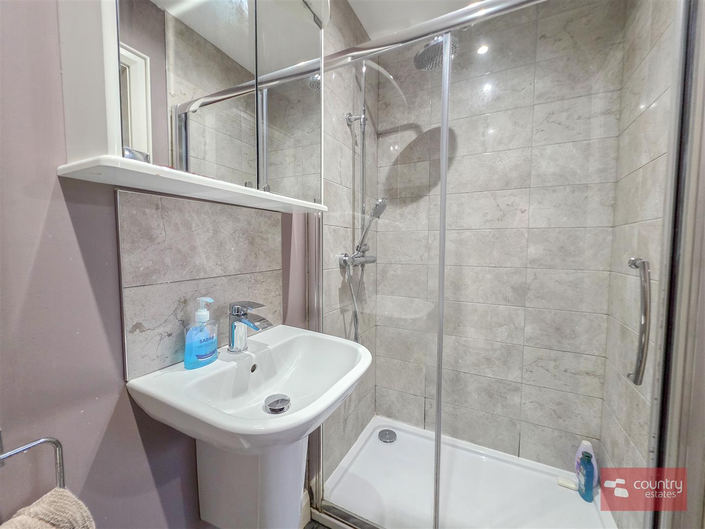 Comprising fully tiled shower cubicle with thermostatically controlled drench style shower and hand shower attachment, semi pedestal wash hand basin with monobloc tap and tiled splashback and a button flush WC. Recessed downlighting.