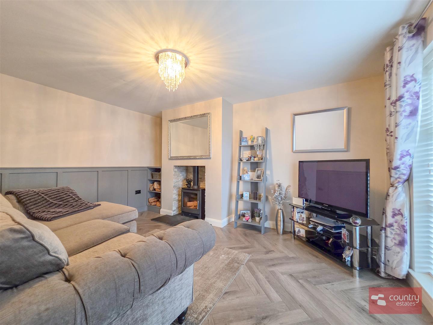 Attractive feature inglenook style fireplace with stone cladding. Cast iron wood burning stove. Picture style window. Quality Herringbone style laminate flooring.