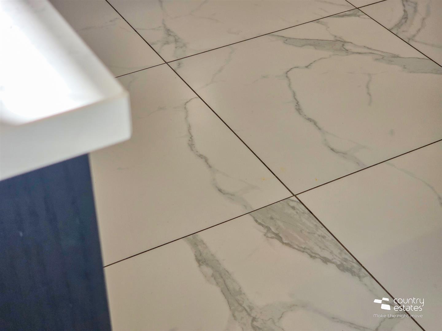 Equipped with matching high and low storage units and a contrasting work surface. Single drainer stainless steel sink unit with monobloc tap. Plumbed for washing machine. Space for tumble dryer. Marble effect ceramic floor tiling.