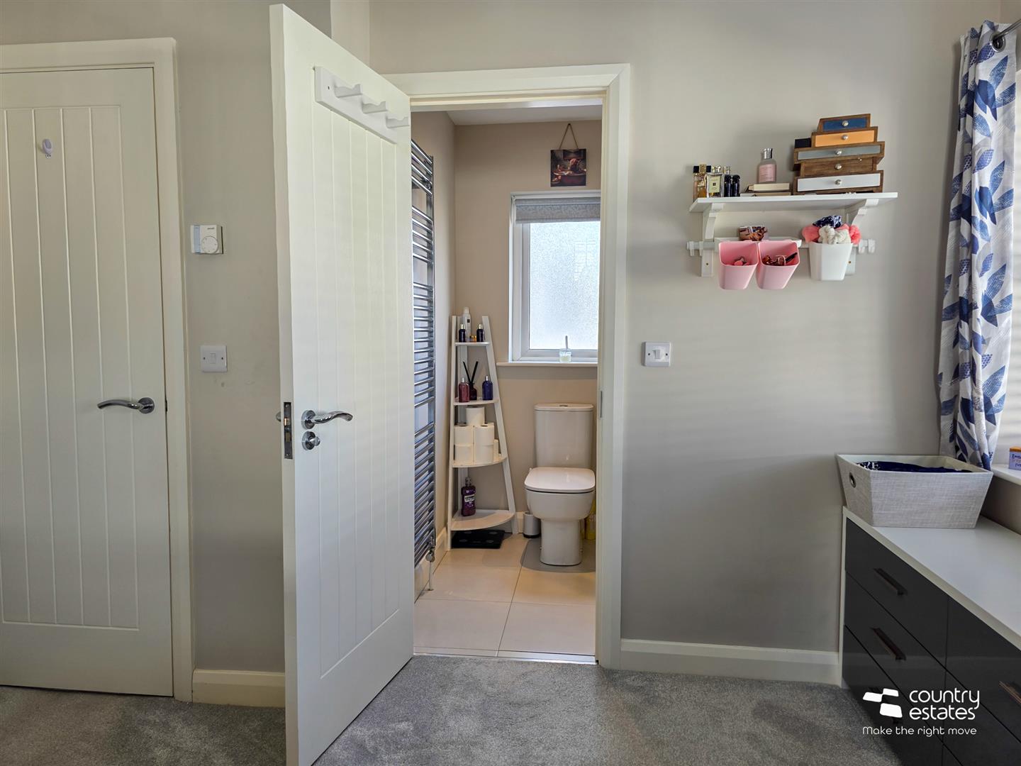 Comprising panel bath with three outlet concealed bath shower system with separate hand shower and rain shower, fixed shower screen with ceiling mounted drench style shower over bath, vanity unit with top mounted wash hand basin, monobloc tap and tiled splashback, and a button flush WC. Tiled floor. Recessed down lighting. Extra large chrome towel radiator.