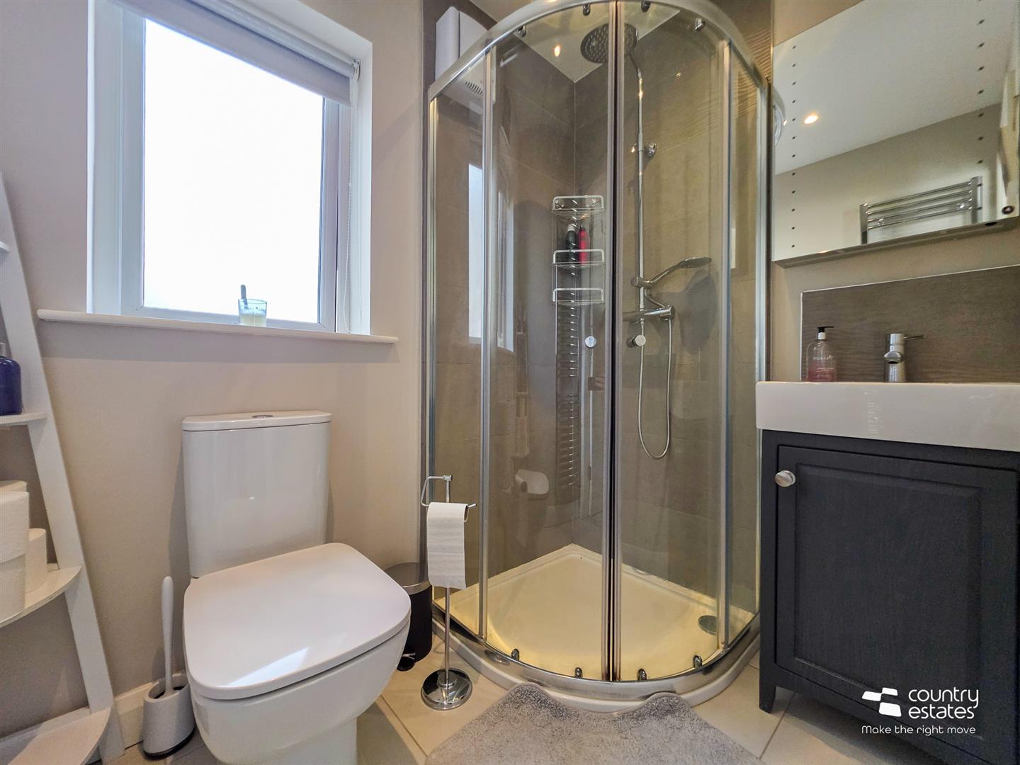 Comprising fully tiled shower cubicle with thermostatically controlled drench style shower and hand shower attachment, vanity unit with top mounted wash hand basin, monobloc tap and tiled splashback, and a button flush WC. Tiled floor. Recessed down lighting. Extra large chrome towel radiator.