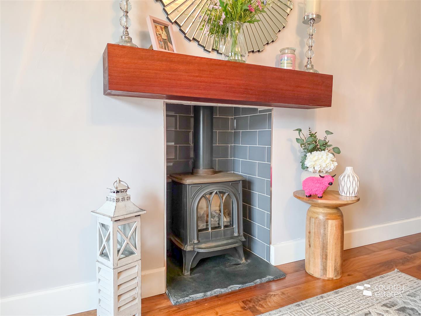 Attractive feature inglenook style fireplace with cast iron stove on a slate hearth. Hard wood flooring.