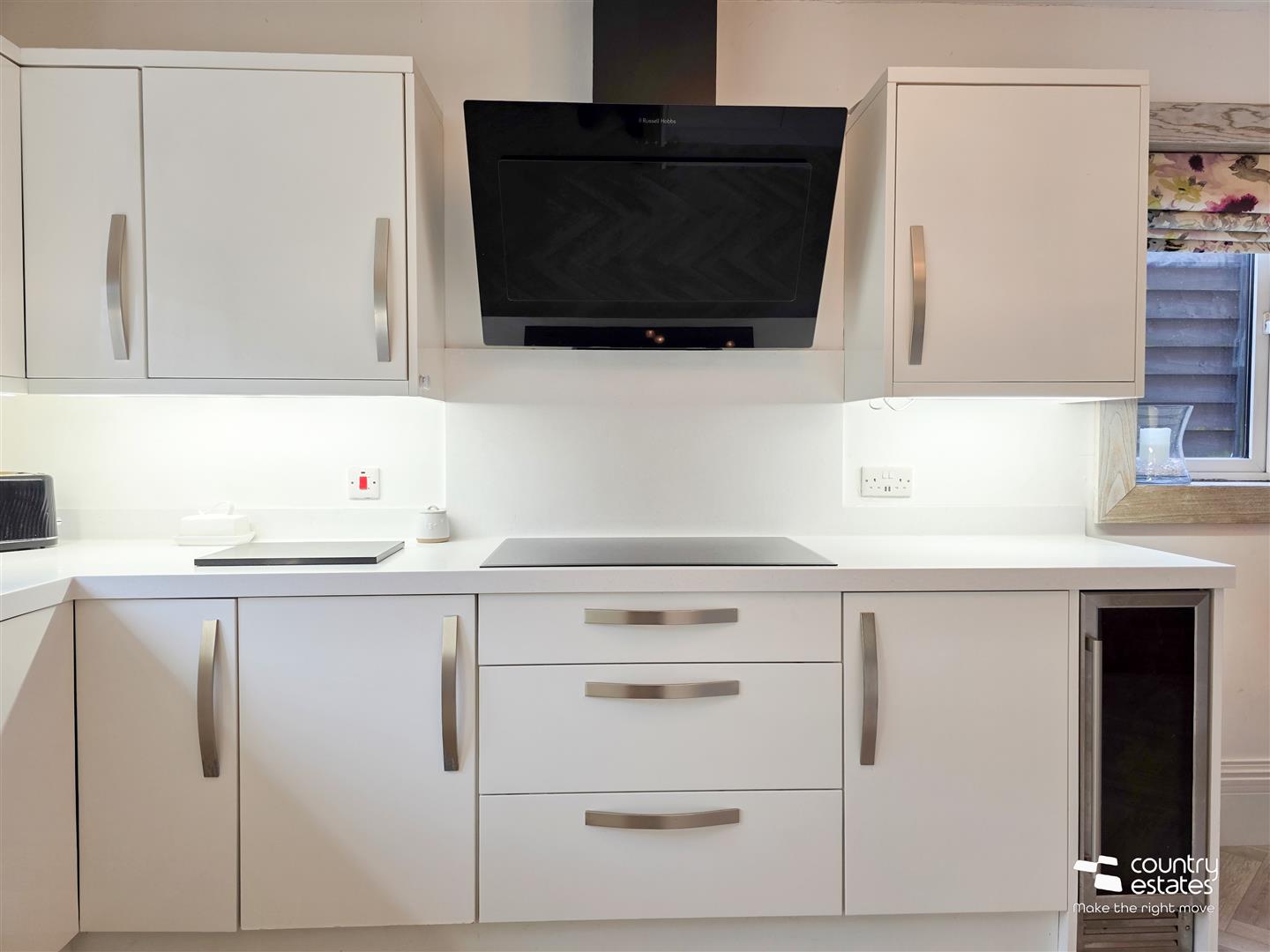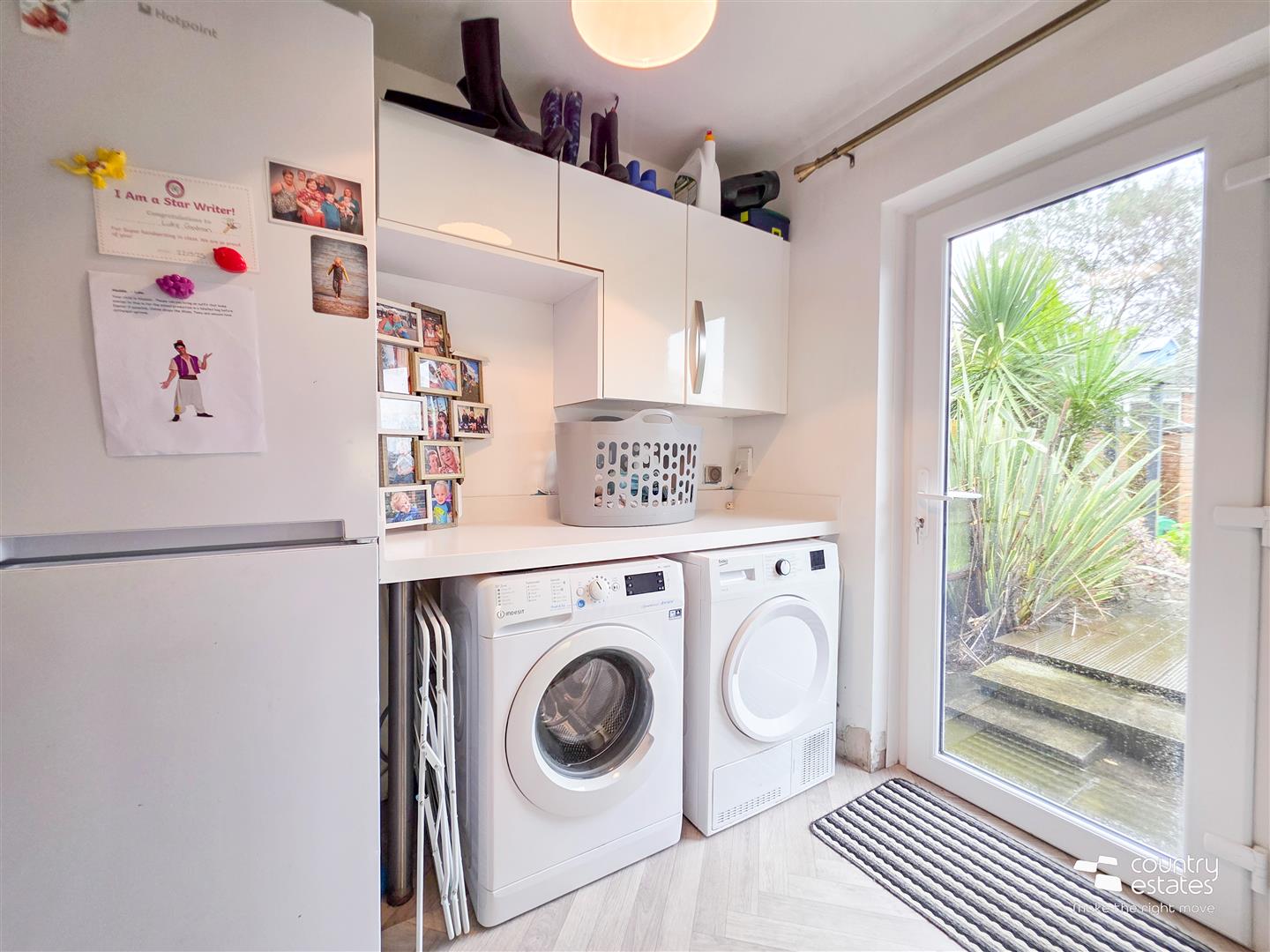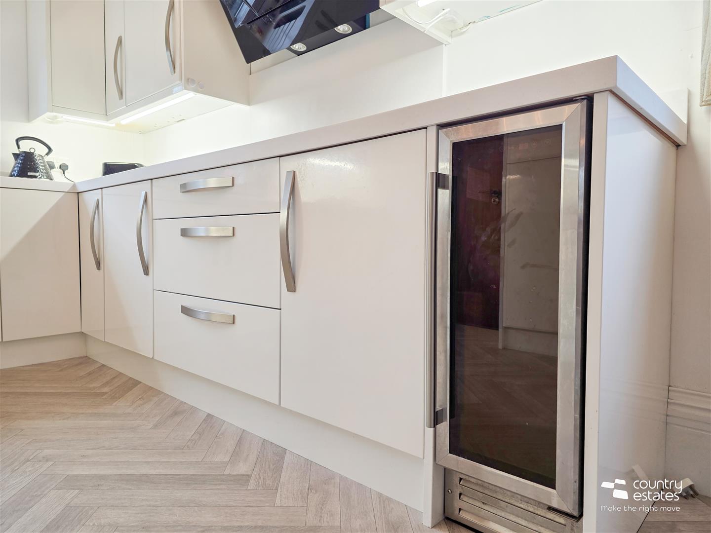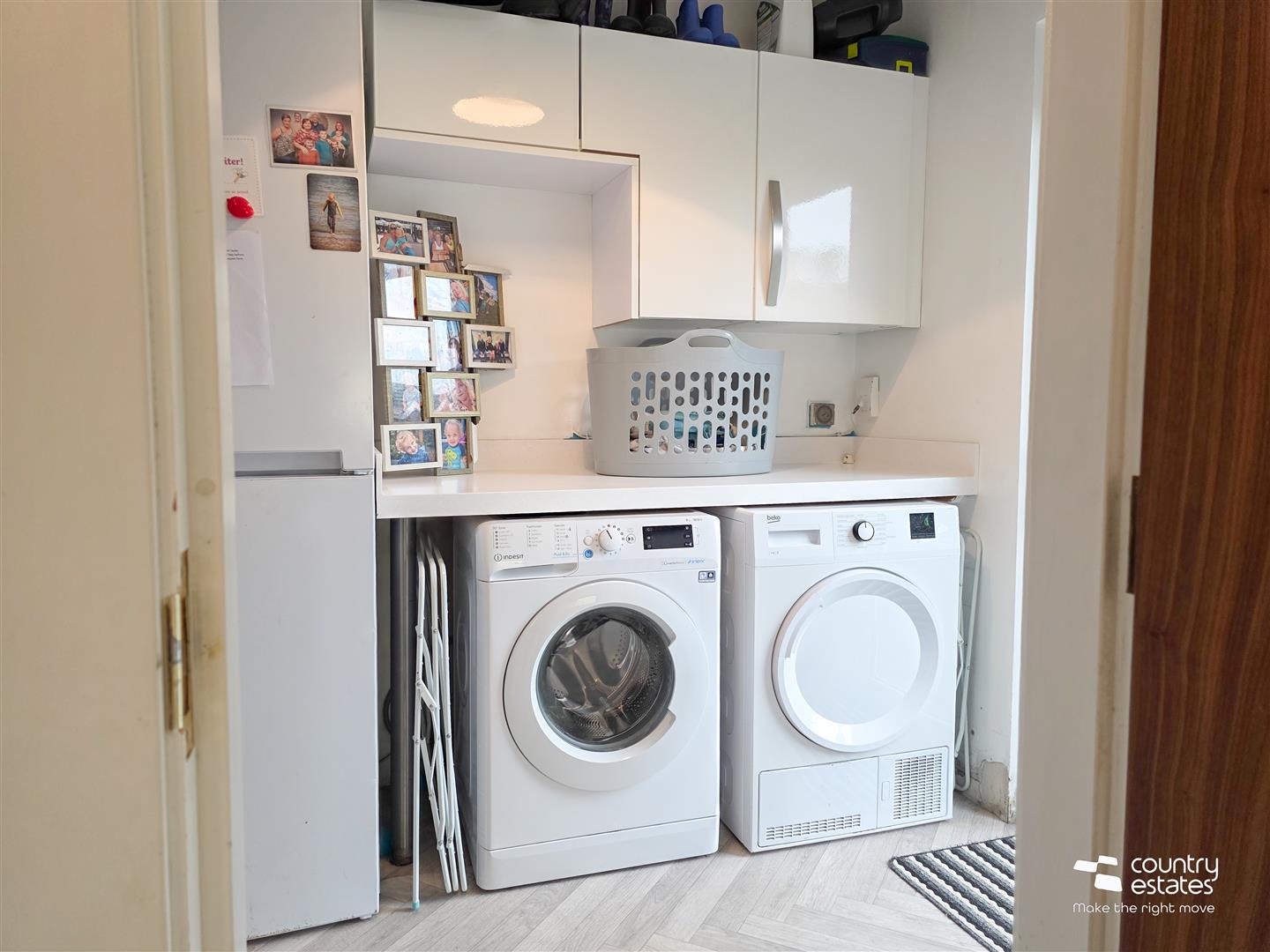 Equipped with high level gloss units and contrasting work surfaces. Plumbed for washing machine. Space for tumble dryer. PVC Double glazed door to rear garden.