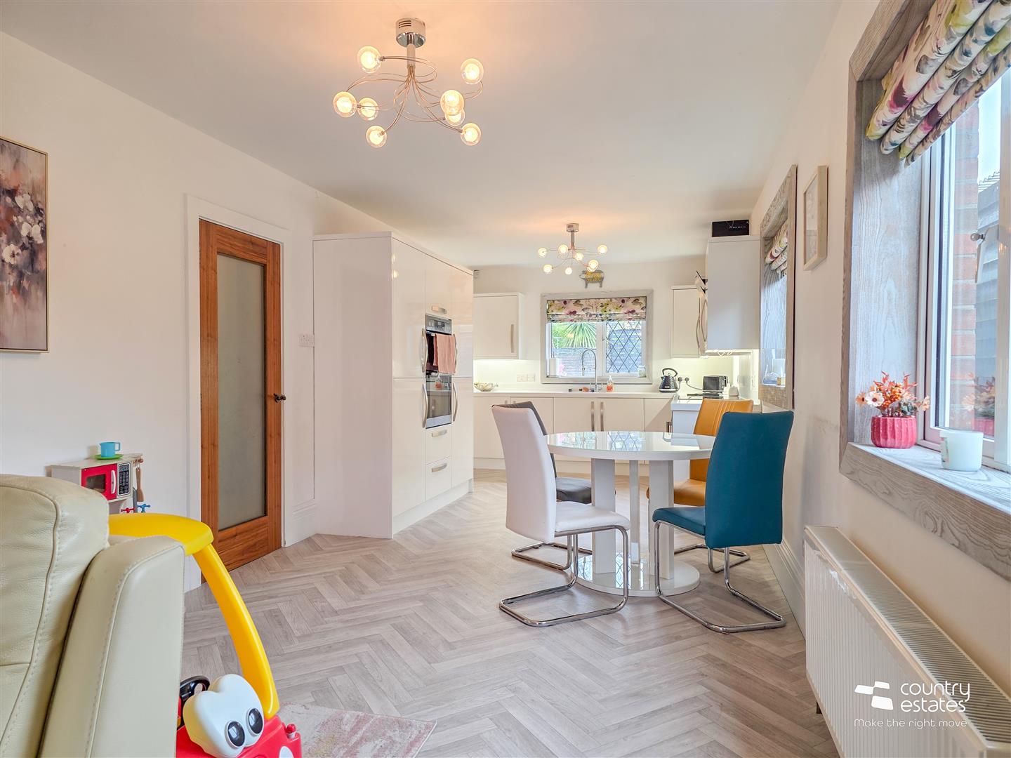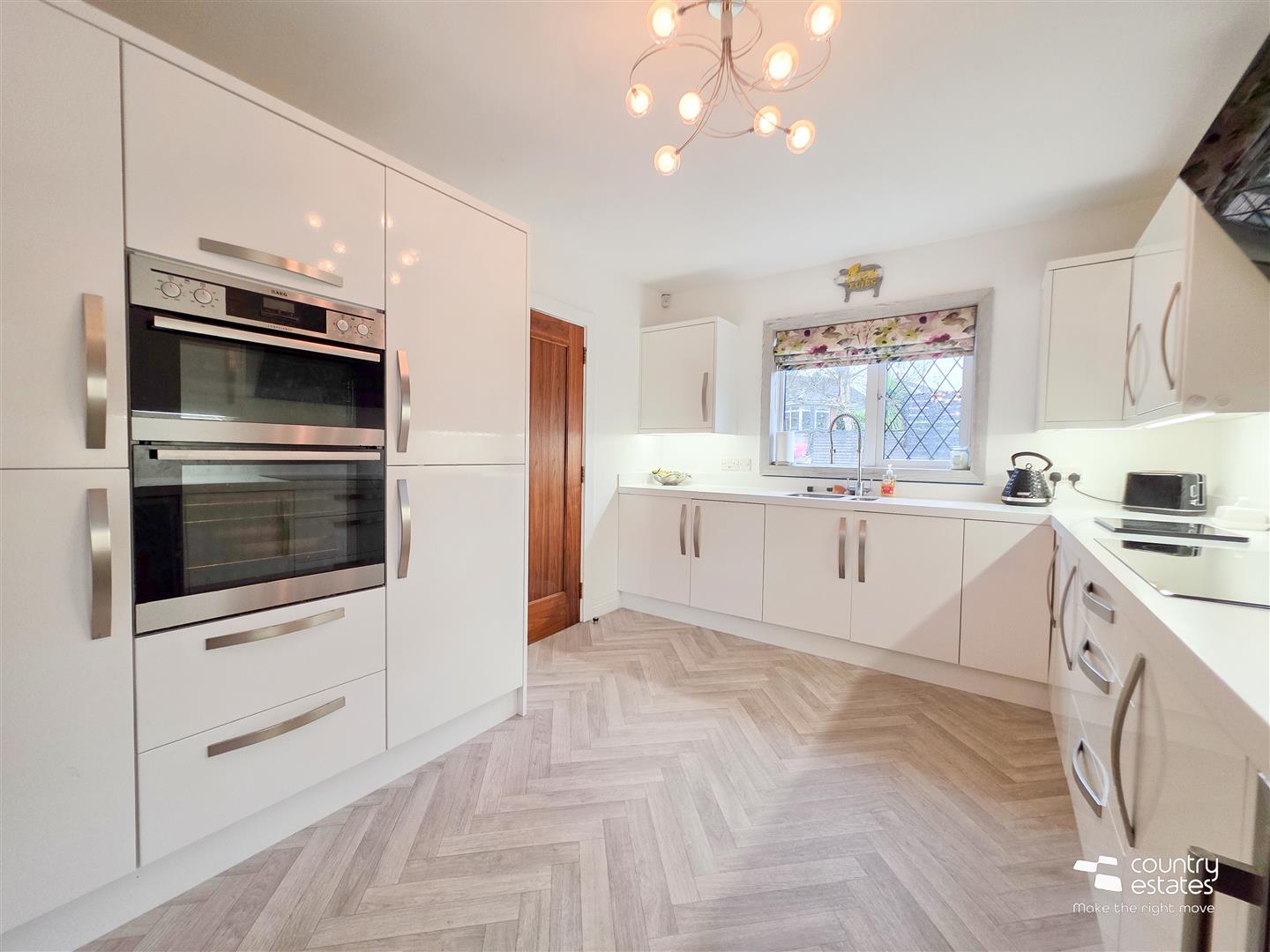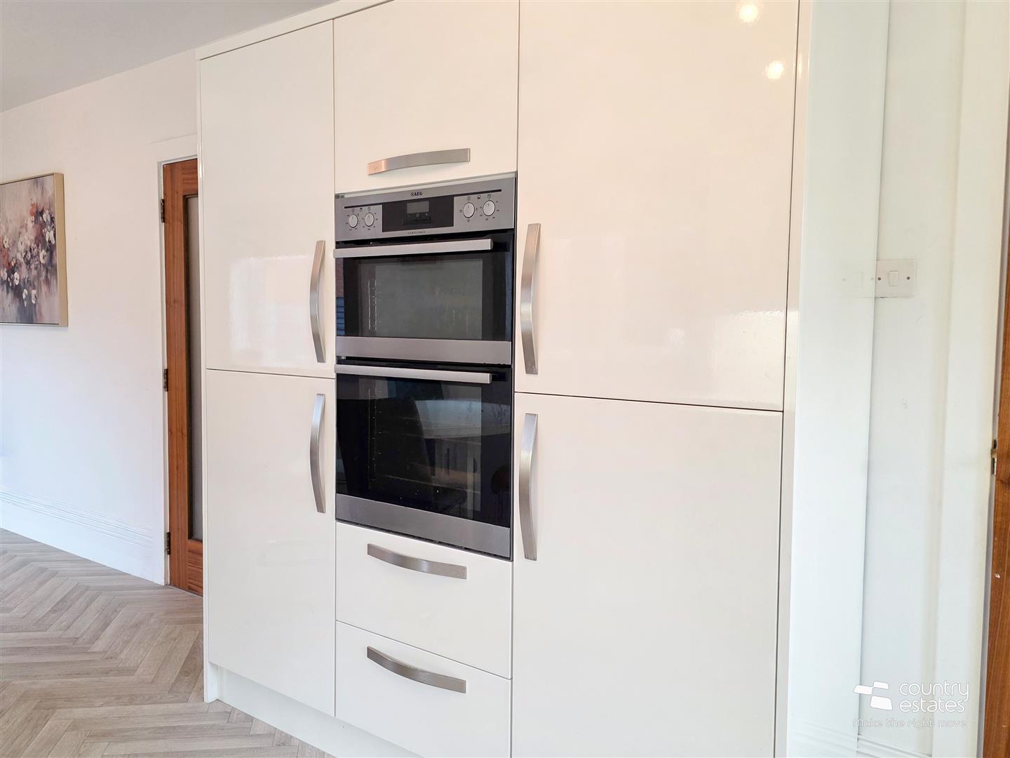 Contemporary fitted kitchen equipped with a comprehensive range of high and low level gloss fitted units with contrasting work surfaces and upstands. One and a half bowl undermount sink unit with swan neck tap. Integrated eye level ovens with separate five ring electric hob and overhead angled extractor fan. Wine fridge. Vinyl floor covering to kitchen. Quality laminate flooring to family room. Recessed down lighting.