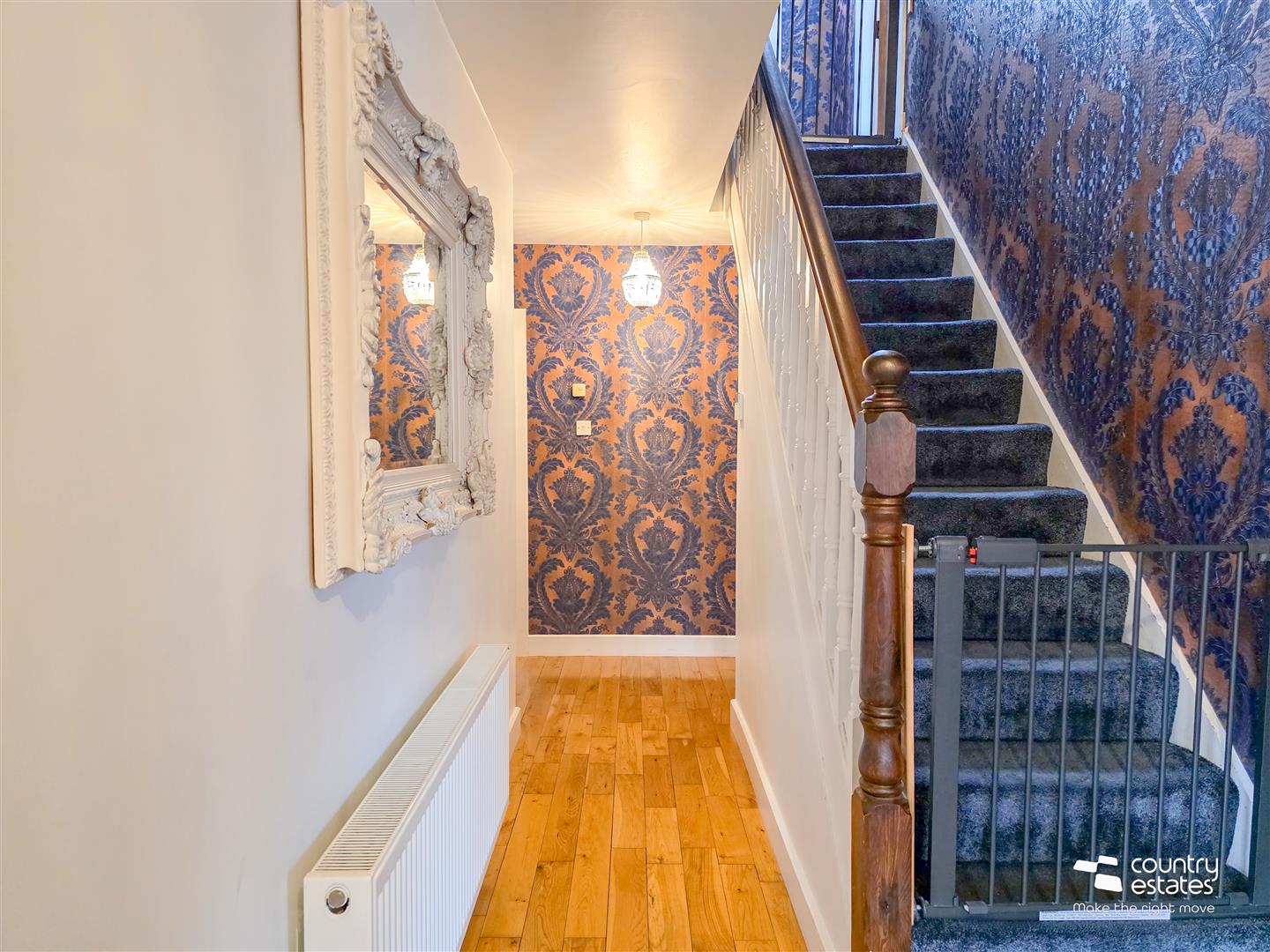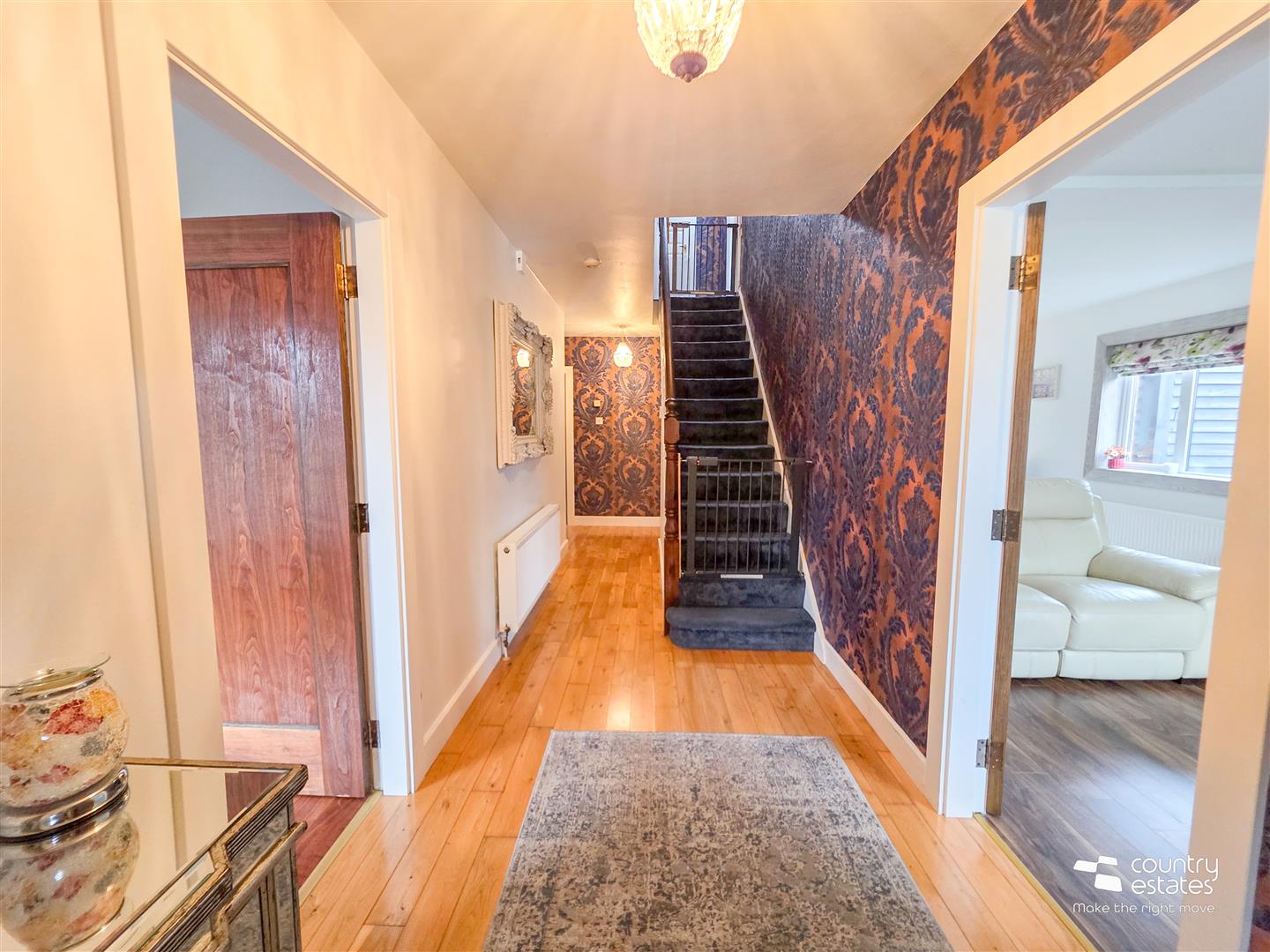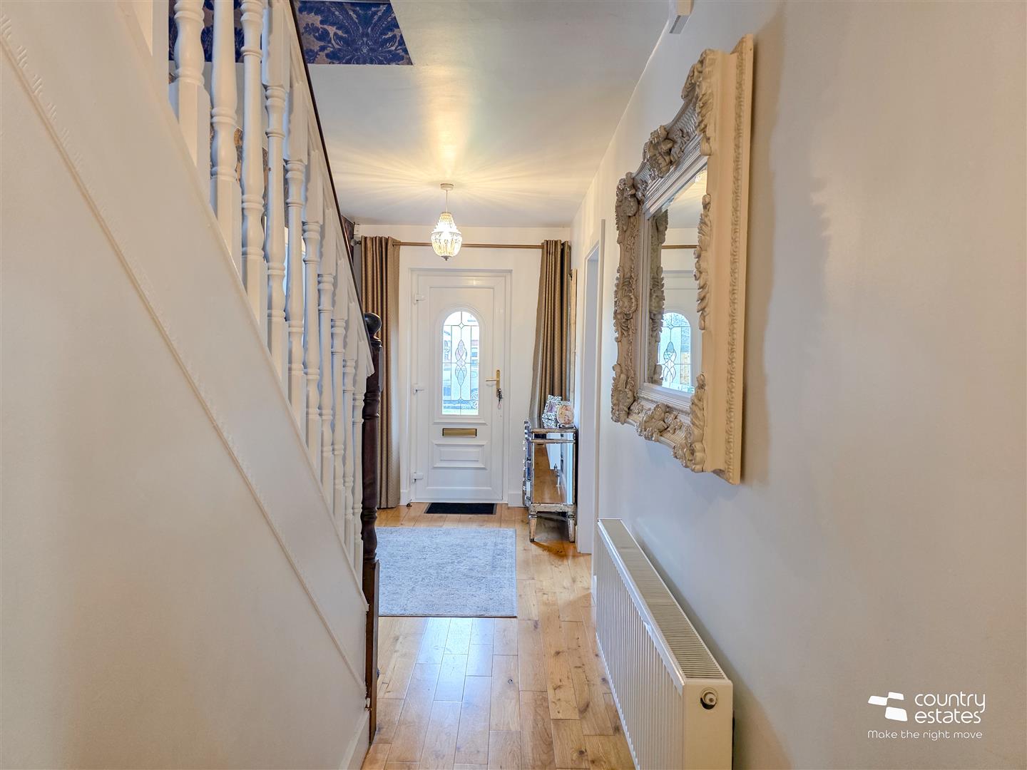 PVC double glazed front door with leaded glass into spacious well presented entrance hall with solid oak hardwood flooring.