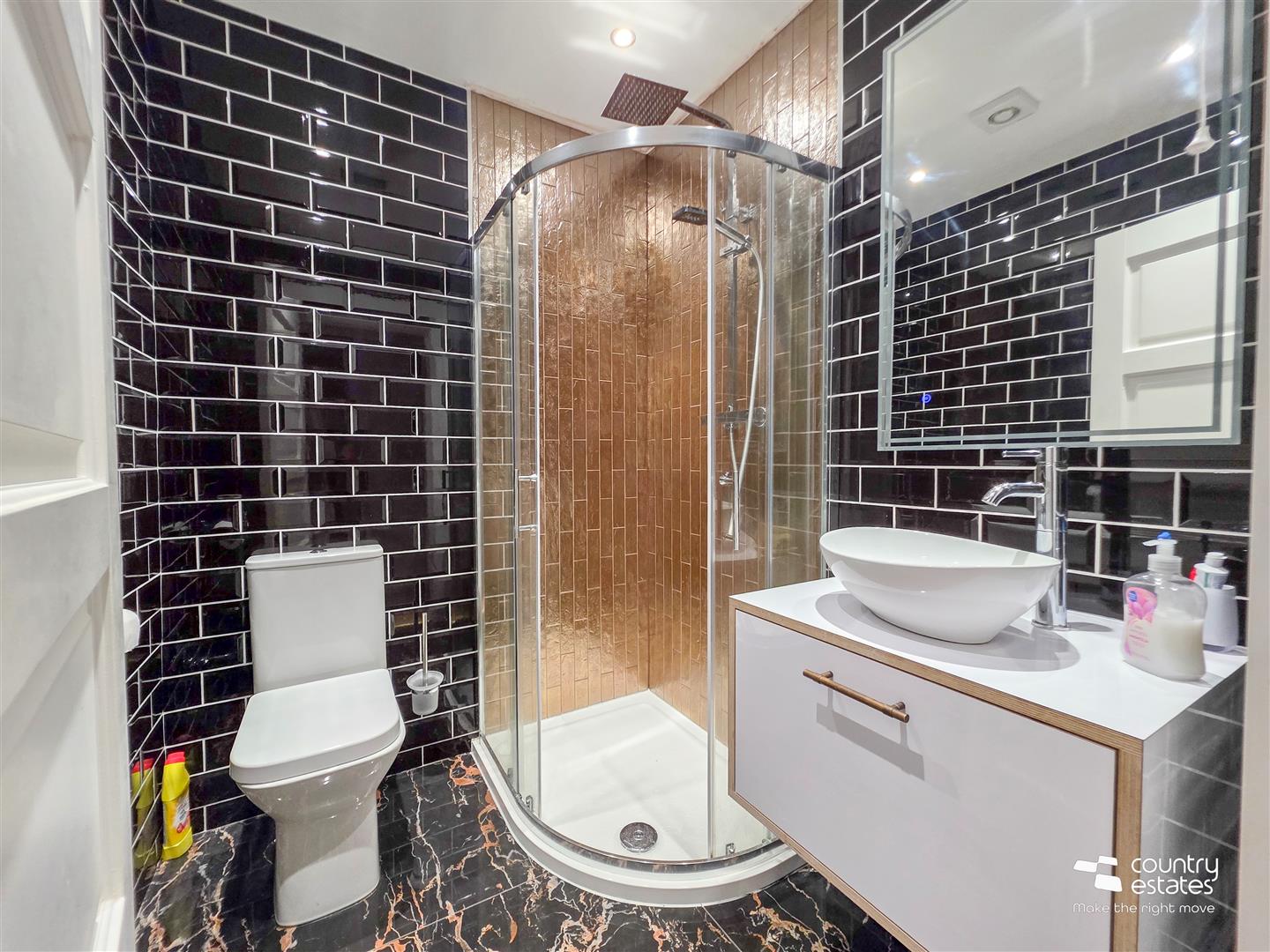 Comprising fully tiled shower cubicle with thermostatically controlled drench style shower and hand shower attachment, vanity unit with top mounted wash hand basin and single lever tap, and a button flush WC. Tiled walls. Tiled floor. Recessed down lighting. Chrome towel radiator.