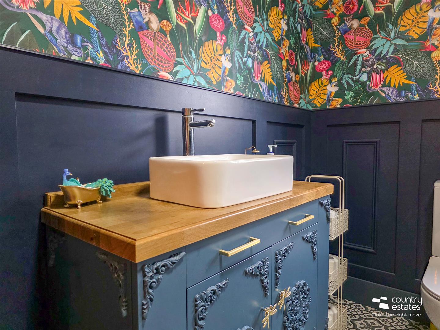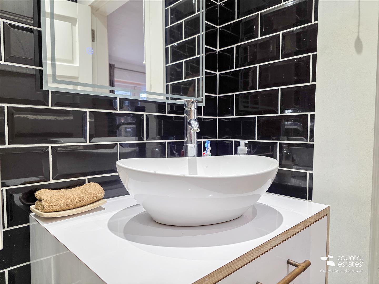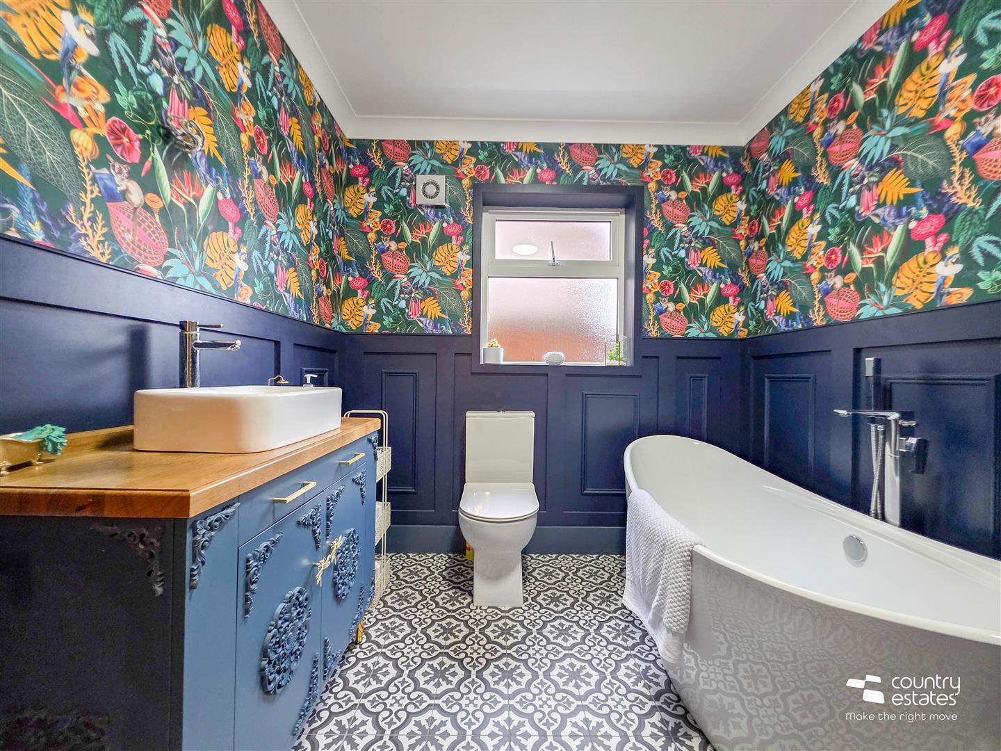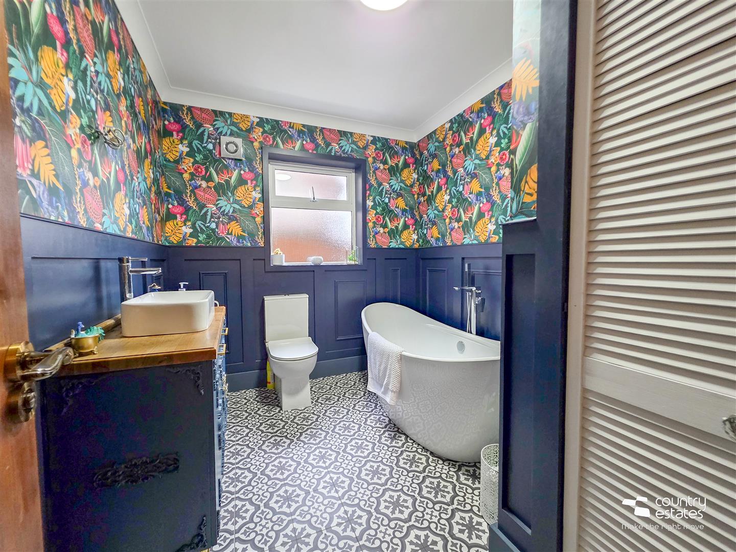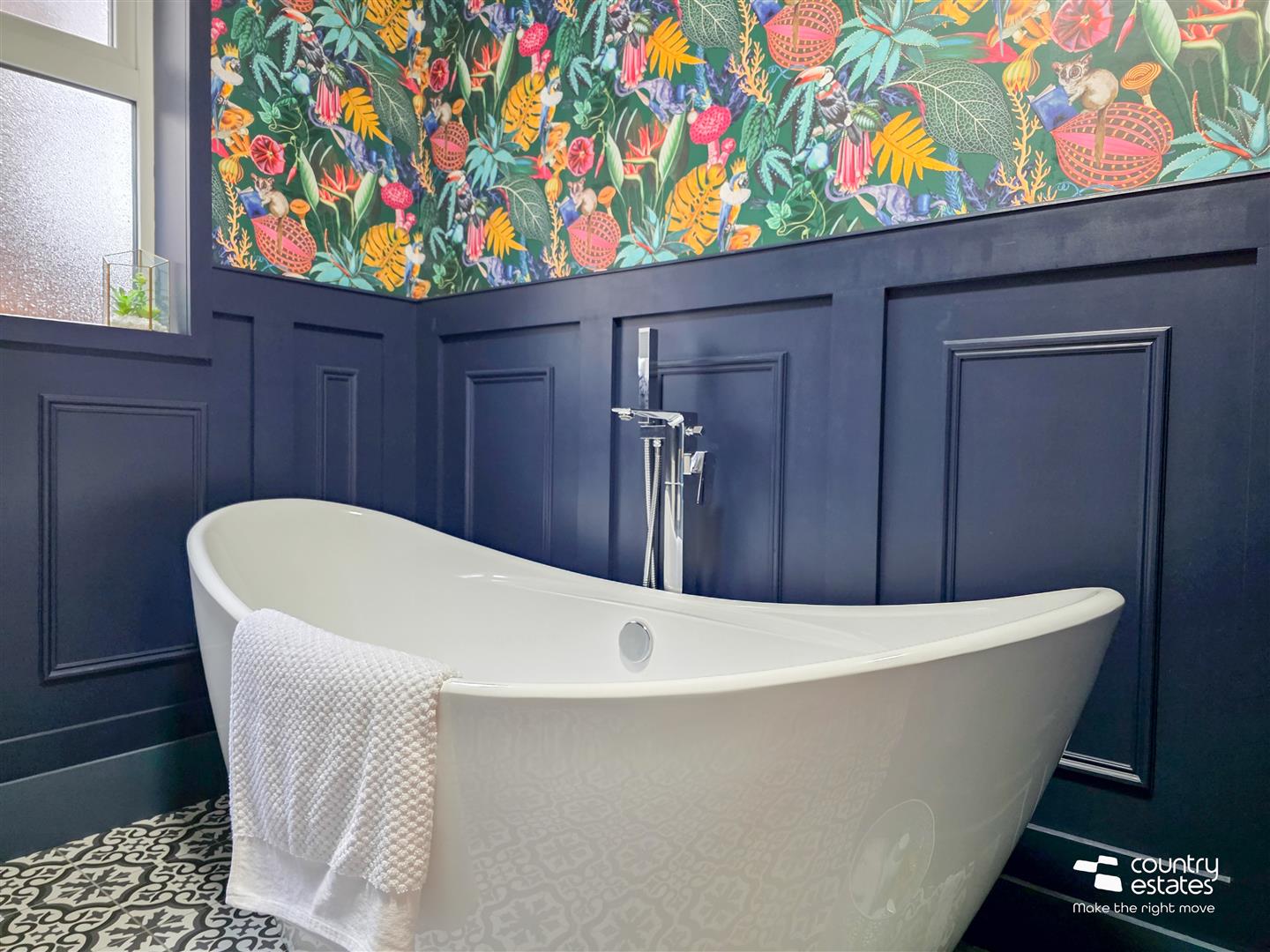 Comprising free standing double ended bath with floor mounted tap and hand shower attachment, Vanity unit with top mounted wash hand basin and a button flush WC. Accent wall panelling. Tiled floor. Hot press storage cupboard.