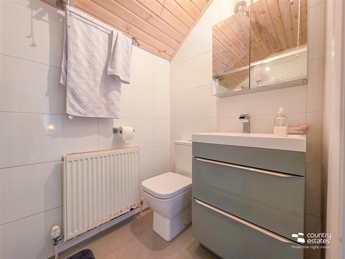 Comprising a large fully tiled shower cubicle with electric shower unit, vanity unit with monobloc tap, and a button flush WC. Tiled floor. Tiled walls. Wood panelled ceiling.