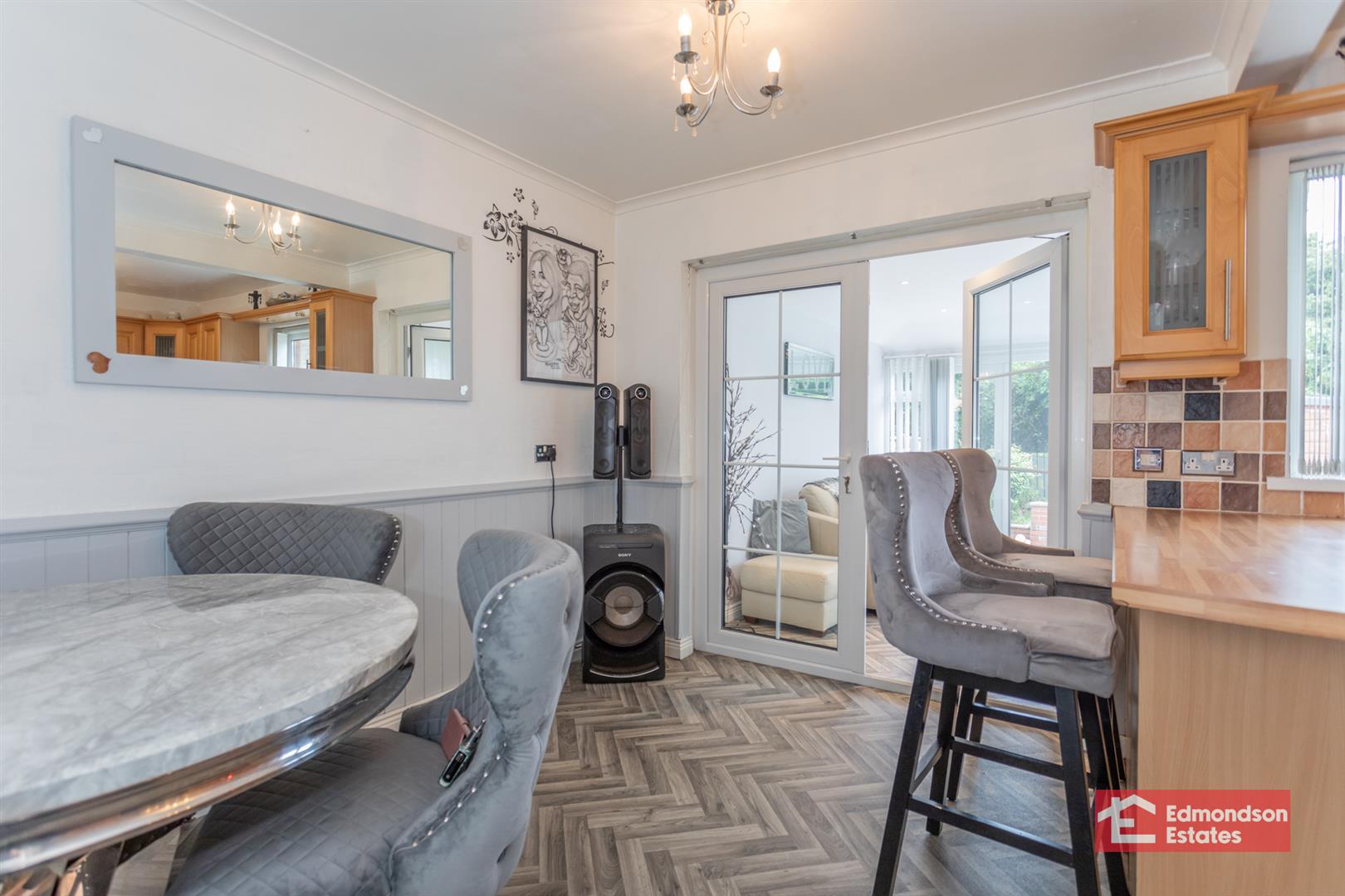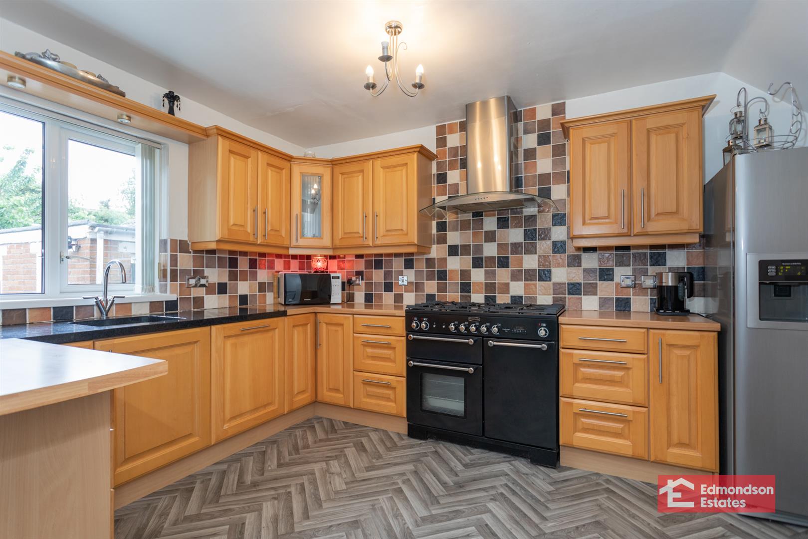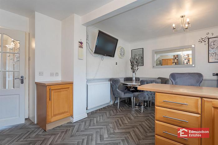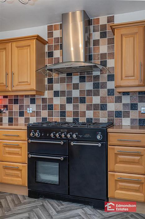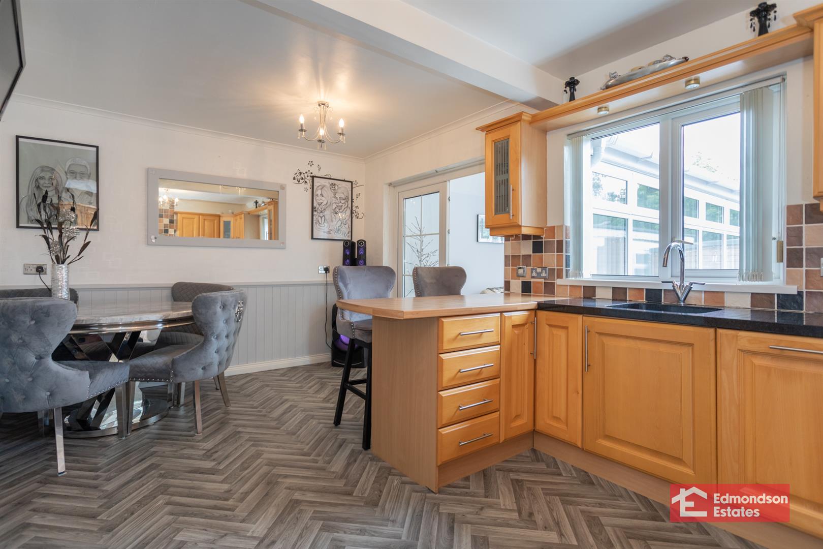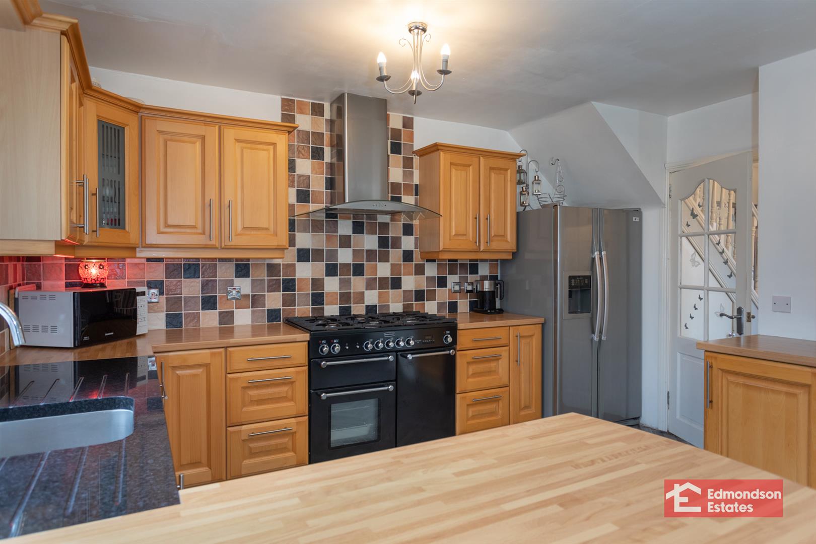 widest points. Modern fitted shaker style kitchen with high and low level storage units and contrasting wood block effect work surfaces. Inlaid stainless steel sink unit with granite drainer bay. Integrated dishwasher. Space for fridge freezer and range oven. Breakfast bar area. PVC double glazed French doors to sunroom.