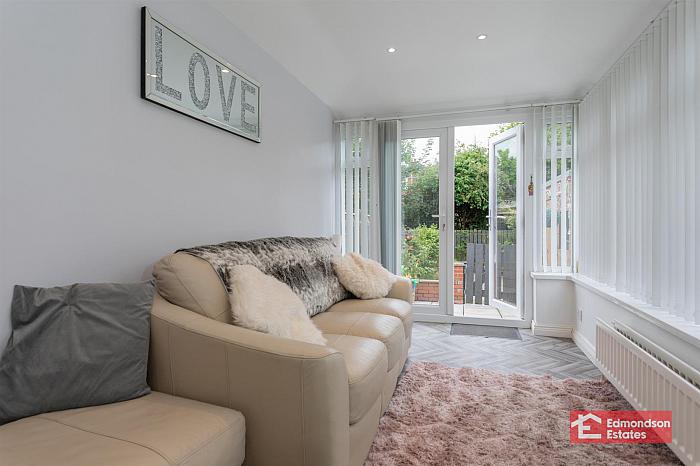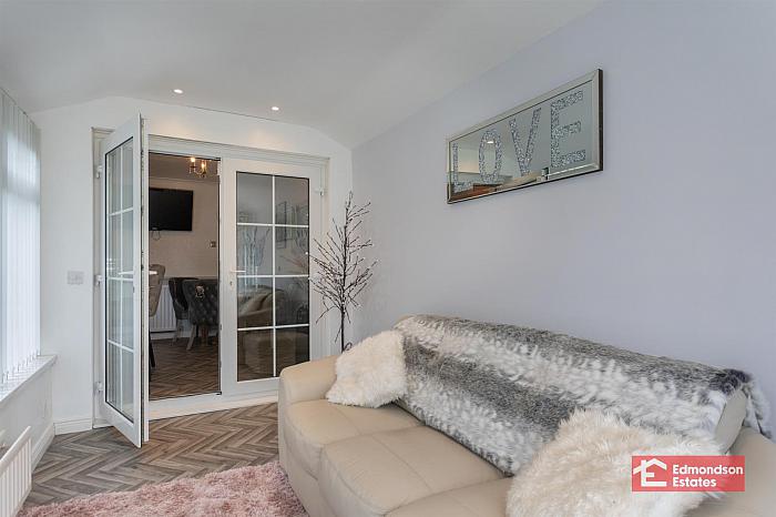 PVC double glazed French doors to rear garden. Recessed down lighting.