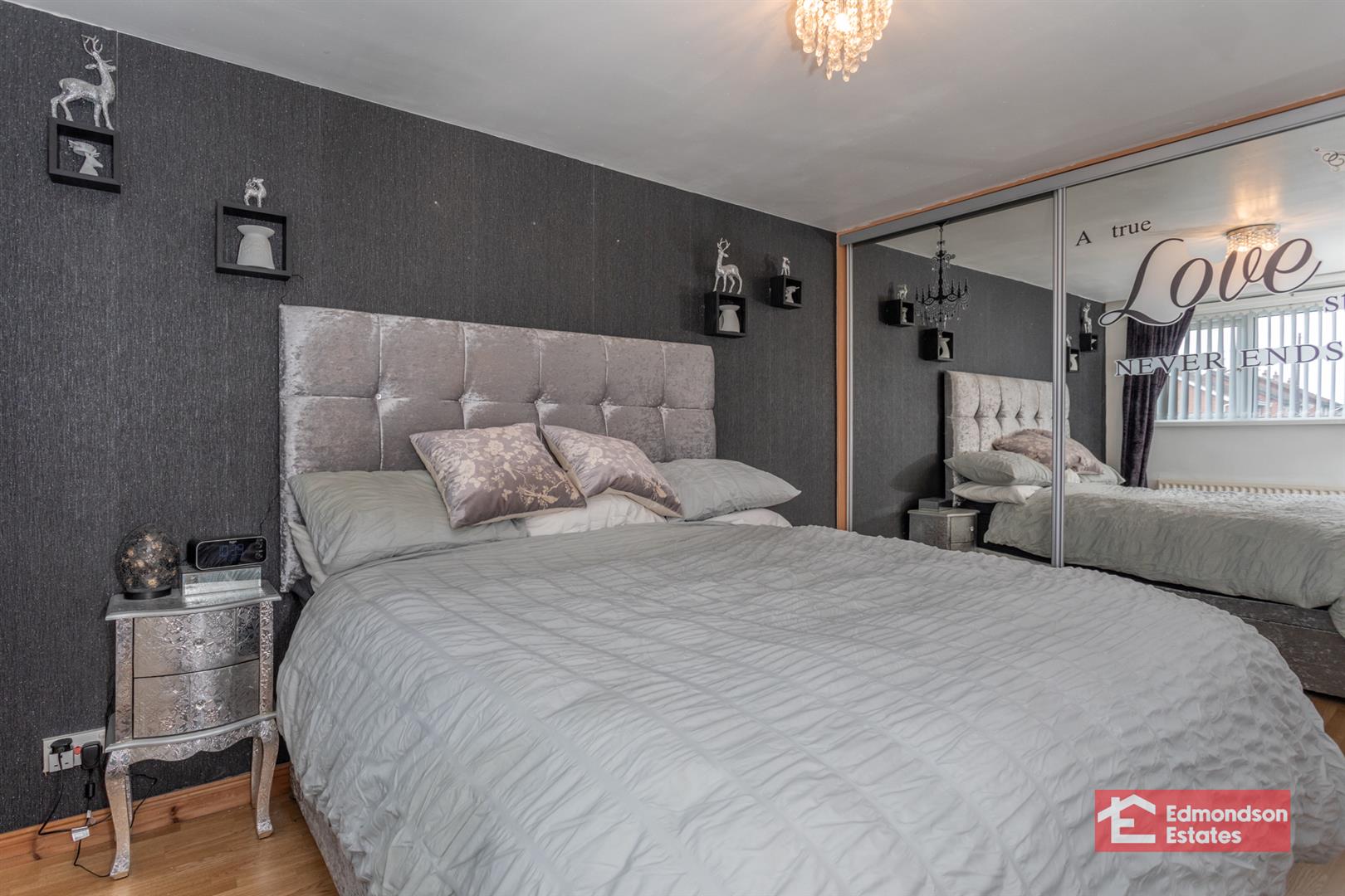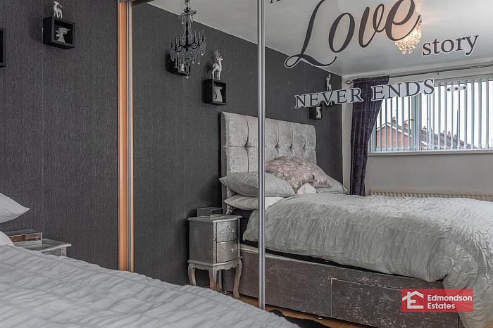 Integrated wardrobes in mirrored sliding doors. Wood laminate floor covering.
