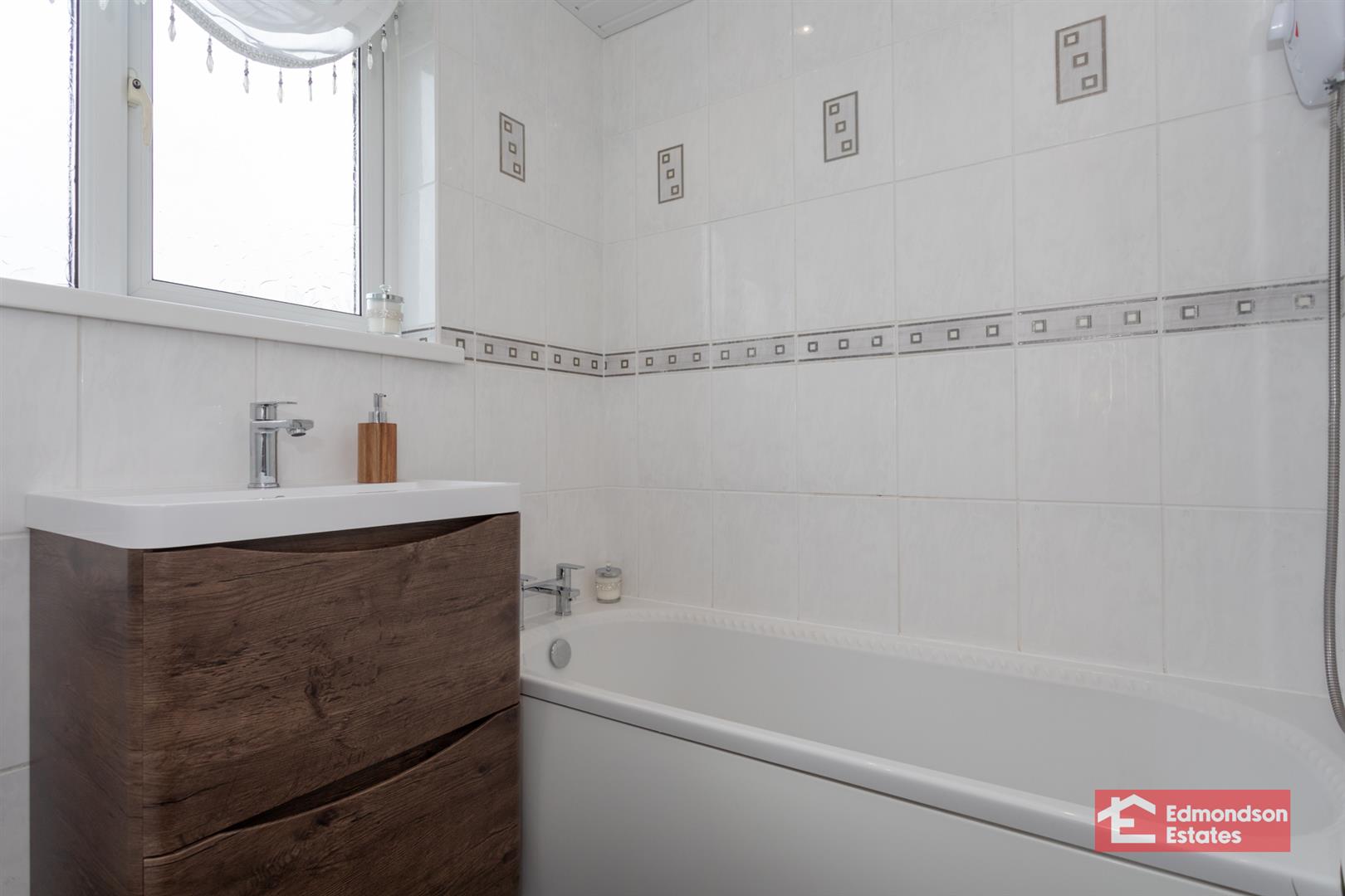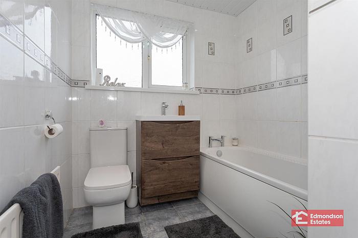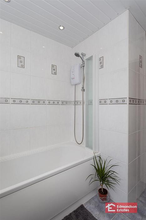Modern fitted three piece suite comprising panelled bath with electric shower over, floating vanity unit and WC. Fully tiled walls and tiled floor.