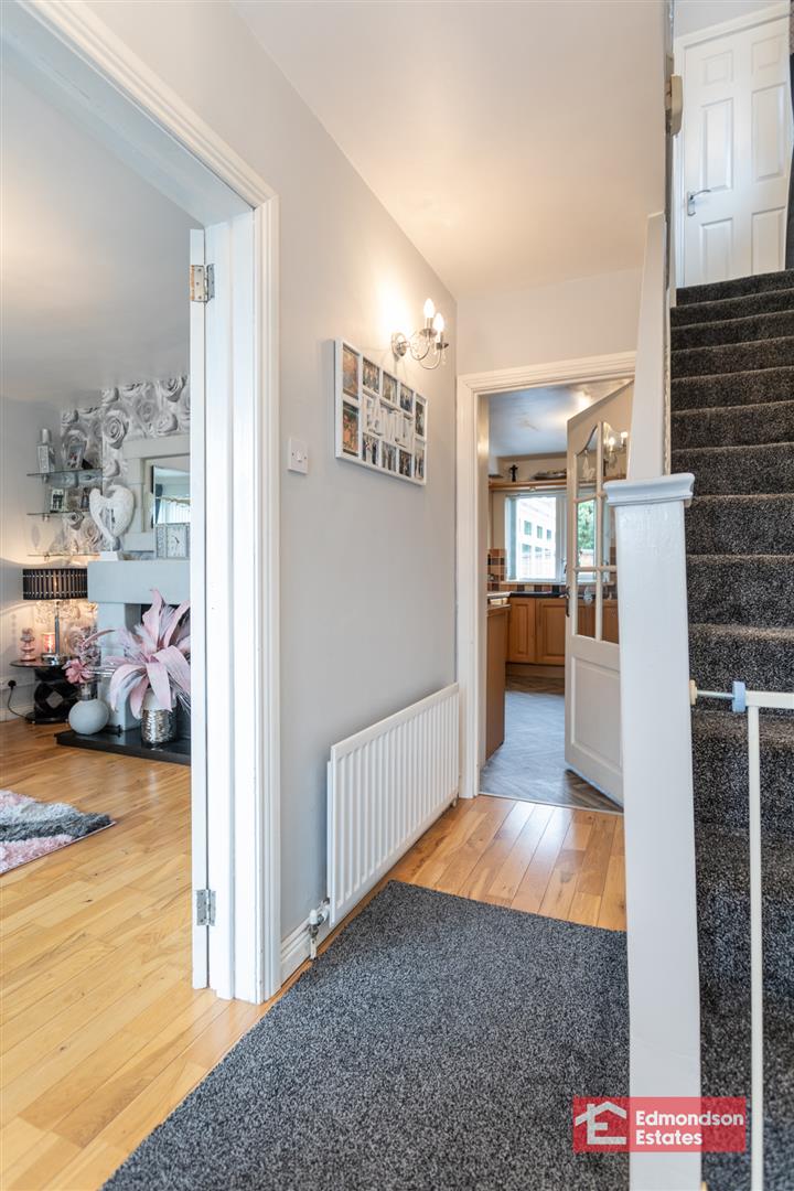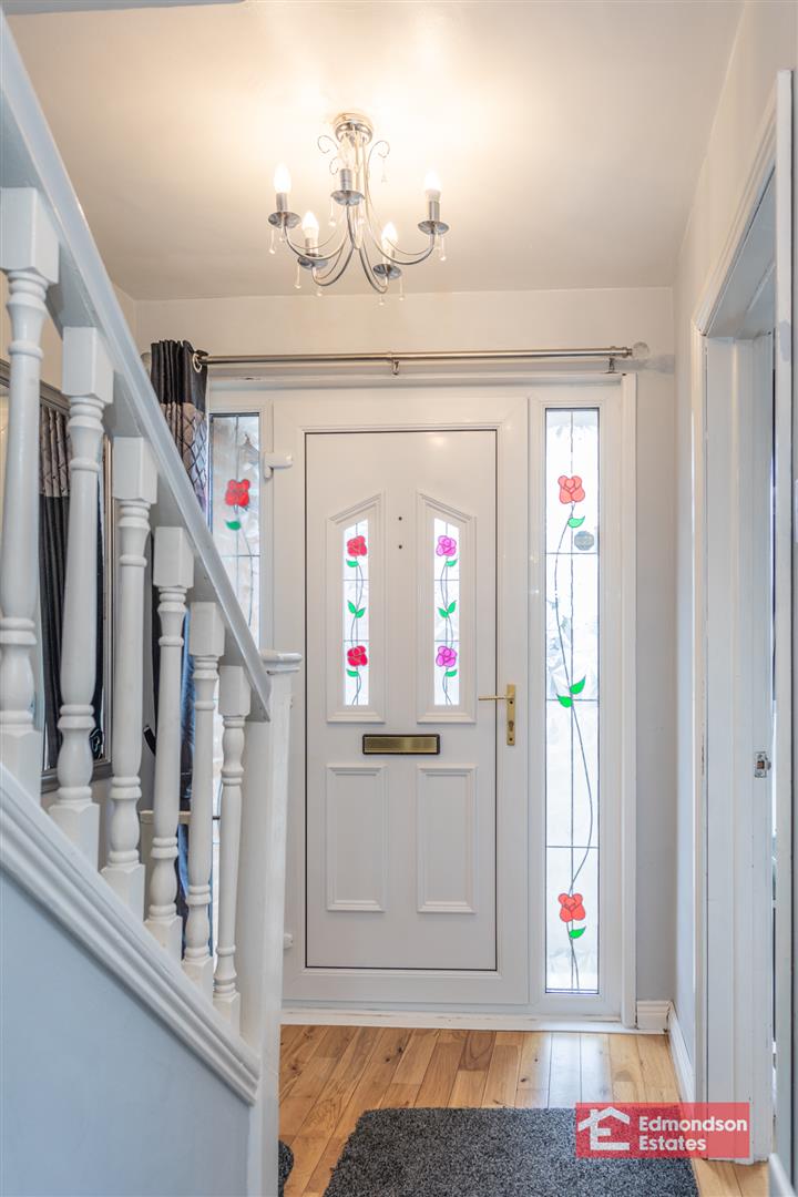 PVC double glazed front door with matching side screens. Stairwell to first floor. Access to under stair store. Solid wood flooring continuing into lounge.