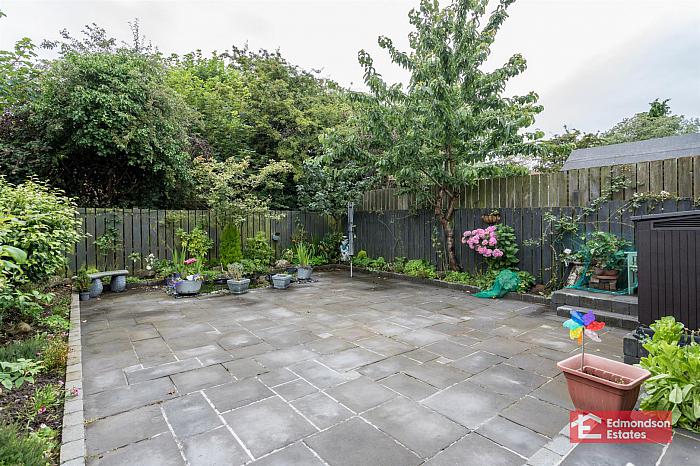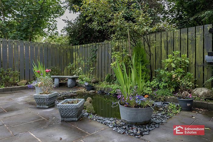 Low maintenance, south west facing rear garden in paving with array of plants, trees and shrubs with garden pond.