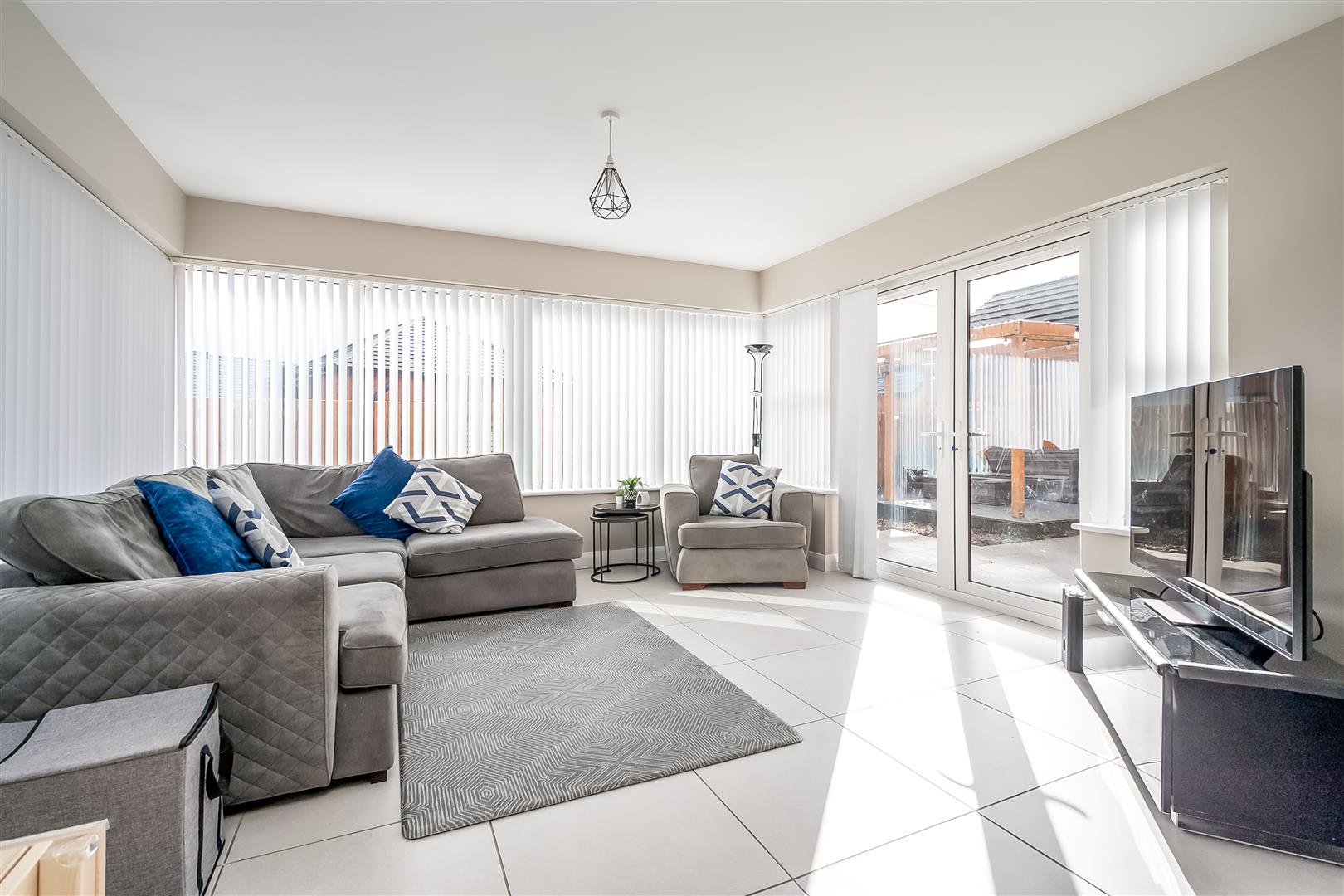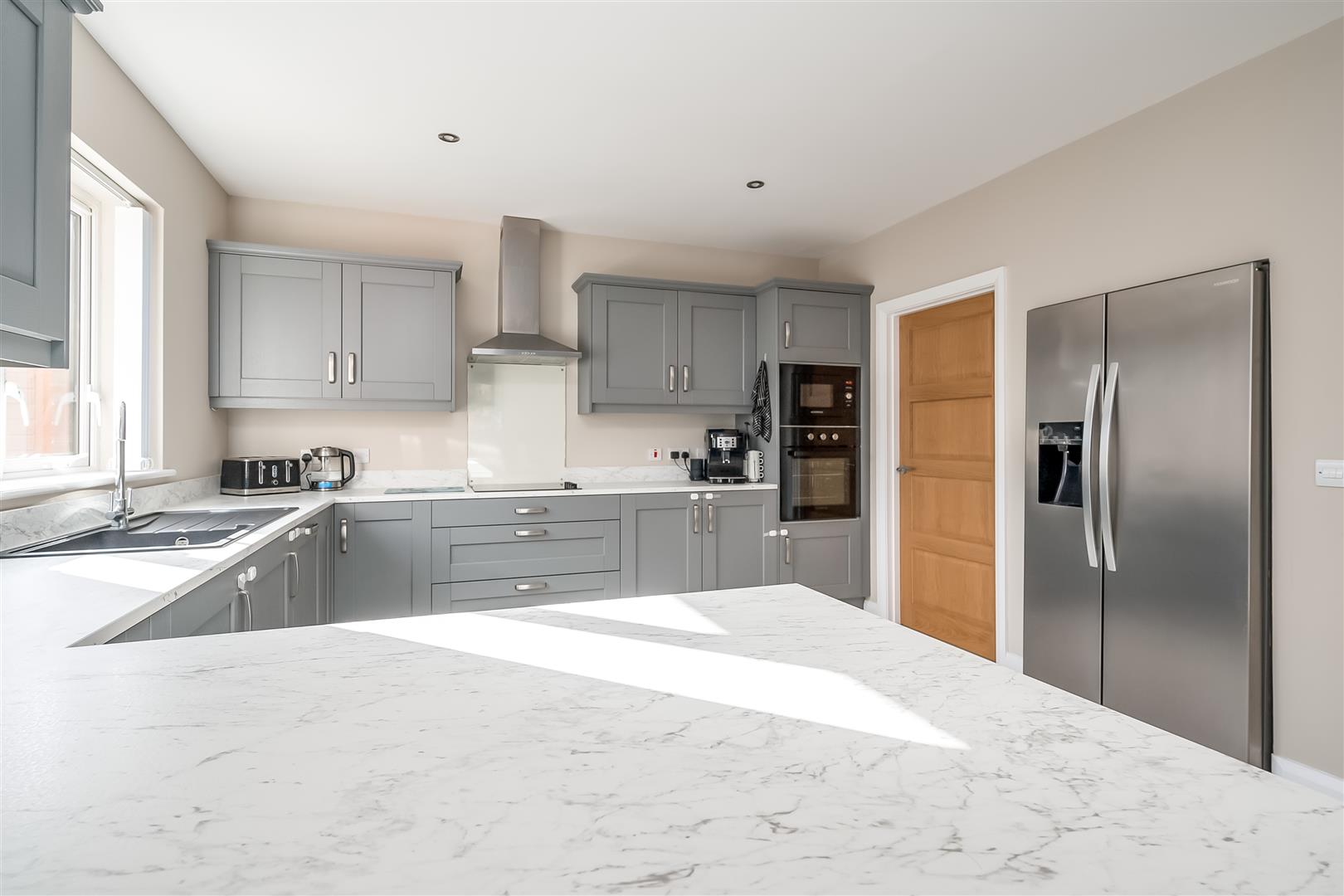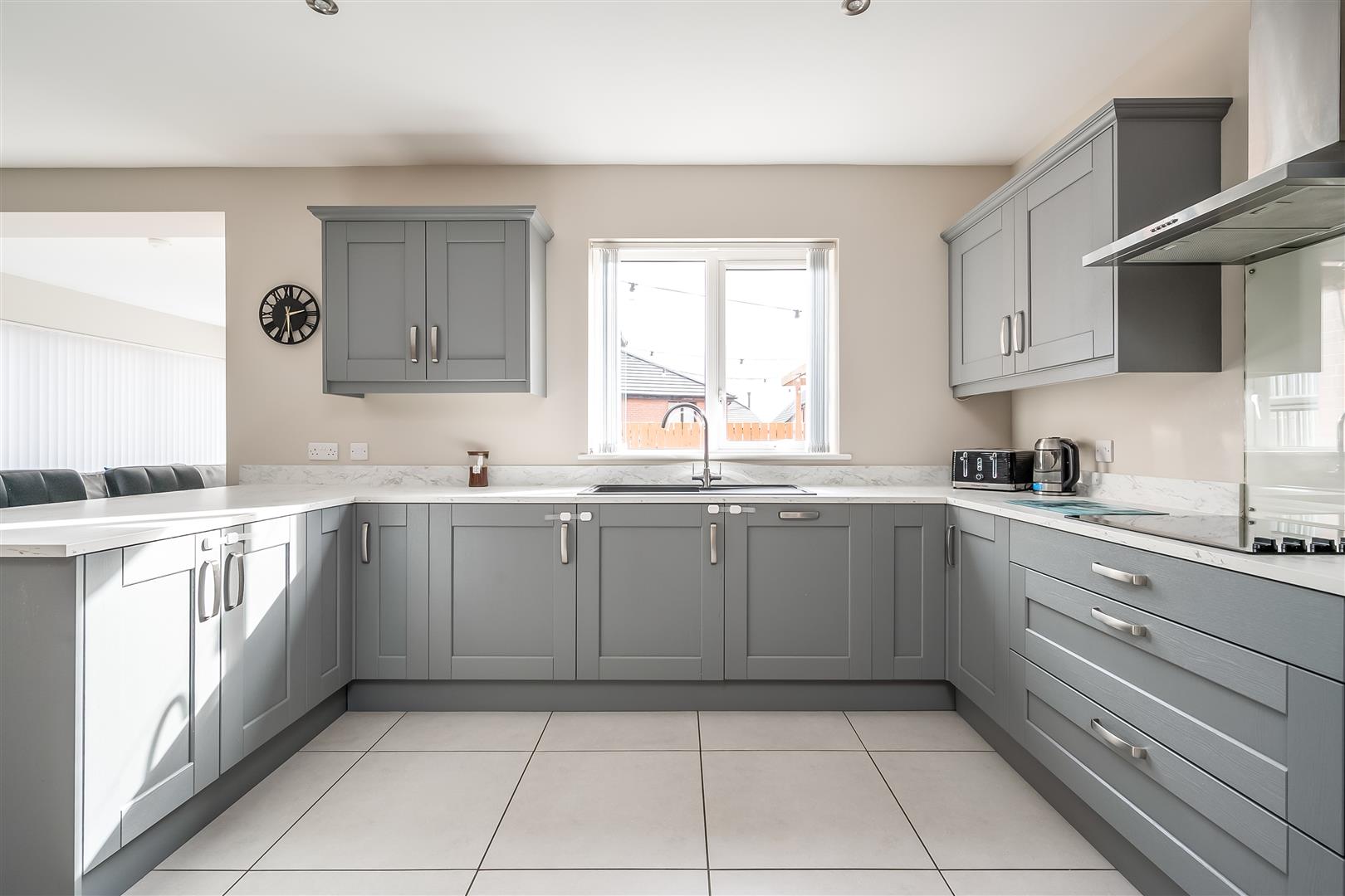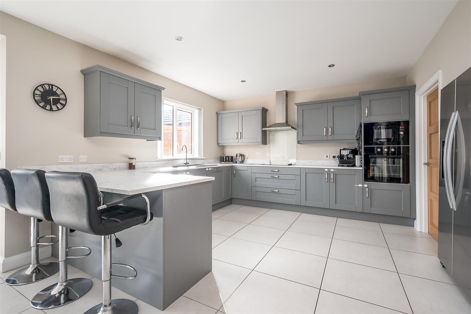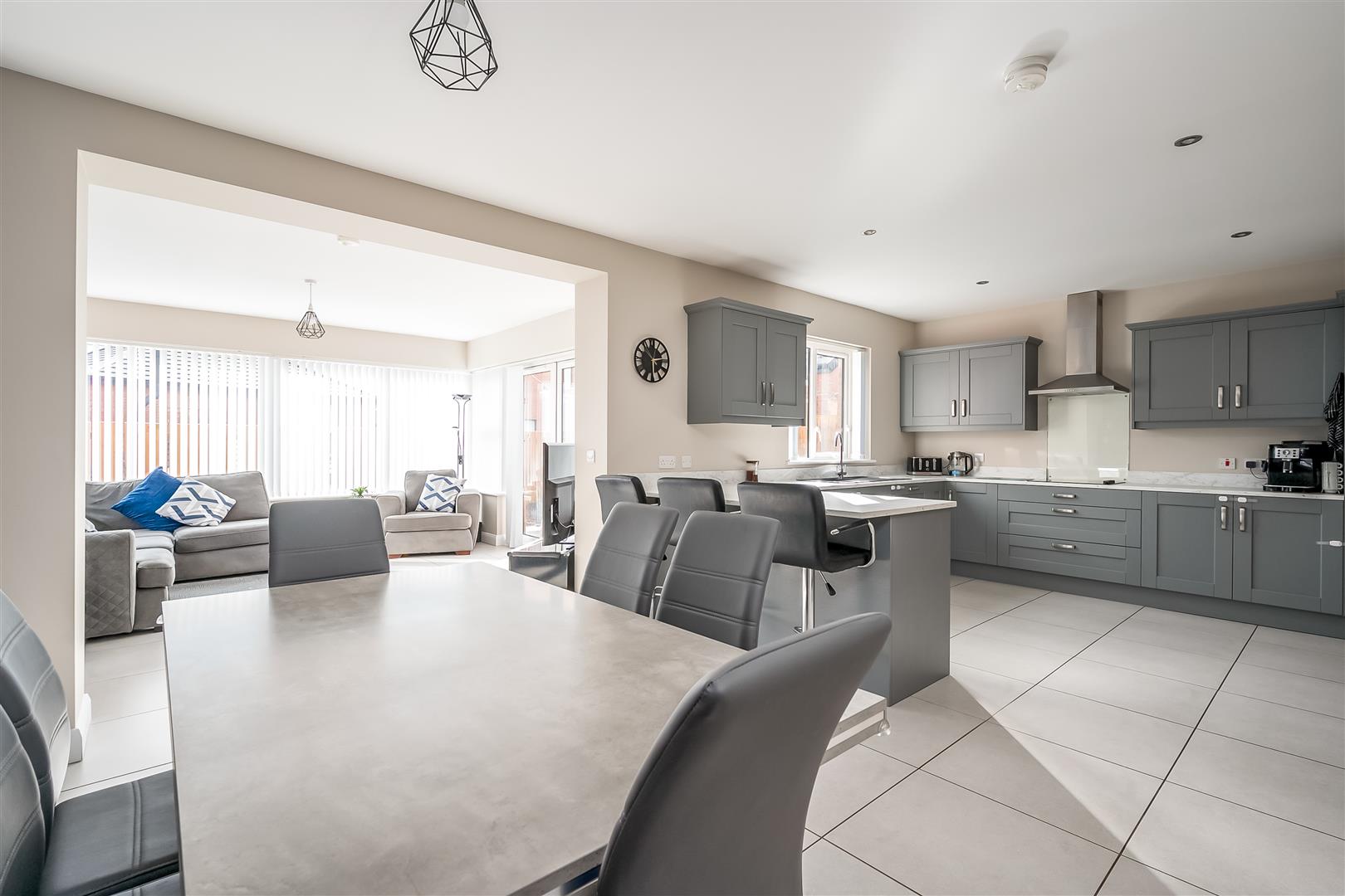 widest points. Modern fitted shaker style kitchen with high and low level storage units and contrasting granite effect work surfaces. Matching upstanding to worksurface. Breakfast bar area. Integrated appliances to include 4 ring electric hob with stainless steel extractor canopy over, washing machine, eye level Nordmende microwave and oven. Space for American style fridge freezer. Black composite sink unit. Tiled floor continuing through living and dining space. PVC double glazed French doors to sunroom accessing rear garden.