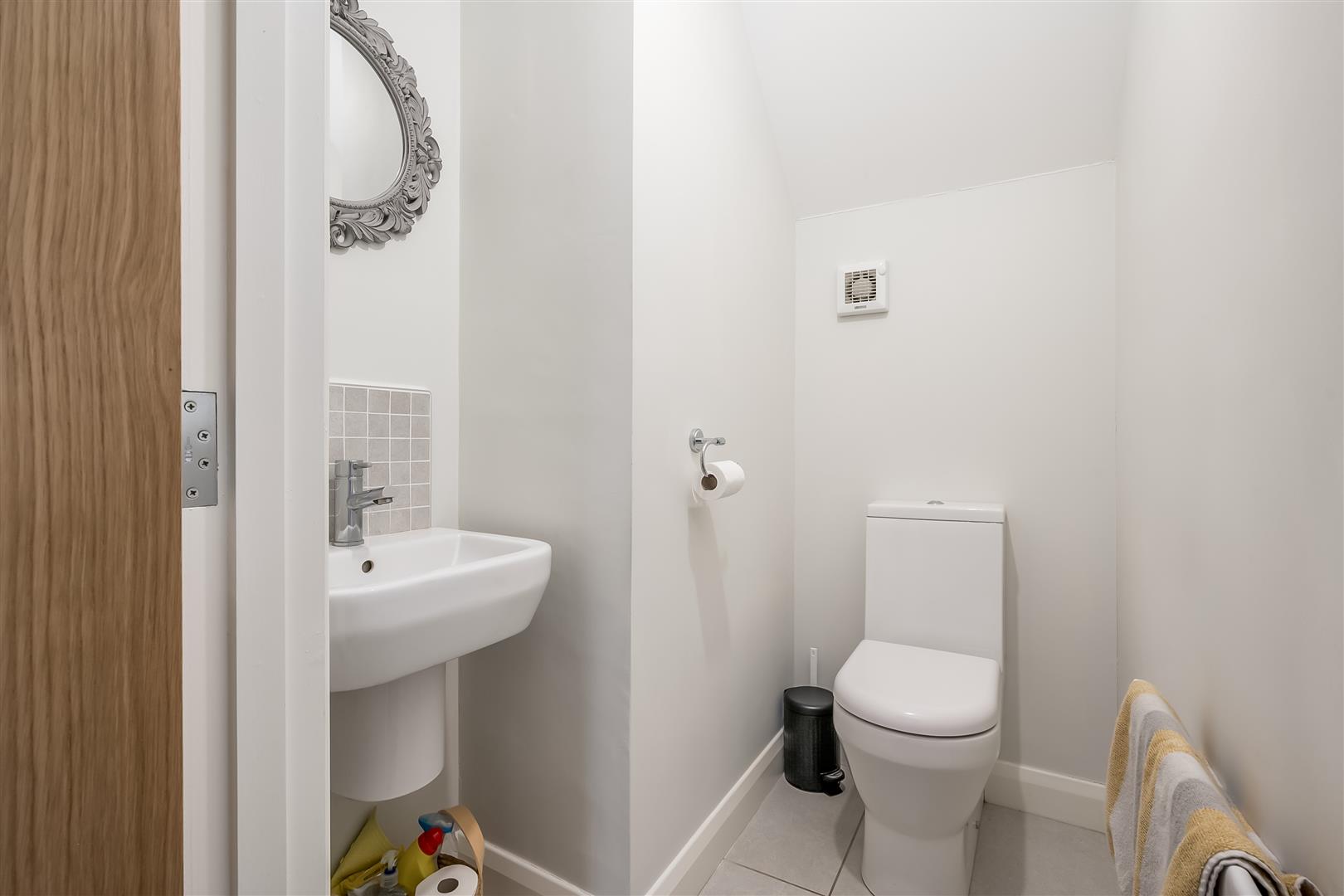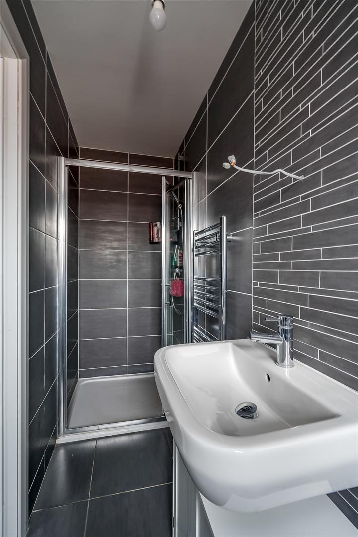 Modern fitted three piece suite comprising shower cubicle with mains shower over, pedestal wash hand basin and WC. Fully tiled walls and tiled floor. Chrome towel radiator.