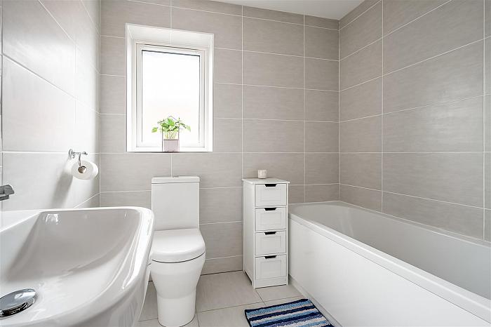 Modern fitted three piece suite comprising panelled bath with mains shower over, pedestal wash hand basin and WC. Fully tiled walls and tiled floor. Chrome towel radiator.