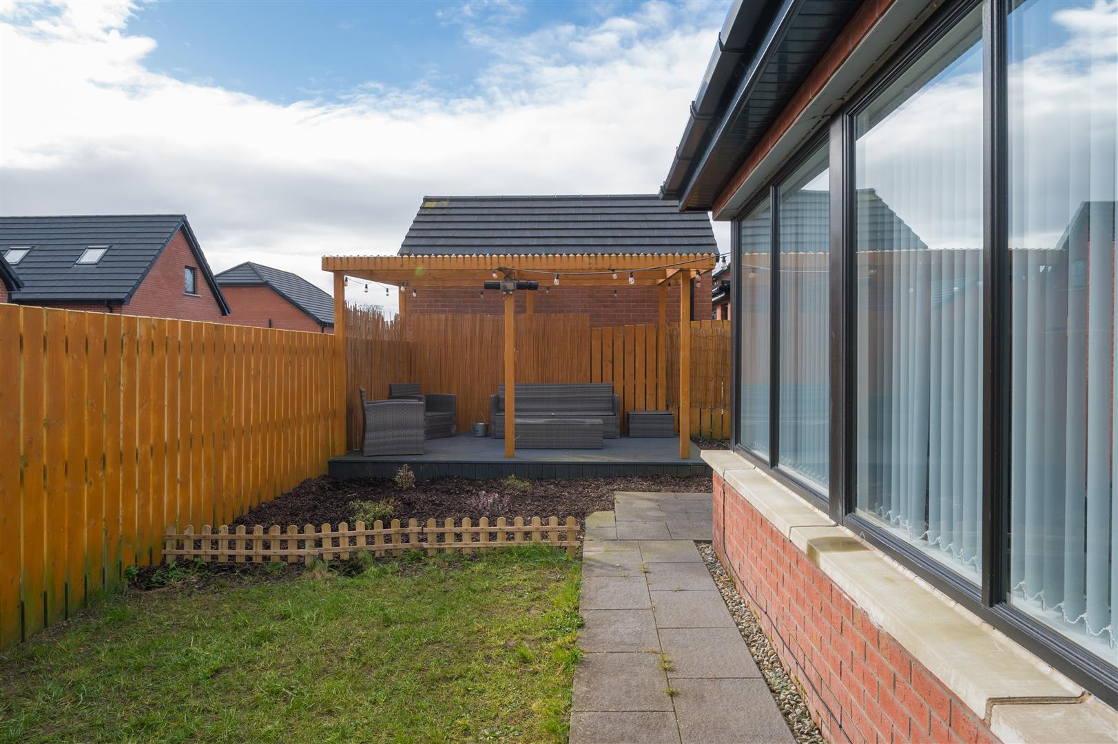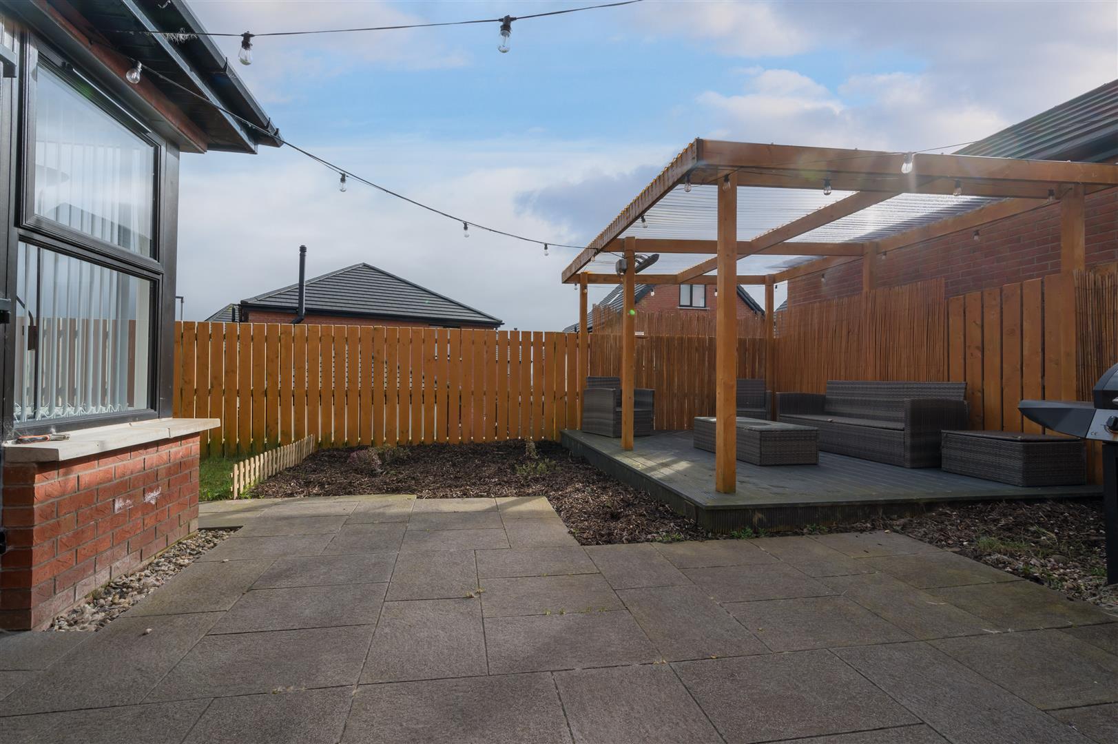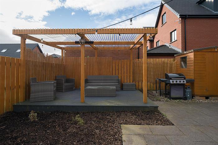 South facing rear garden in lawn, with decorative flowerbeds, paved patio area and raised timber decking area with covered pergola.