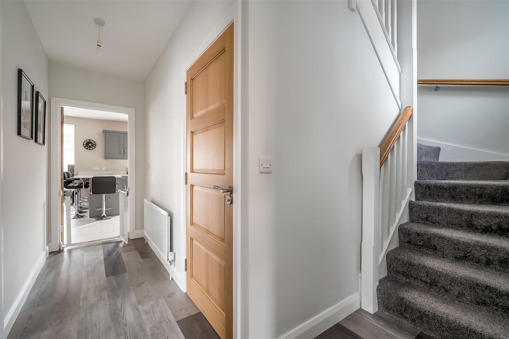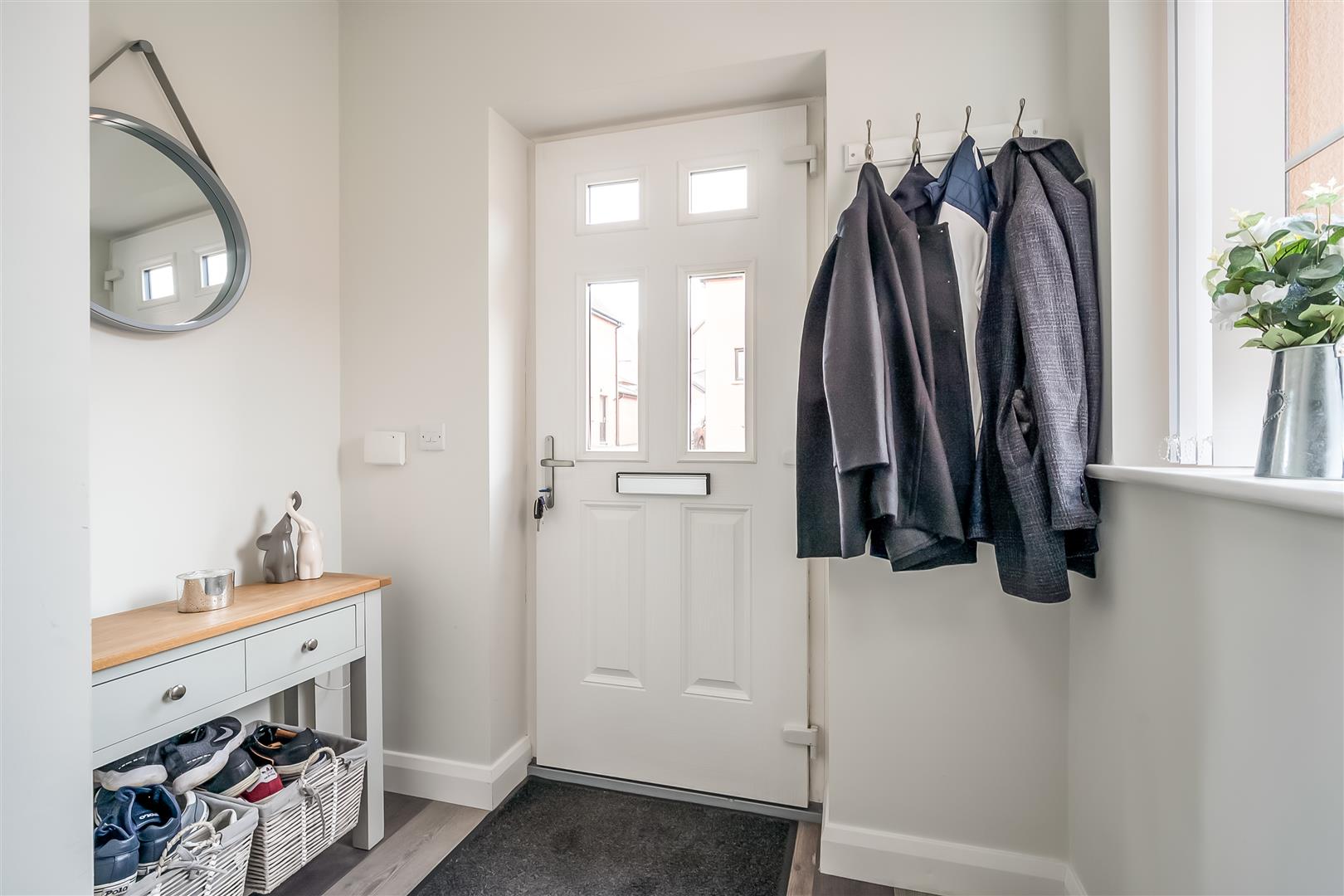 PVC double glazed composite front door. Stairwell to first floor. Alarm panel. Tiled floor.