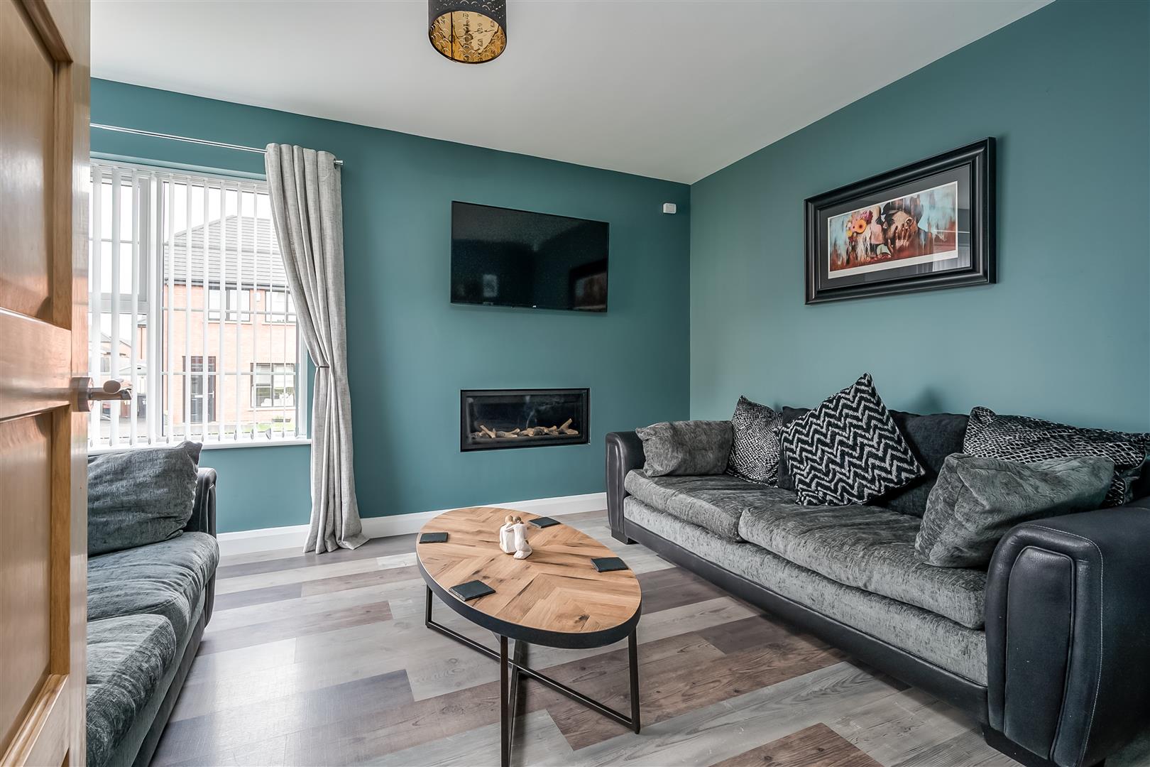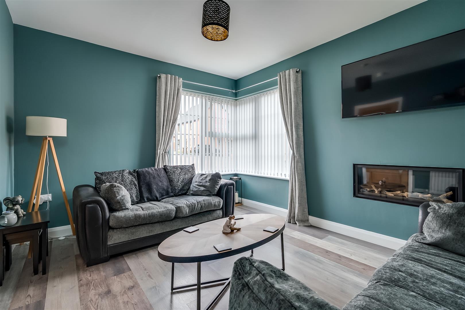 Focal point, wall mounted inlaid gas fire. Picture corner window. Wood laminate floor covering.