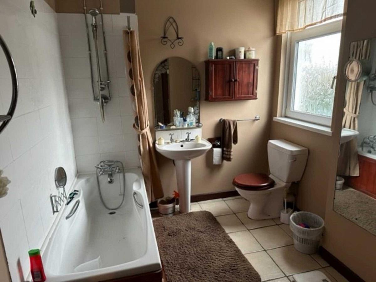 White suite comprising pine panelled bath with chrome mixer tap and telephone hand shower. Wall mounted thermostatically controlled shower fitting. Pedestal wash hand basin. Low flush WC. Tiled floor. Part tiled walls. Cupboard housing gas fired central heating boiler.