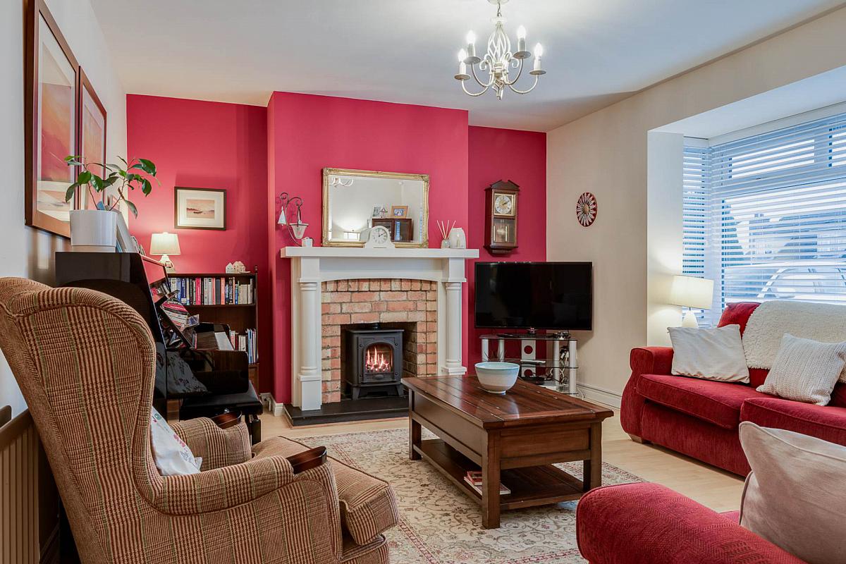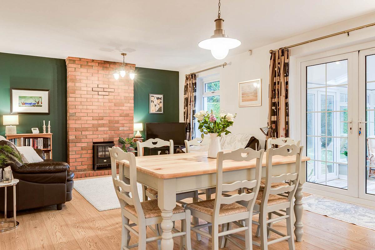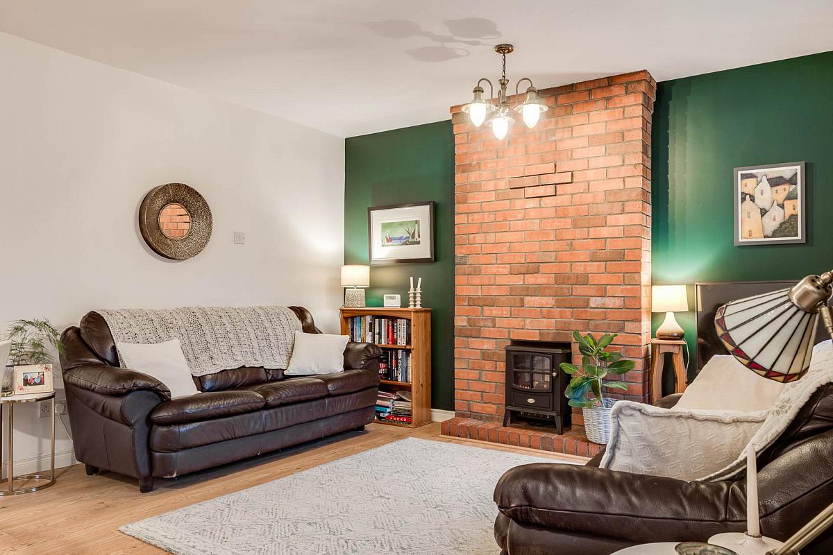 Feature brick fireplace with with electric stove. Laminate flooring. uPVC double glazed doors to sunroom.