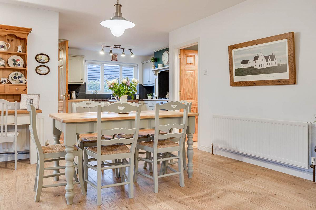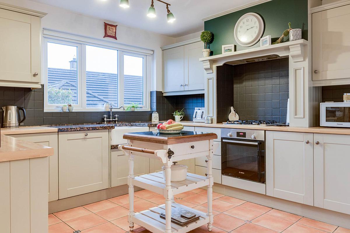 Excellent range of high and low level units with laminate work tops. Belfast sink set in feature granite work top with gold mixer taps. Integrated dishwasher. Bosch low level oven & Neff 4 ring gas hob. Part tiled walls and tiled floor.