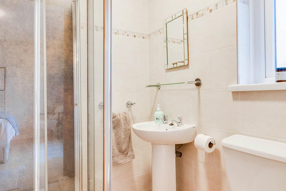 Walk in shower enclosure with chrome thermostatically controlled shower fitting. Glass Screen. Pedestal wash hand basin. Low flush WC. Chrome towel radiator. Fully tiled walls and floor.
