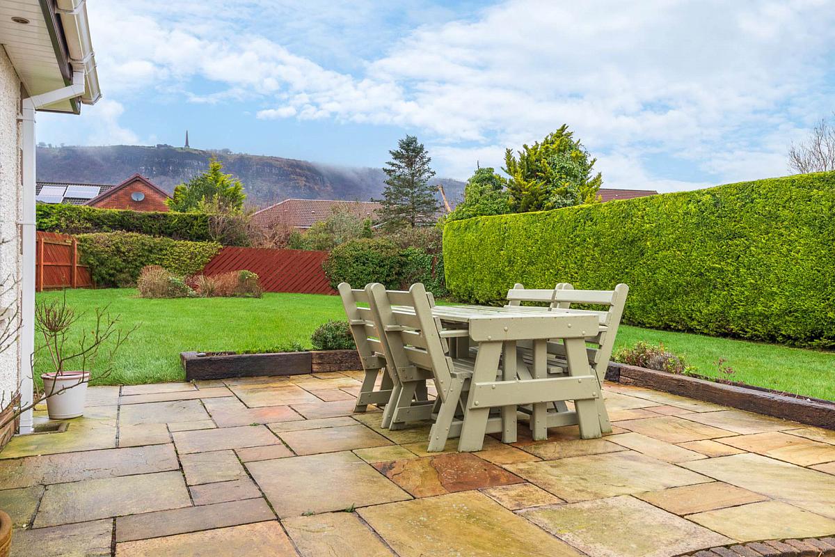 Front: Laid to lawn. Stoned driveway with ample parking for several cars. Fully enclosed spacious rear garden with patios area,raised flower beds & lawn bounded by fence and hedging.