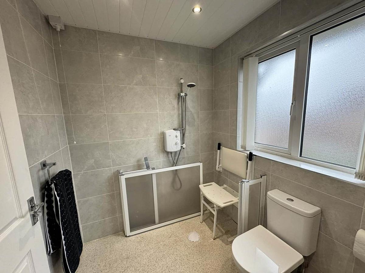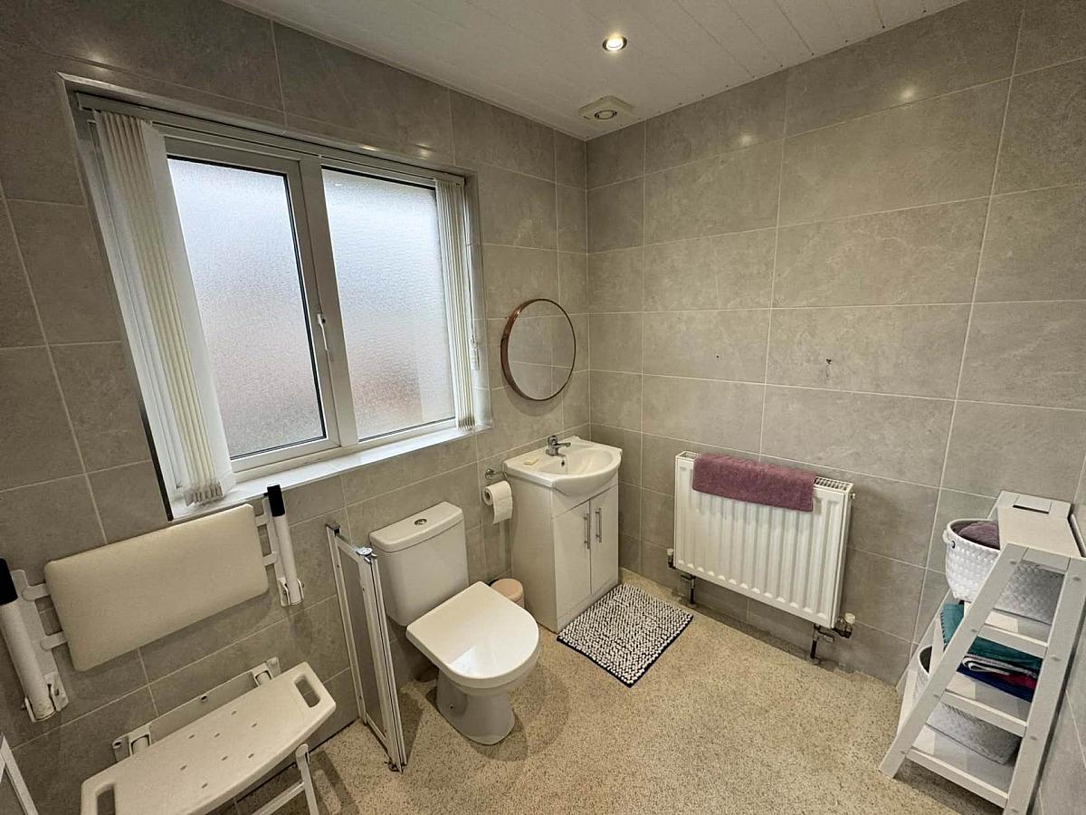 Wet room with 'Triton' wall mounted electric shower fitting. Low flush WC. Vanity sink unit with mixer tap. Fully tiled walls. UPVC clad ceiling with recessed lighting.