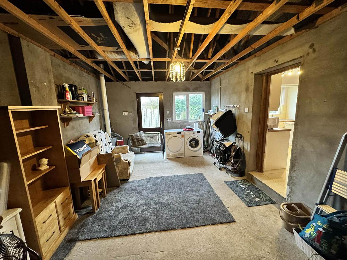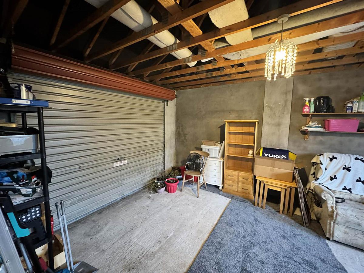 Metal roller door, light and power. Plumbed for automatic washing machine. Wooden door to garden. Oil fried central heating boiler.