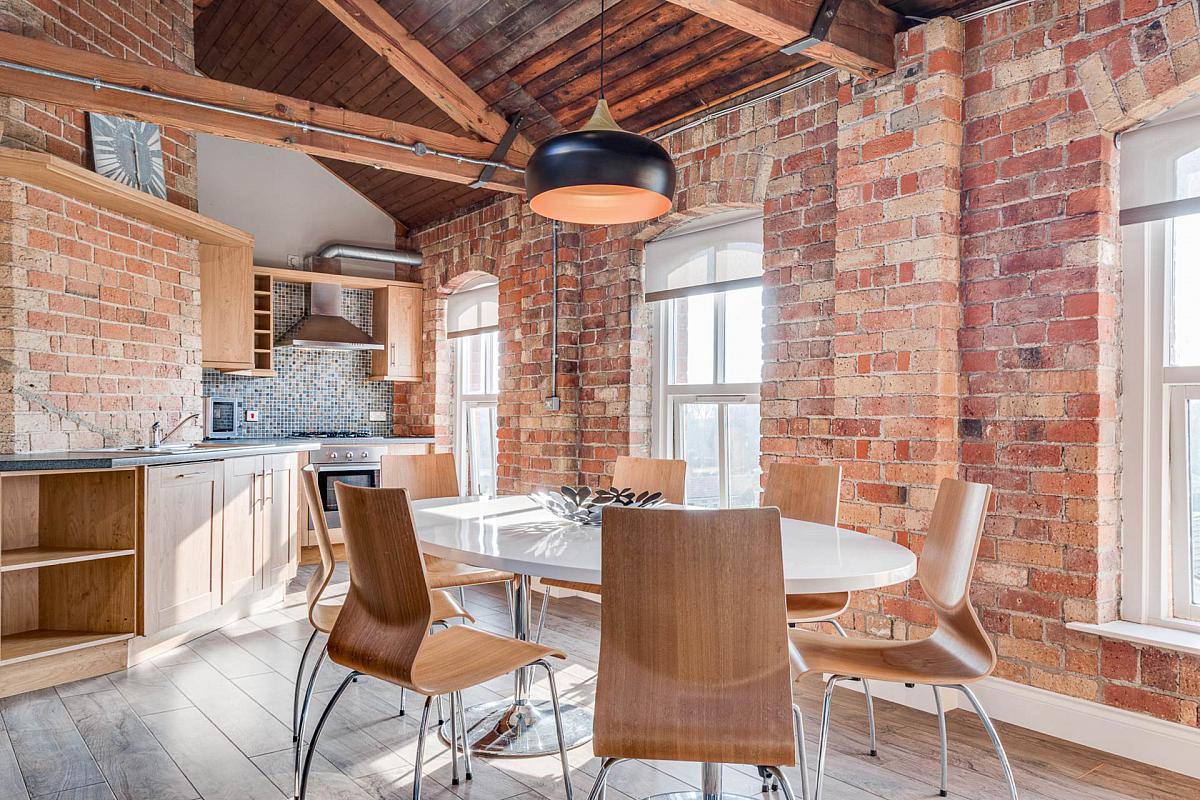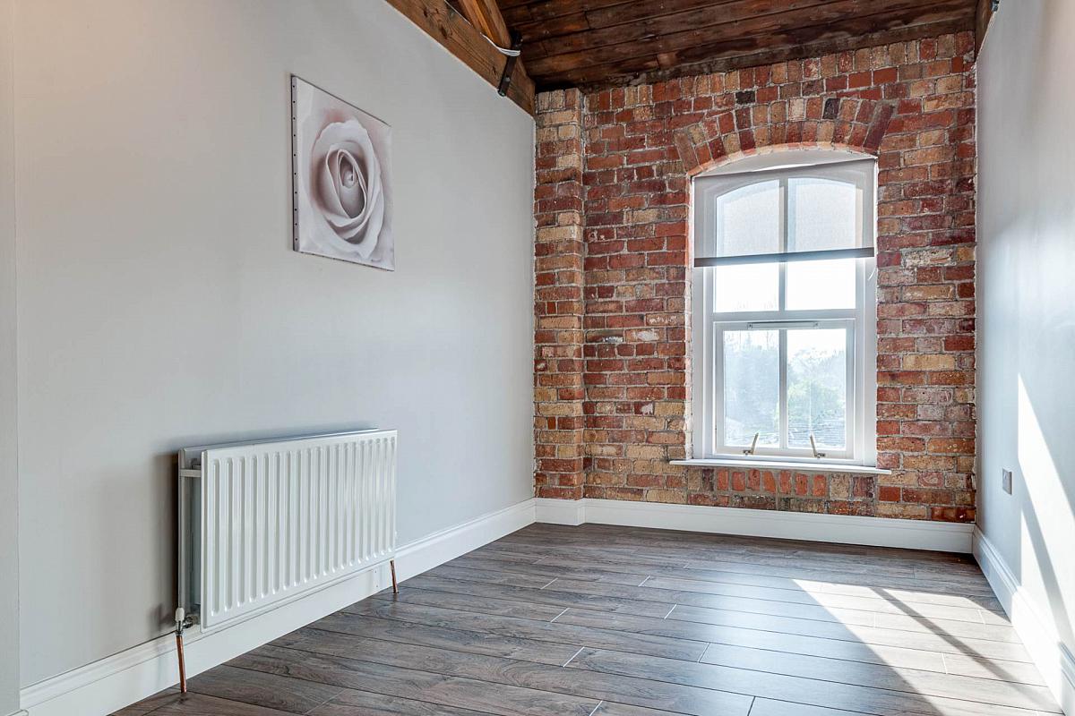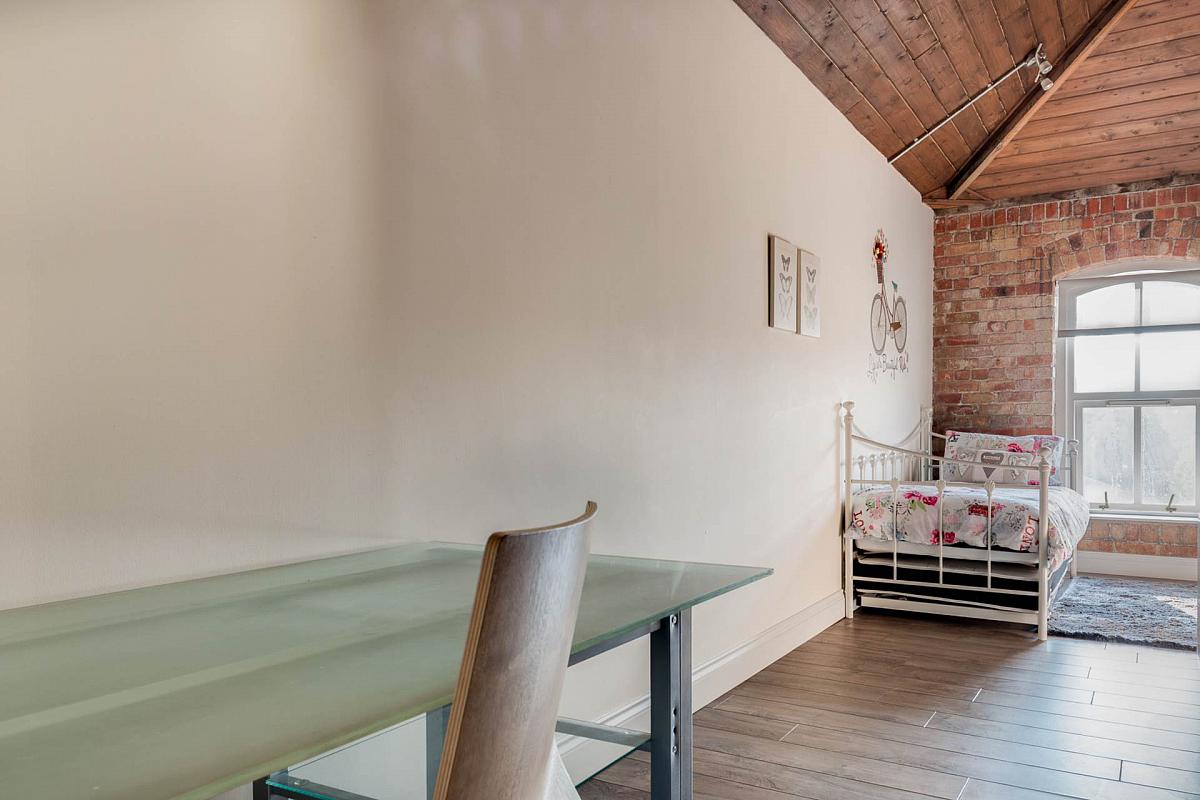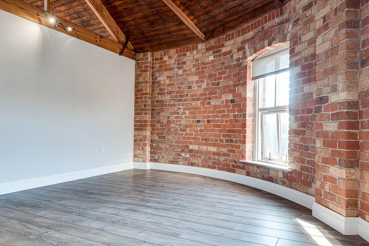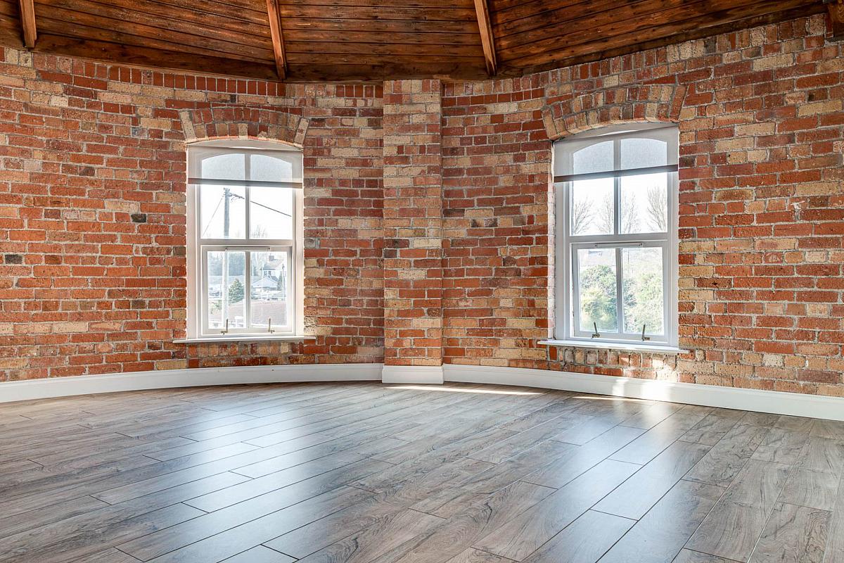 Exposed brick wall. Timber clad ceiling. Original mill chimney feature.