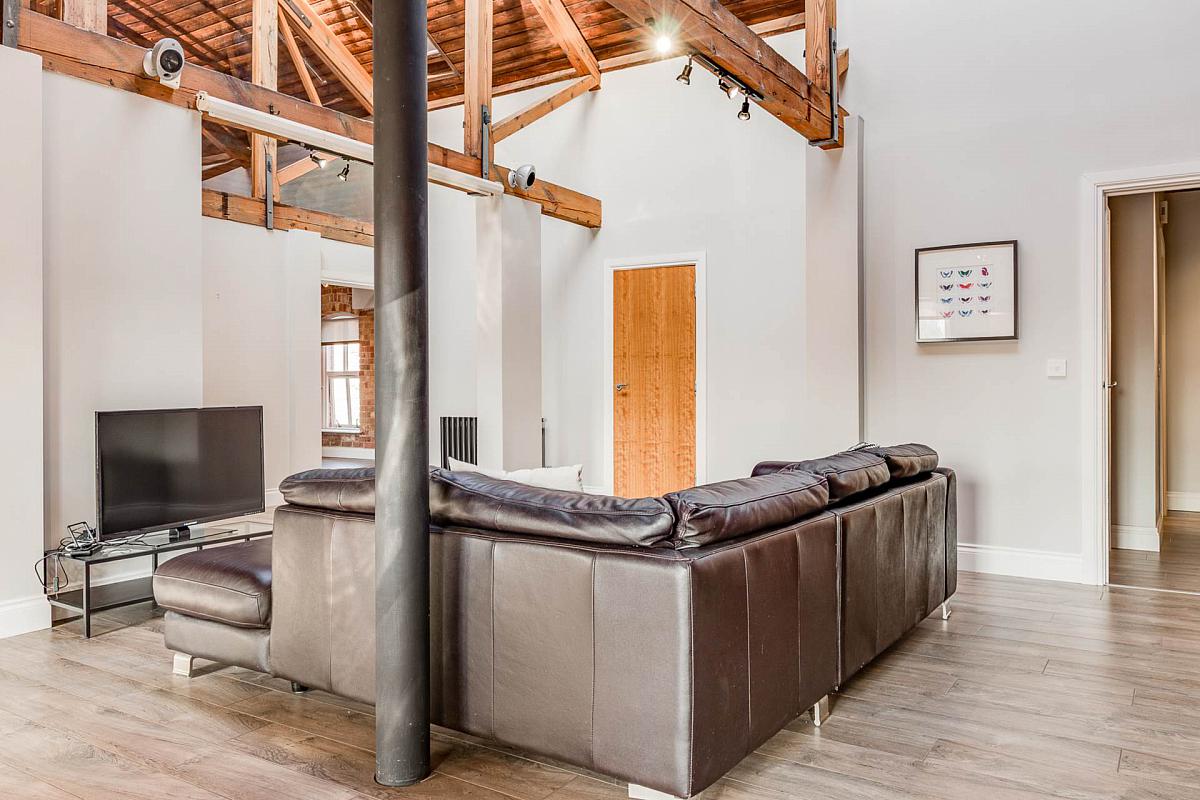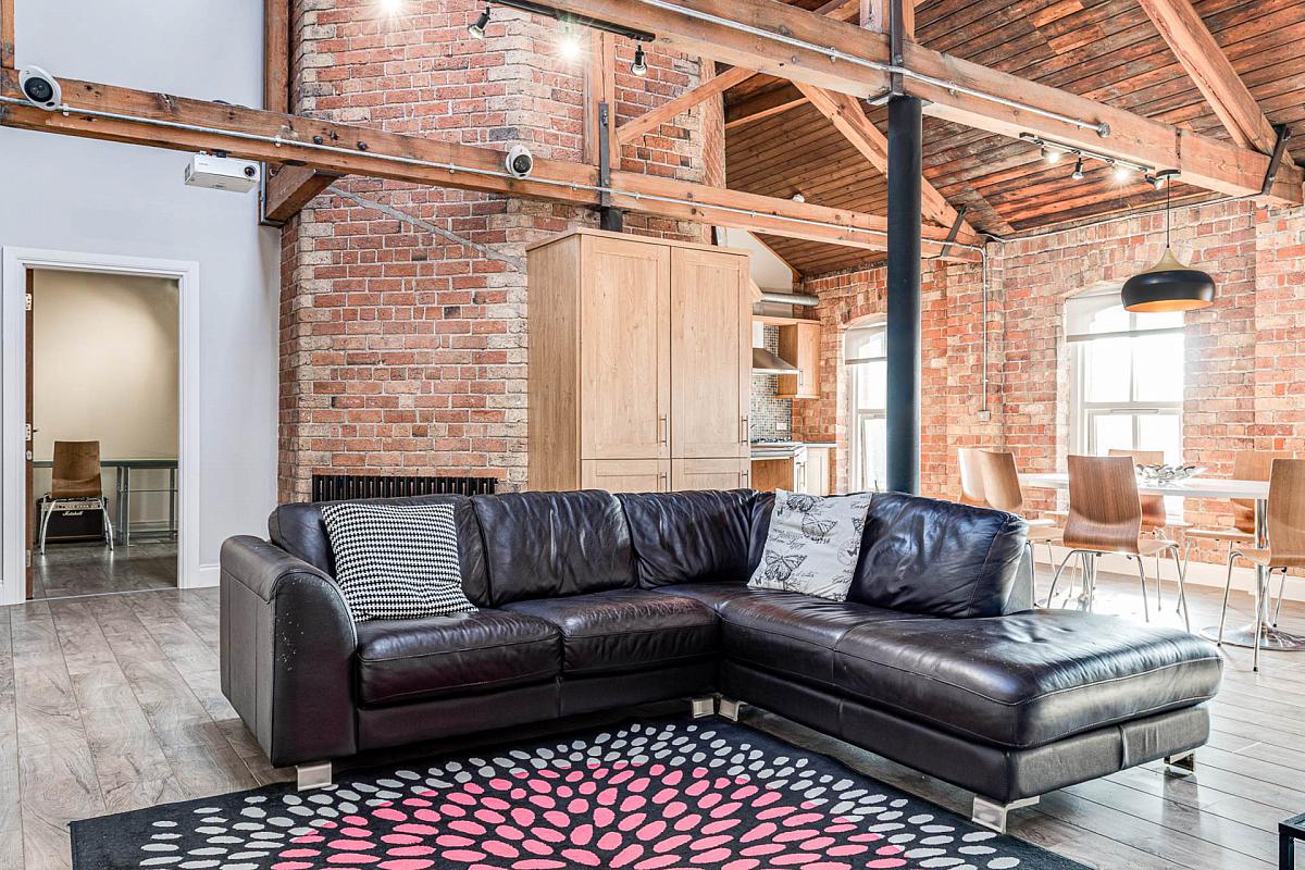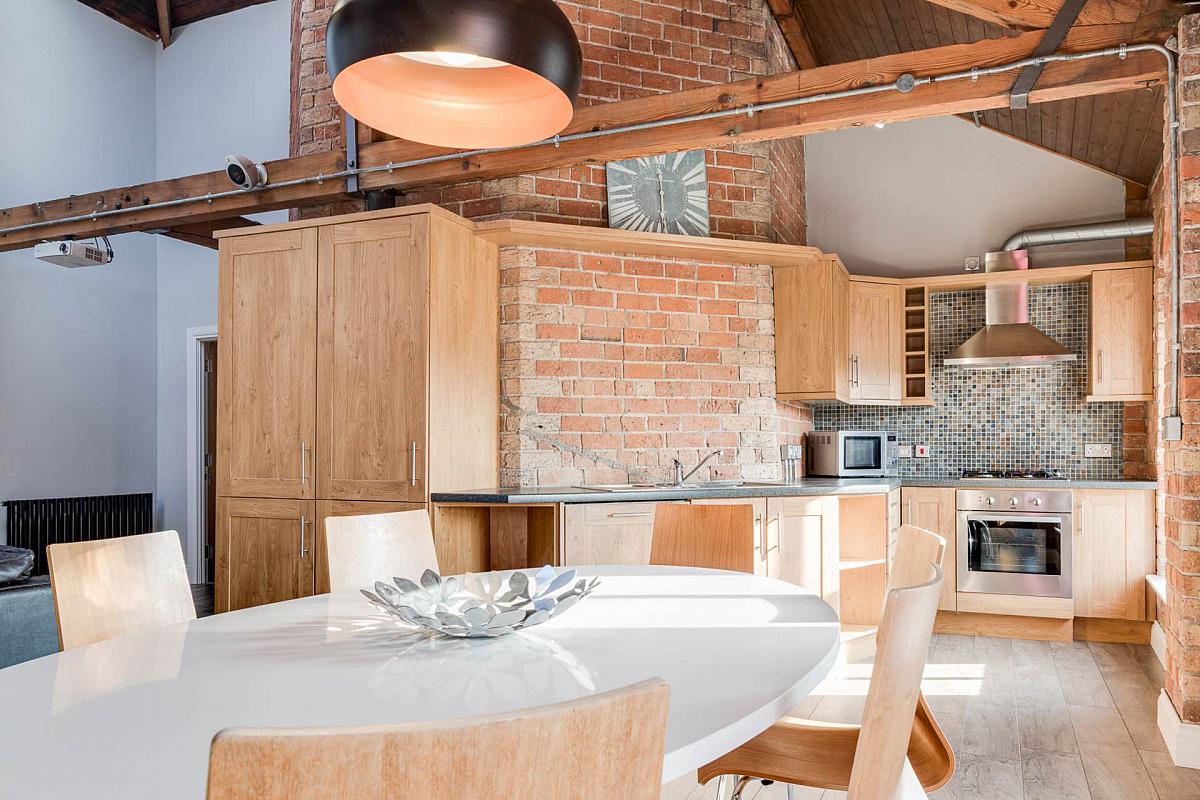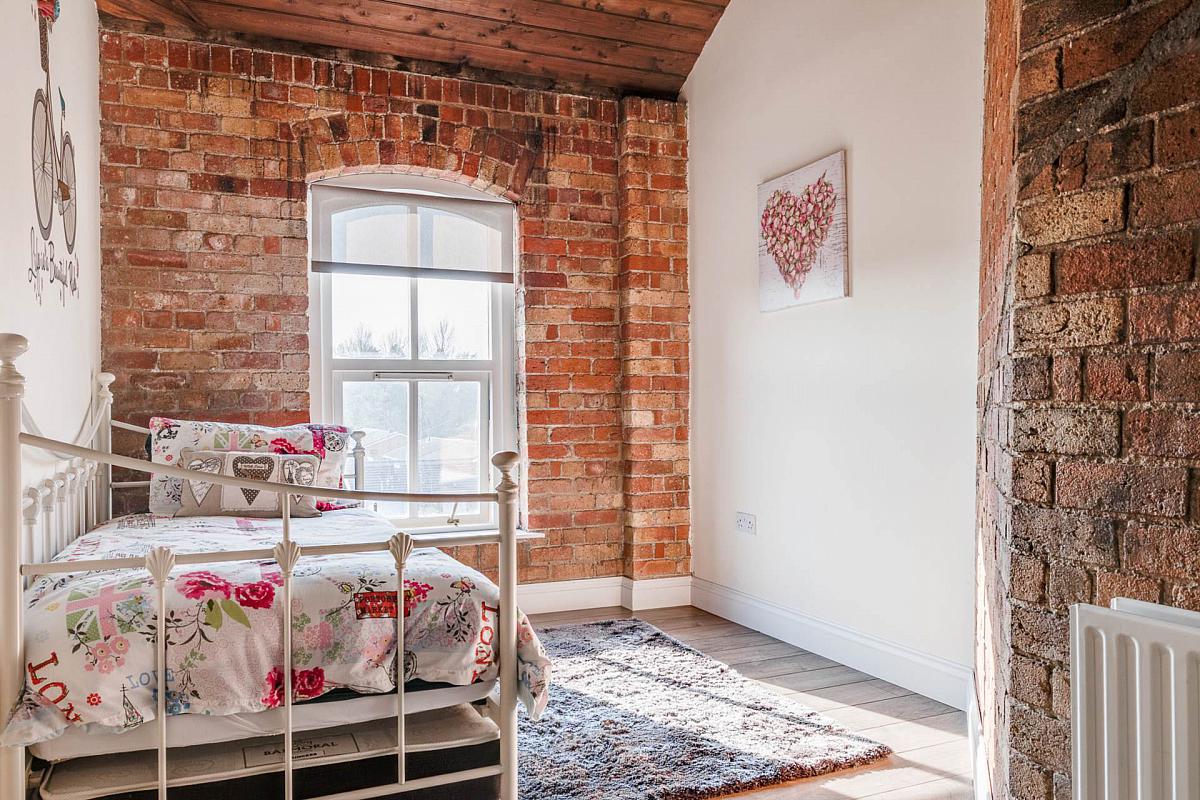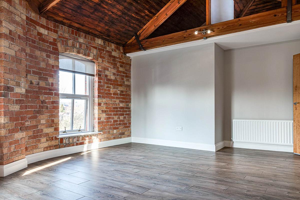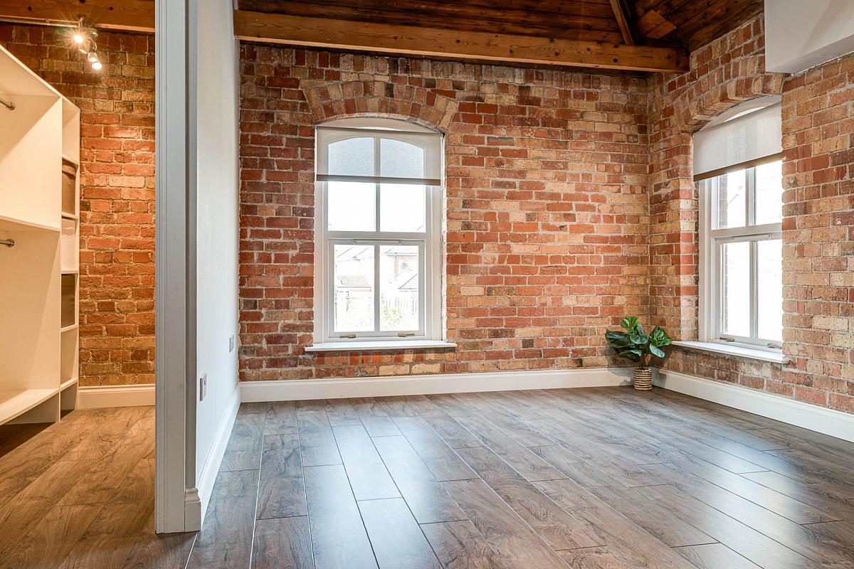 Exposed brick wall. Timber clad ceiling. Original mill chimney feature.