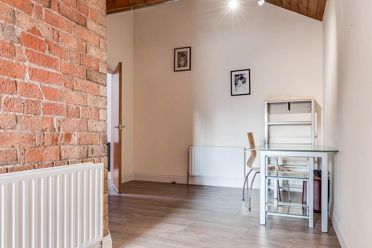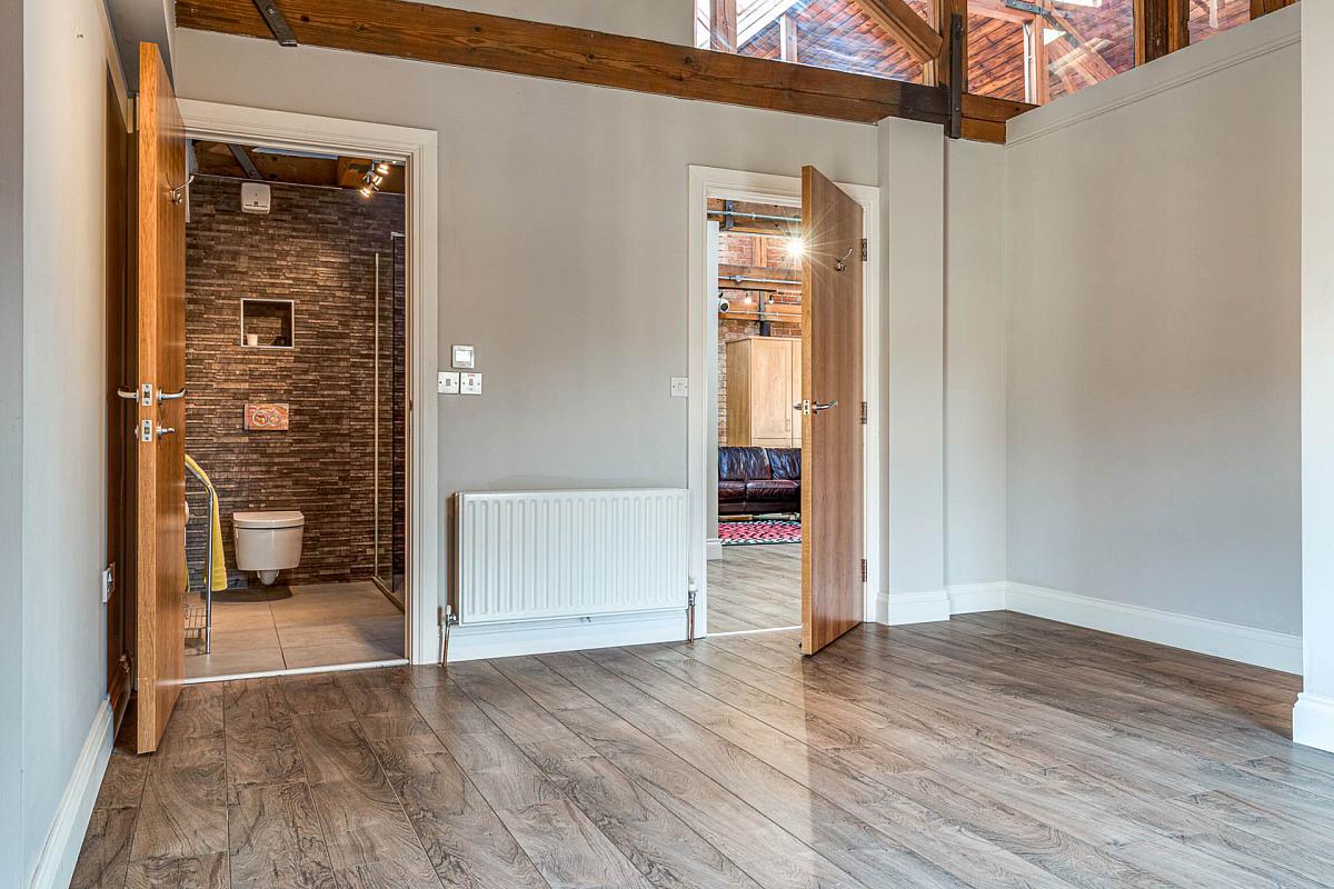 Exposed brick wall. Timber clad ceiling. Walk-In dressing room. Stunning modern ensuite shower room with high quality fixtures and fittings comprising low flush WC, vanity unit and tiled corner shower cubicle with shower screen. Tiled walls and floor featuring underfloor heating. Velux window.