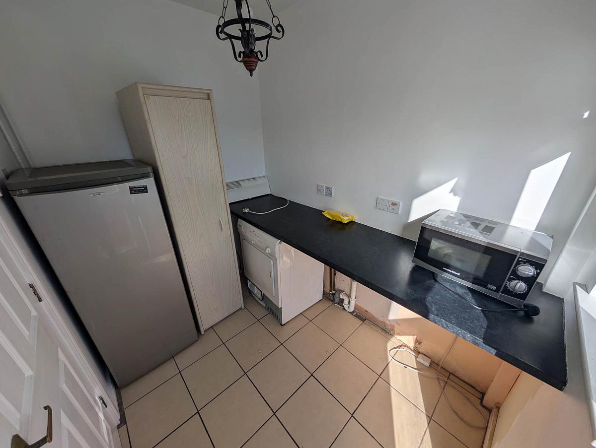 Laminate worktop. Plumbed for automatic washing machine. Tiled floor. Double glazed door to garden.