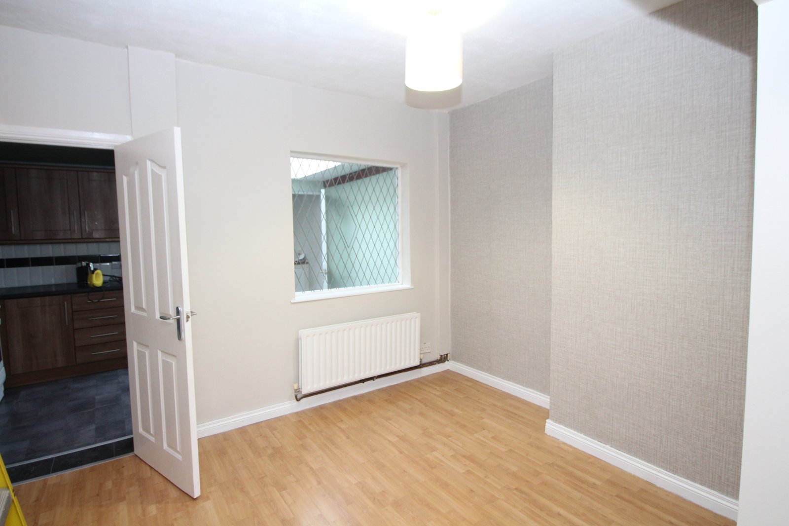 Range of high and low level units with formica work surfaces. One and half bowl stainless steel sink unit with mixer tap. Washing machine, cooker and fridge freezer. Stainless steel extractor fan. Part tiled walls. Laminate wood flooring.
