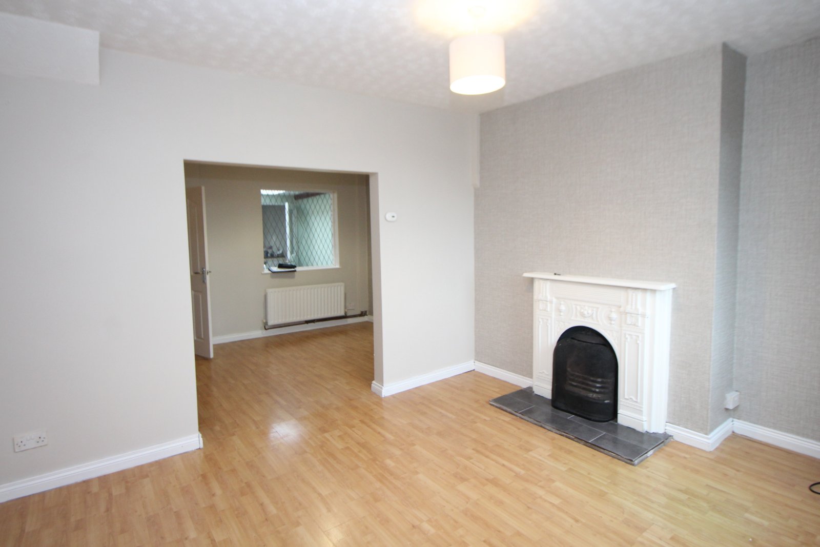 Cast iron fireplace with slate hearth and open fire. Laminate wood flooring. Arch to dining area.